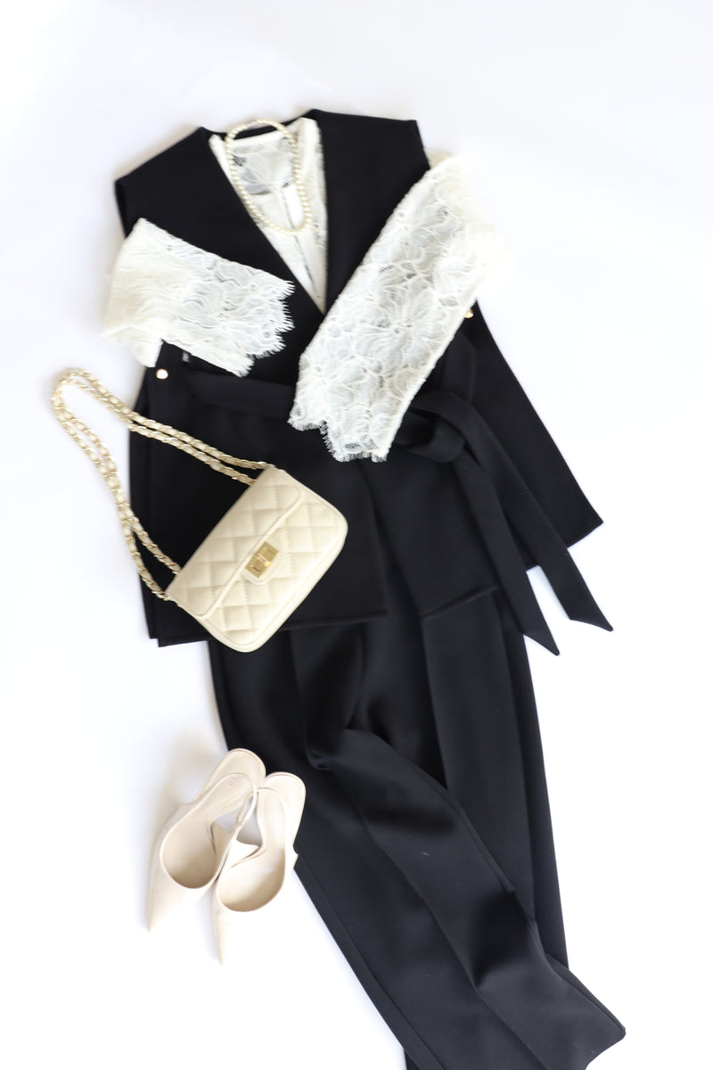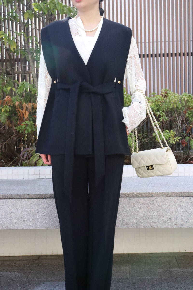 インナーにはレースアイテムを仕込んでおり、トレンド感もばっちりの大人セレモニーコーデです。