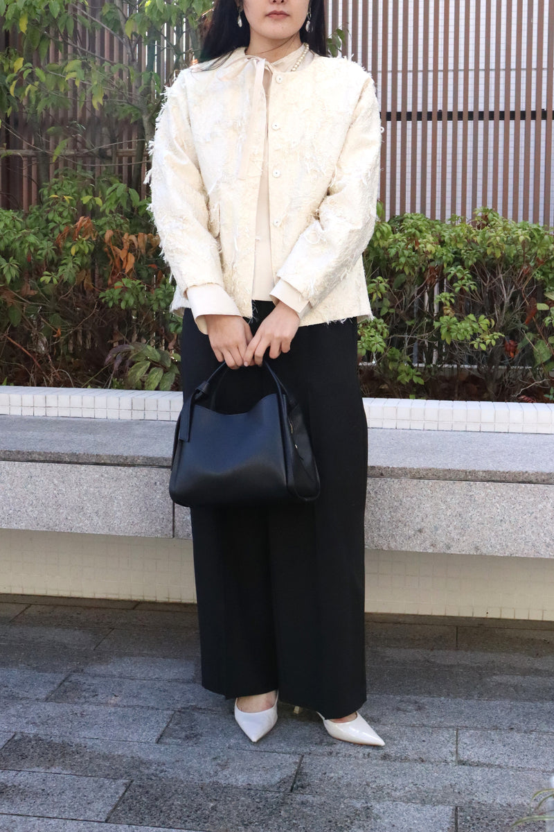 高級感のあるカットジャガードのジャケットにボウタイのブラウスを合わせました。