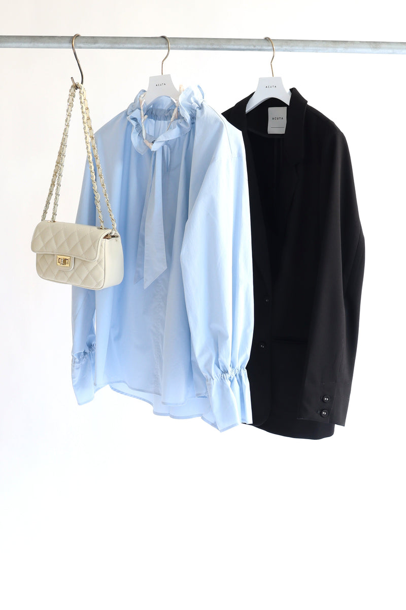 ブラウスは、ボウタイ&衿元のフリルで華やかさ抜群。綺麗色が気分を上げてくれます。