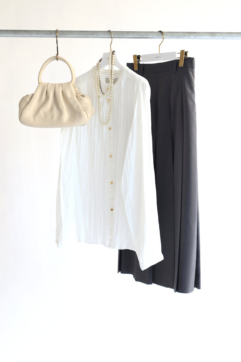 割繊生地にワッシャーをかけたブラウスと、ワイドプリーツが印象的なスカートの合わせ。