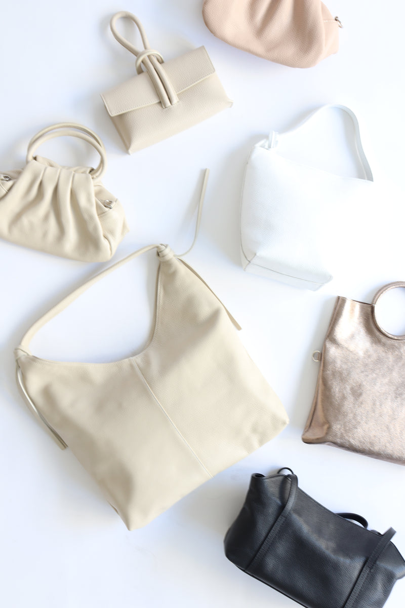 バッグは上品ながらも遊び心のあるタックハンドバッグです。