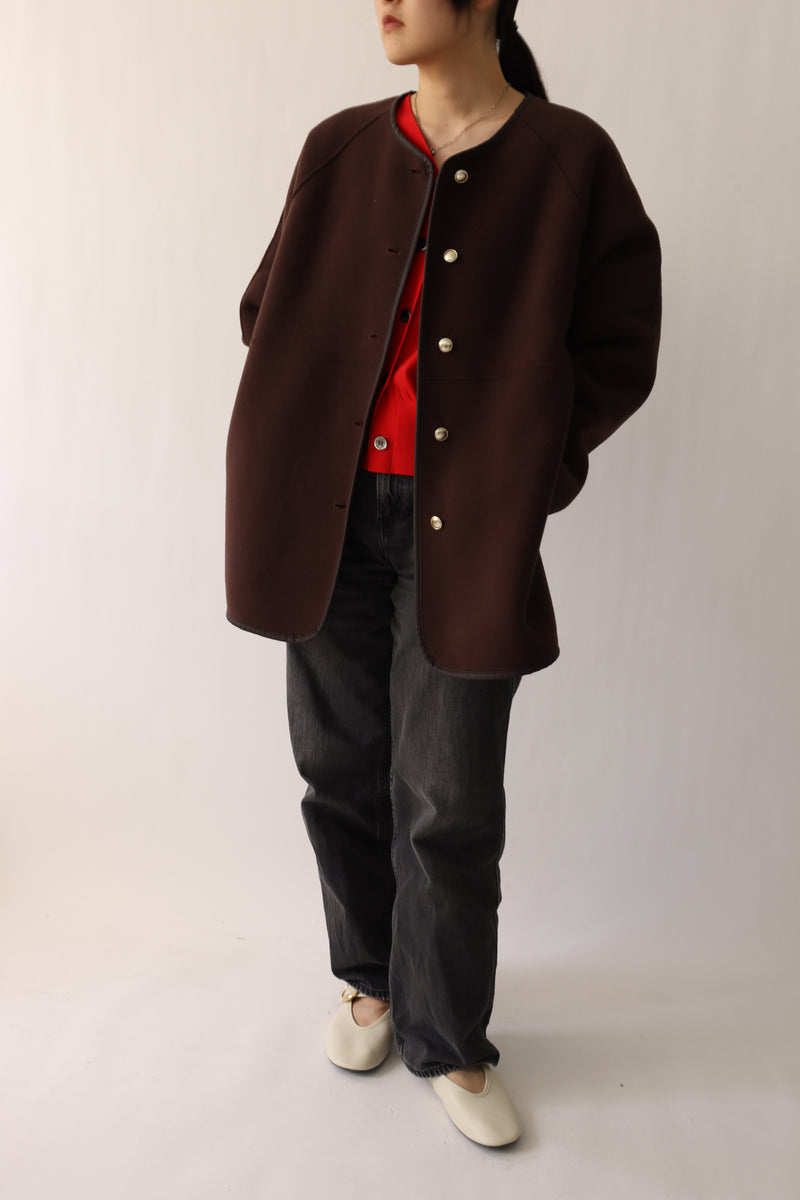 丸みのあるシルエットやボアのふんわりとした素材感が見た目にも暖かく、華奢なリングボタンを使用。