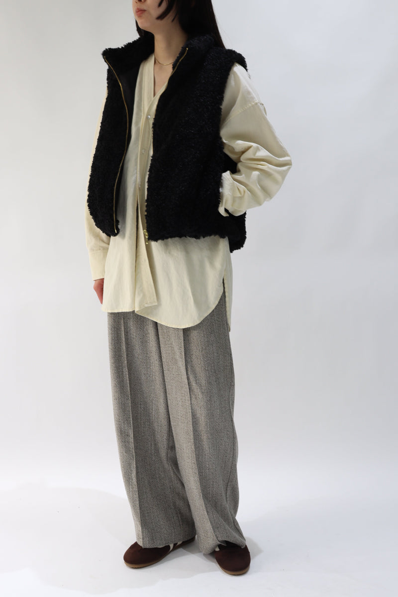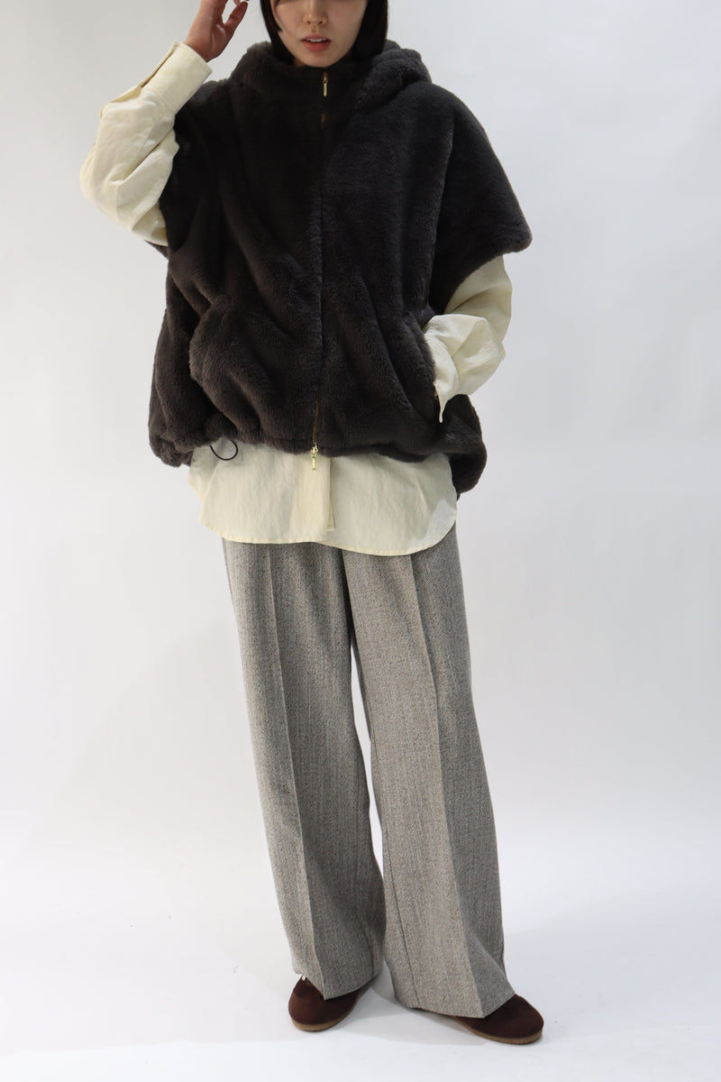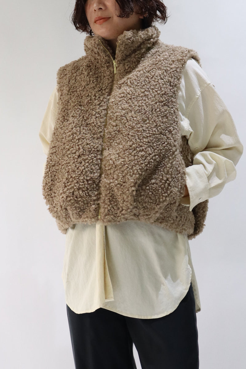 今季のトレンドアイテムでもあるファーベスト。裾にたっぷりとタックを入れた美フォルムと、軽く柔らかいプードルボアを使用した、見た目にも可愛さとぬくもりを感じるアイテムです。