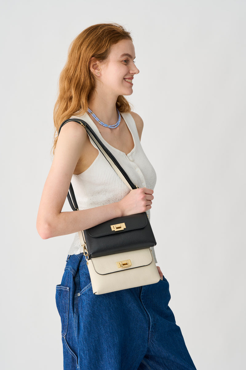 このサイズ感が欲しかった!とのお声も多数のミディバッグがトライアングルデザインで新登場。大きすぎずに実用性が高く、財布やスマートフォン、コスメなどの必需品がしっかり収まります。肩掛けもできるのもうれしいポイント。