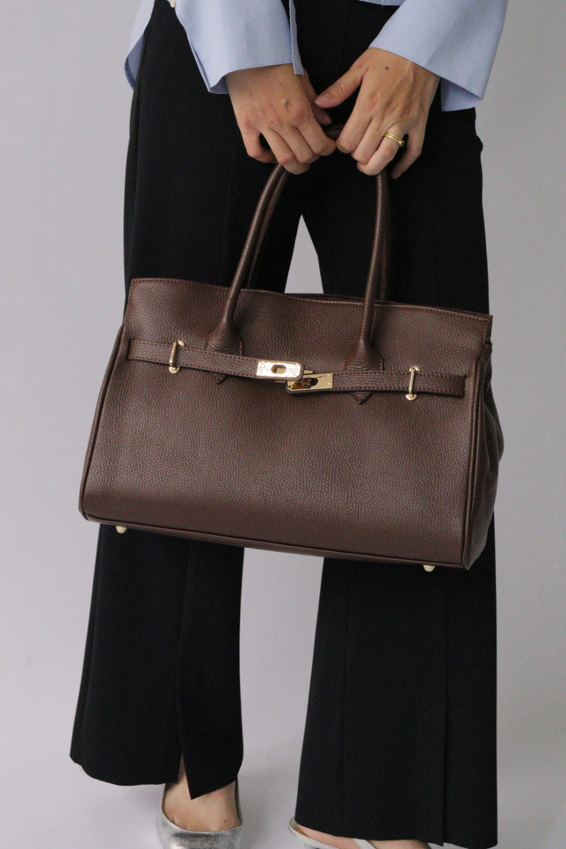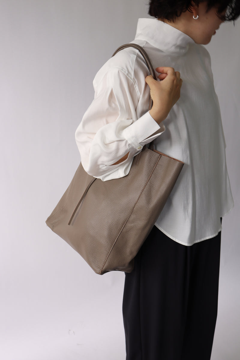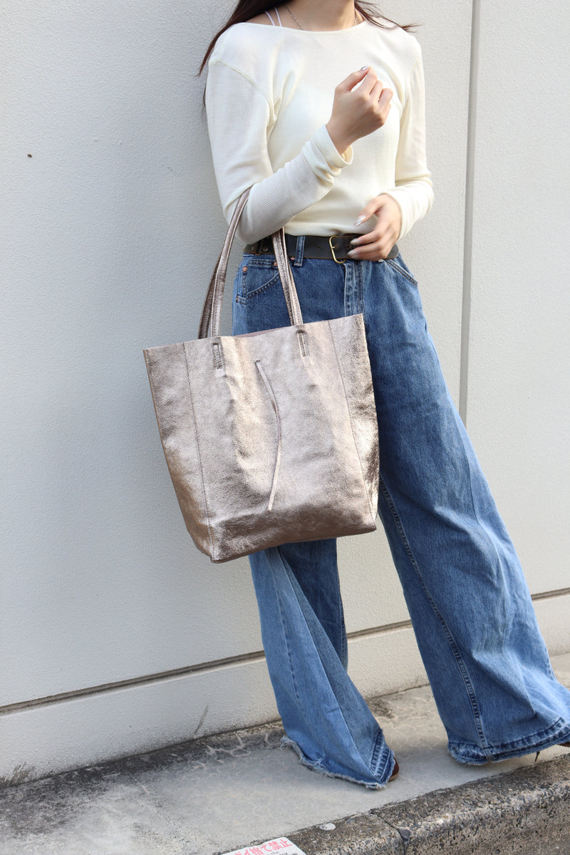 ゴールドの金具とベルト使いがリッチ感のあるトートバッグ。シュリンクレザーの風合いが大人のカジュアルスタイルに品の良さをプラスしてくれます。