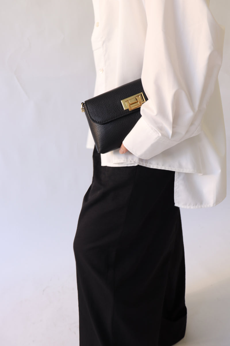 ゴールドの金具がアクセサリー感覚で持てるミニバッグ。