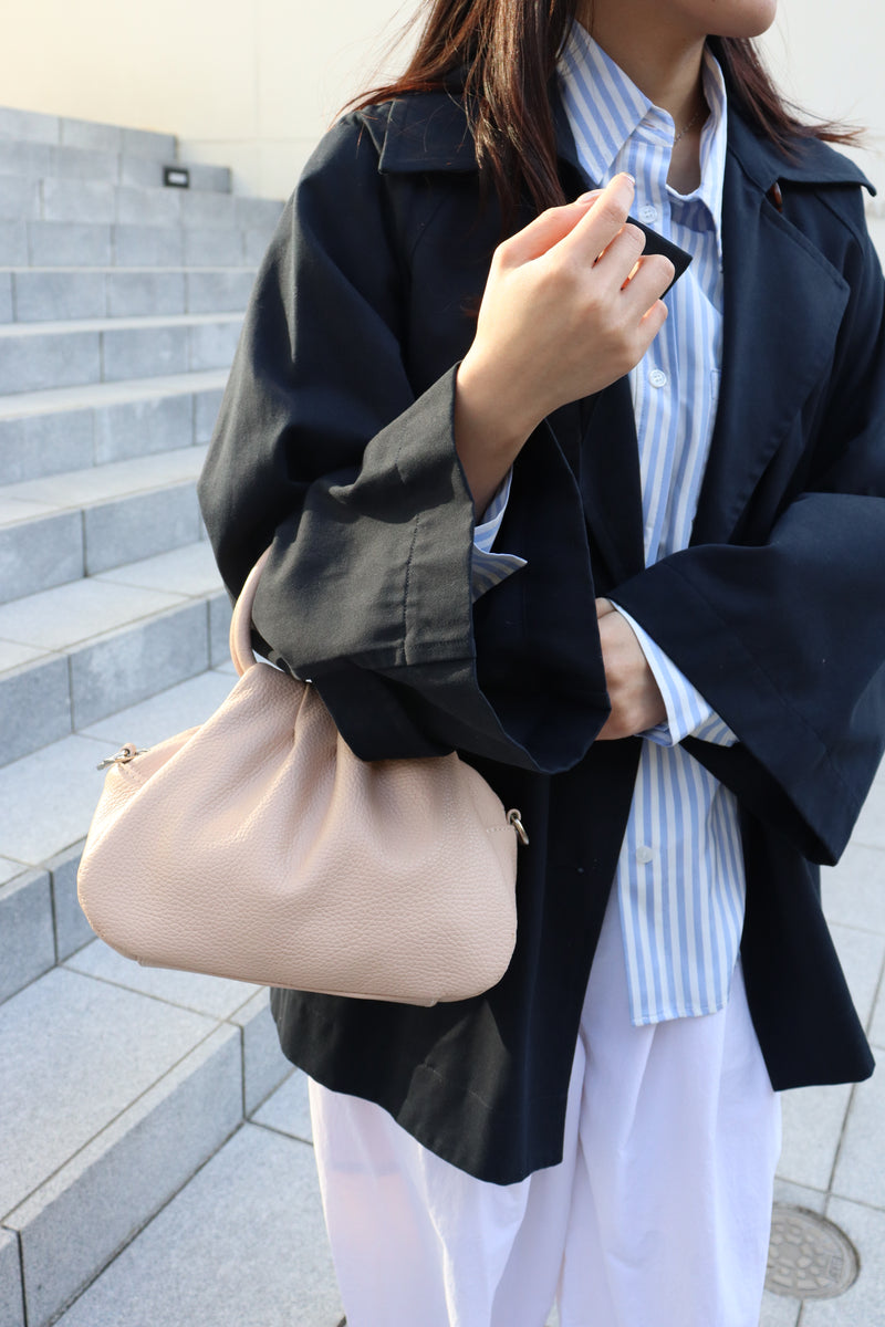 ころんとした丸みのあるフォルムとタックが立体的な形を際立たせたバッグ。ショルダーストラップで2WAY仕様が可能。マチ幅も広く、内外に取り付けたポケットが荷物を綺麗に納められ、機能性も◎