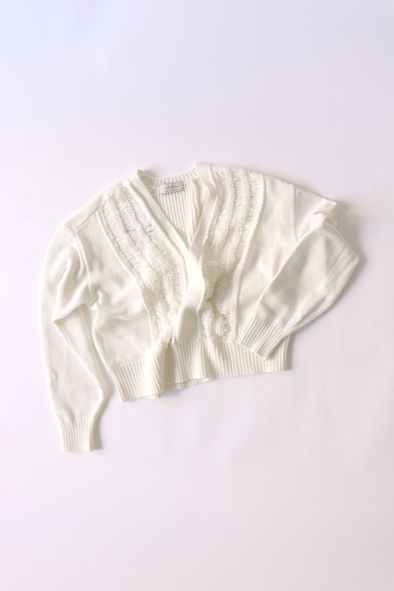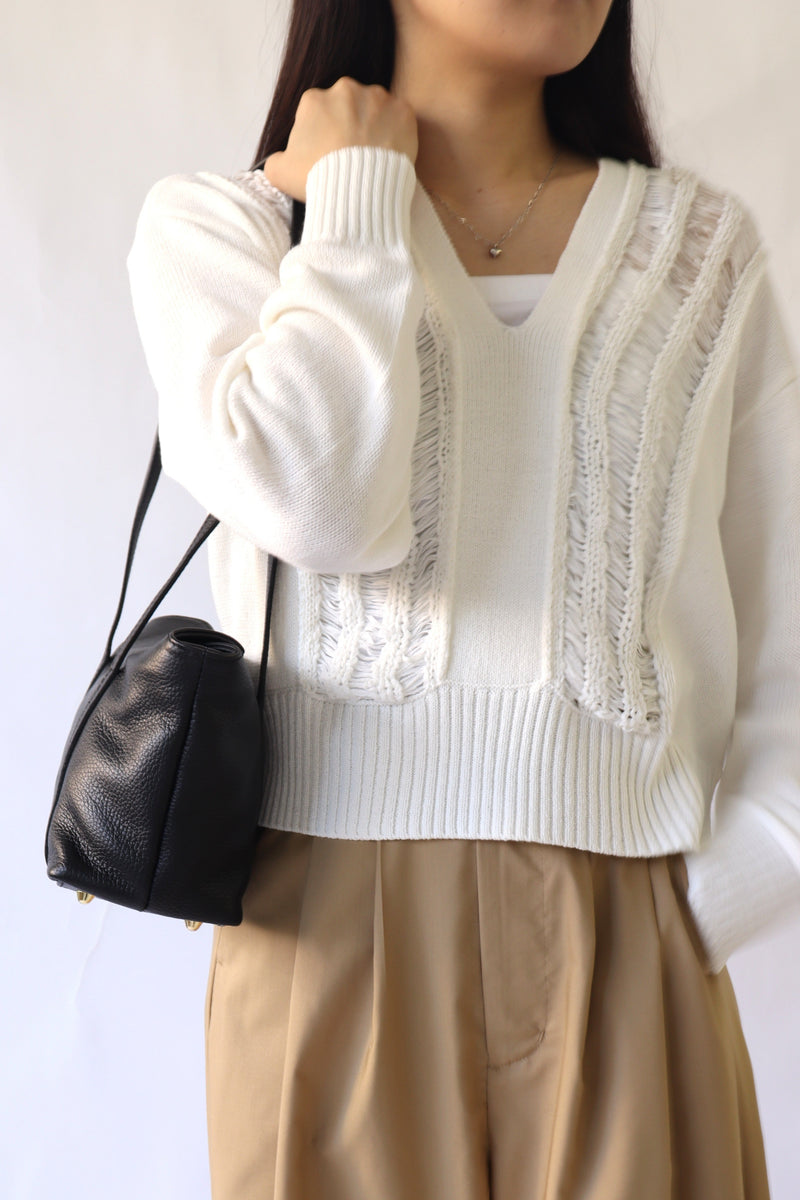 前中心にはドライブ編みというデザイン性の高いの編地、後身頃は編地切り替えが入っており、新しくワードローブに取り入れたい春ニットに仕上げました。
