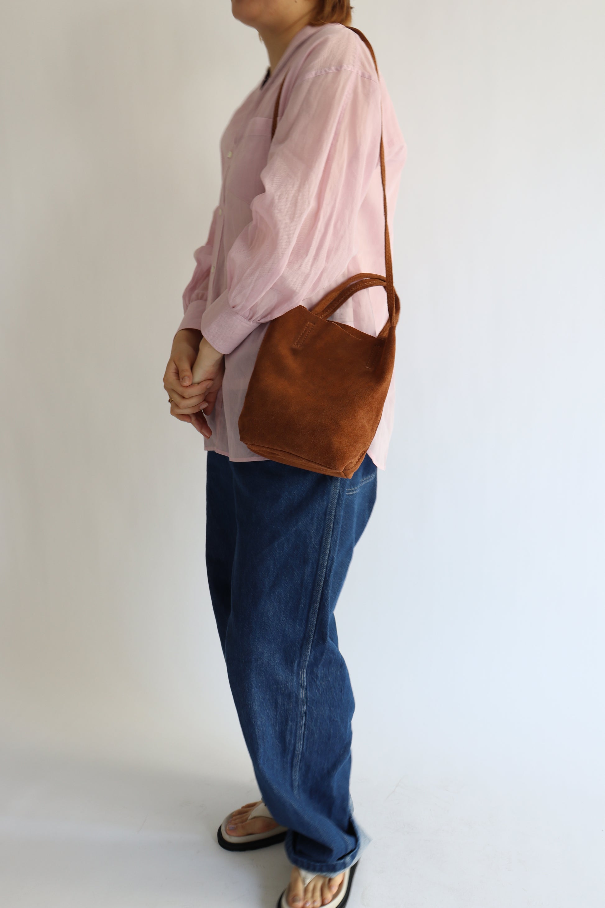 金具を使わず、シンプルでスタイリングを選ばない佇まいで、気負わずに使えるおすすめアイテムです。ブラウンはスエードならではの粗野な雰囲気がありながら、プラスするだけで旬なムードが際立ちます。
