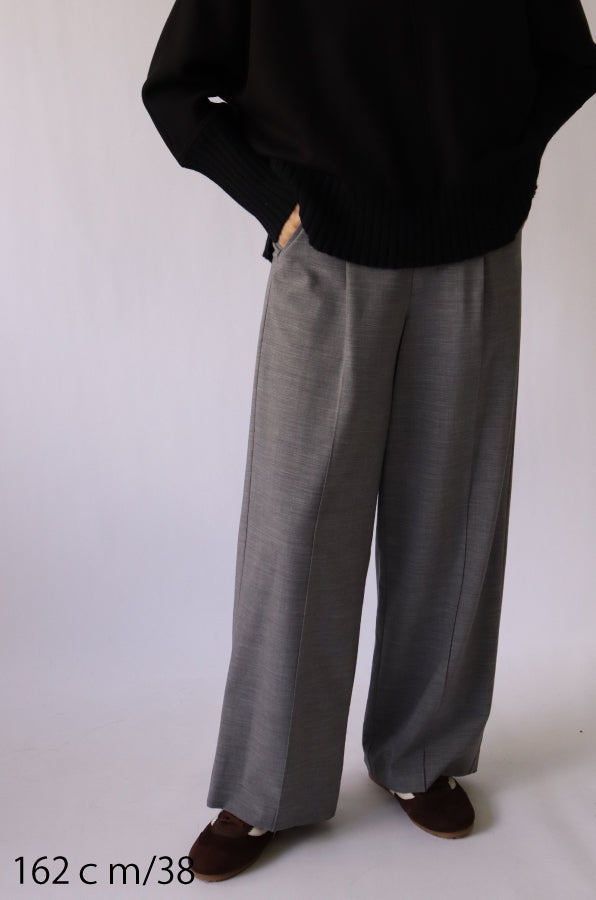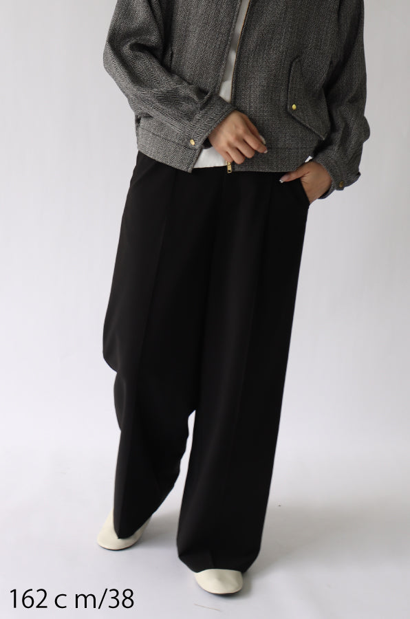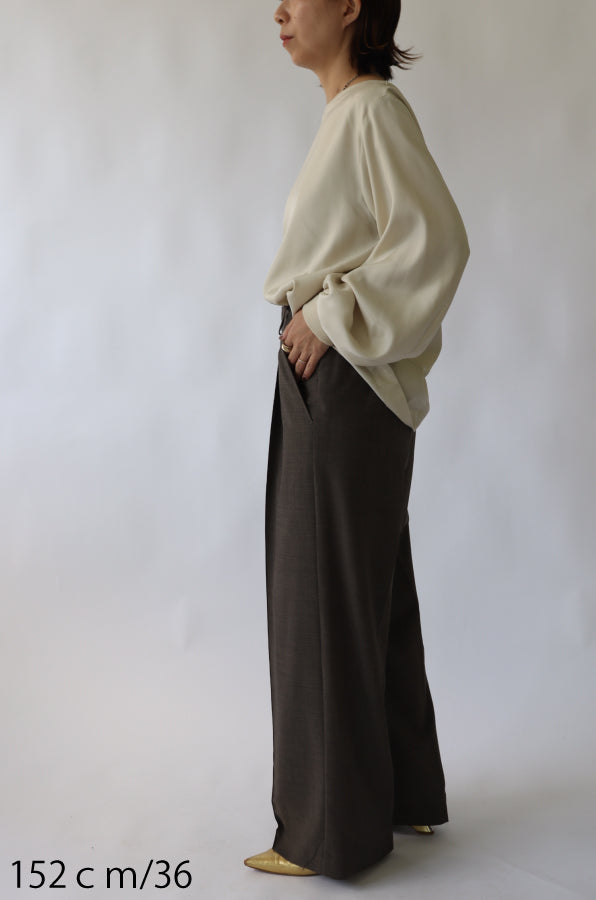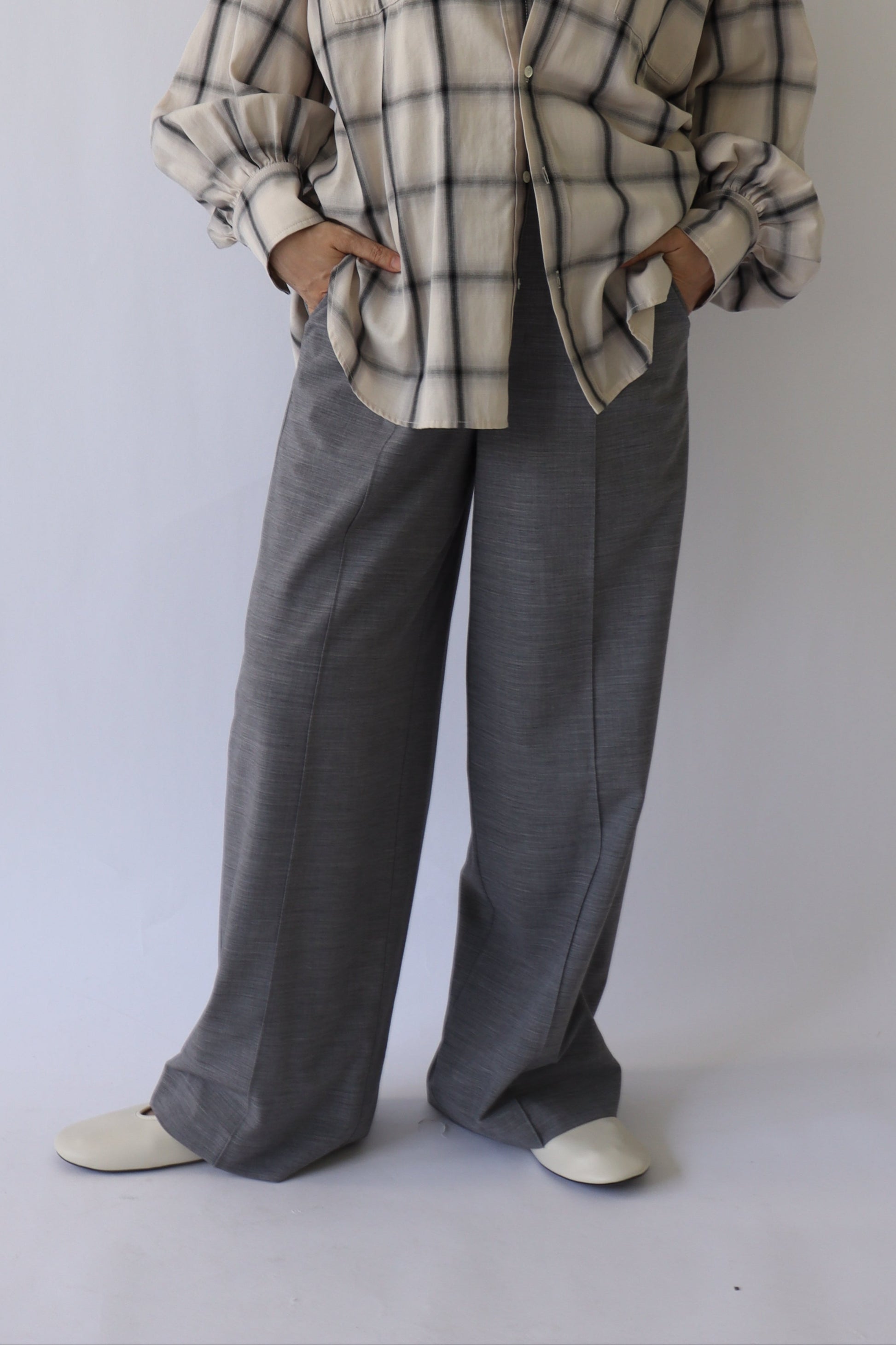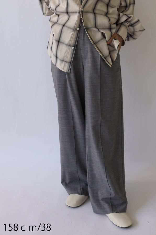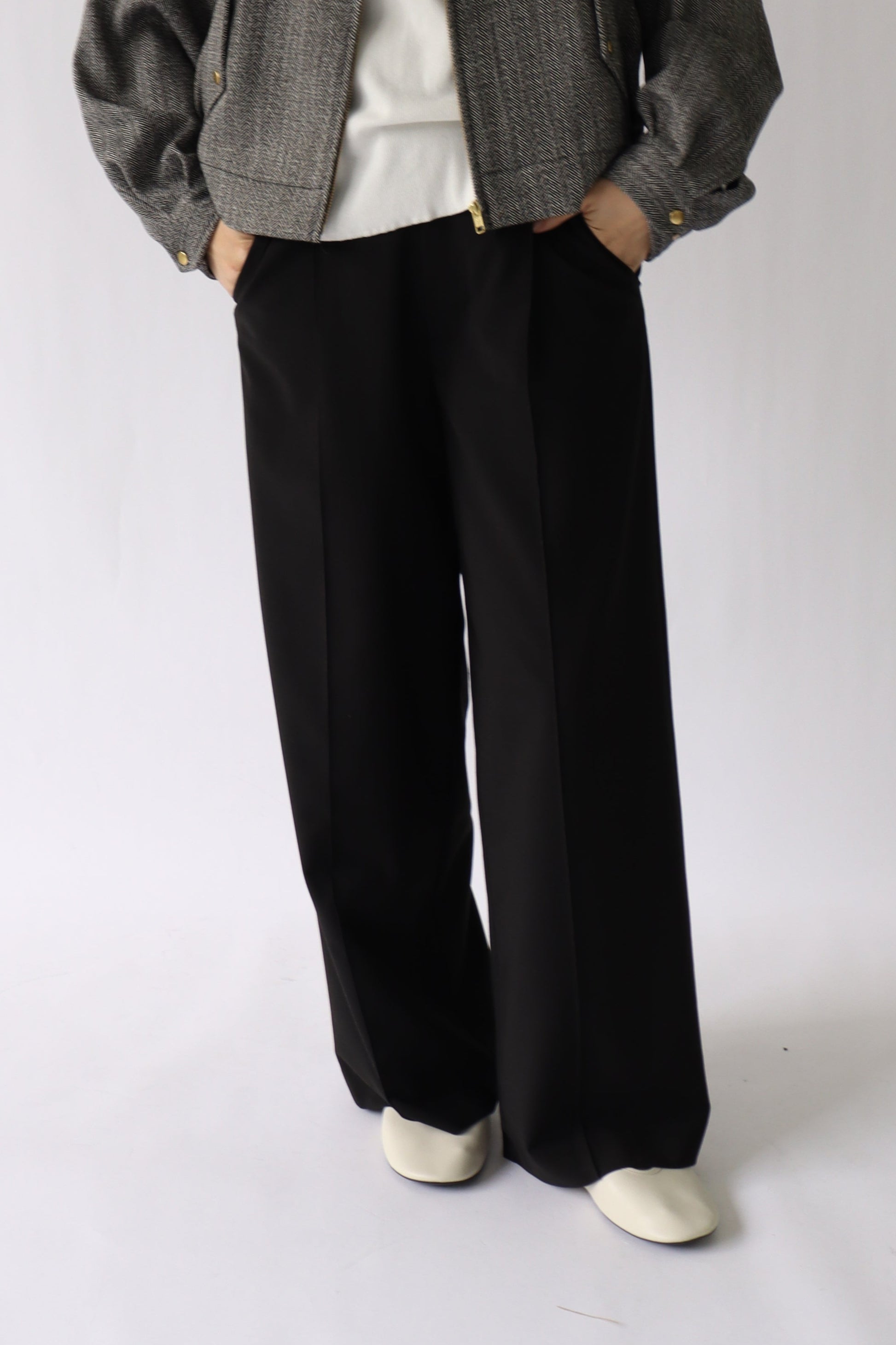 後ろウエストにはゴム入りで、リラックスした履き心地かつフロントにピンタックを施し、Iラインを強調した美シルエットなパンツ。ウールとレーヨン混で柔らかなタッチで高級感のある表面感の素材を使用し、オンオフ両用で着まわせるのでワードローブにあると便利な一本です。