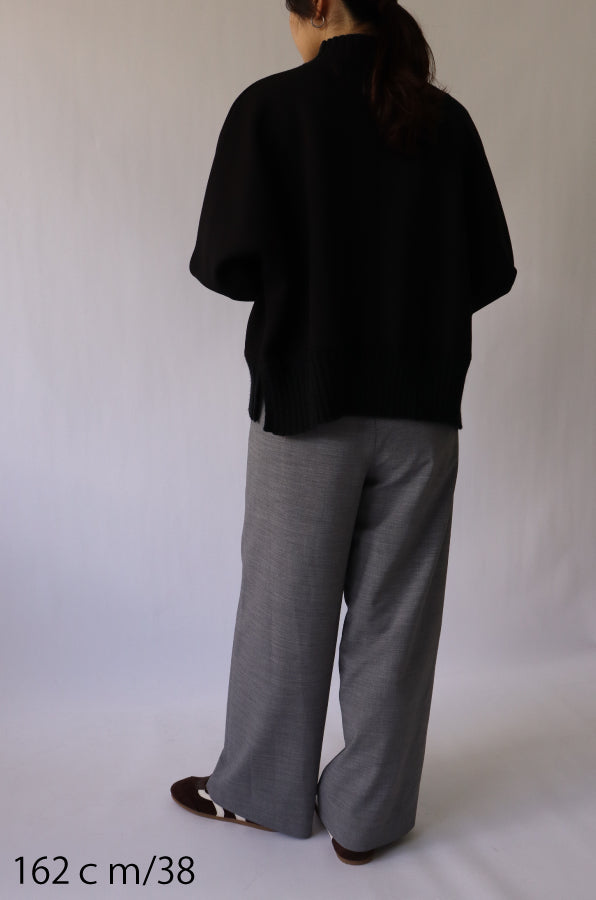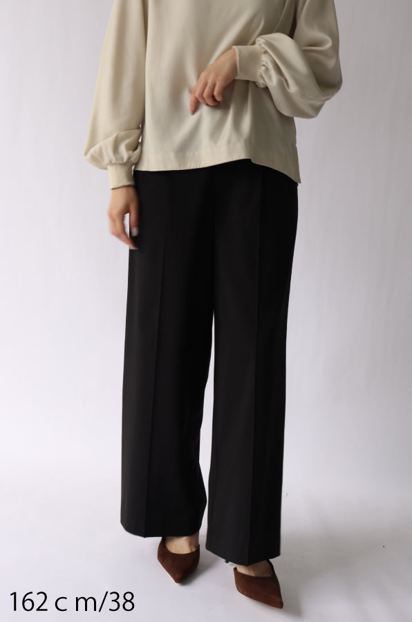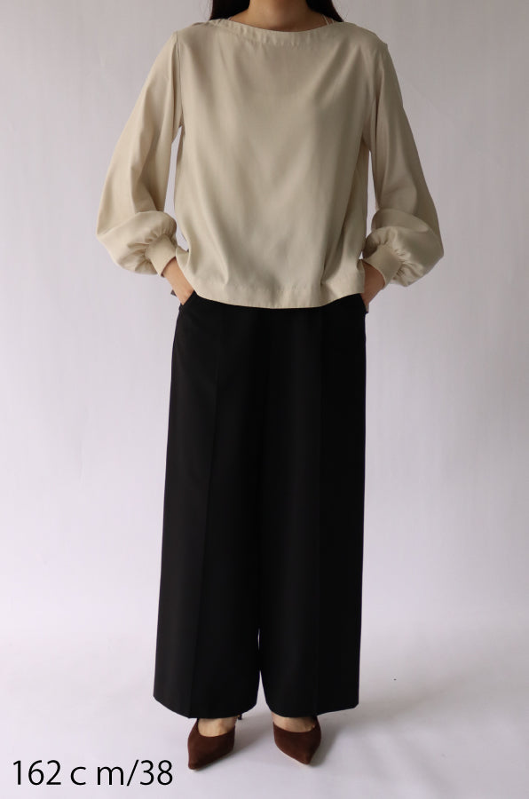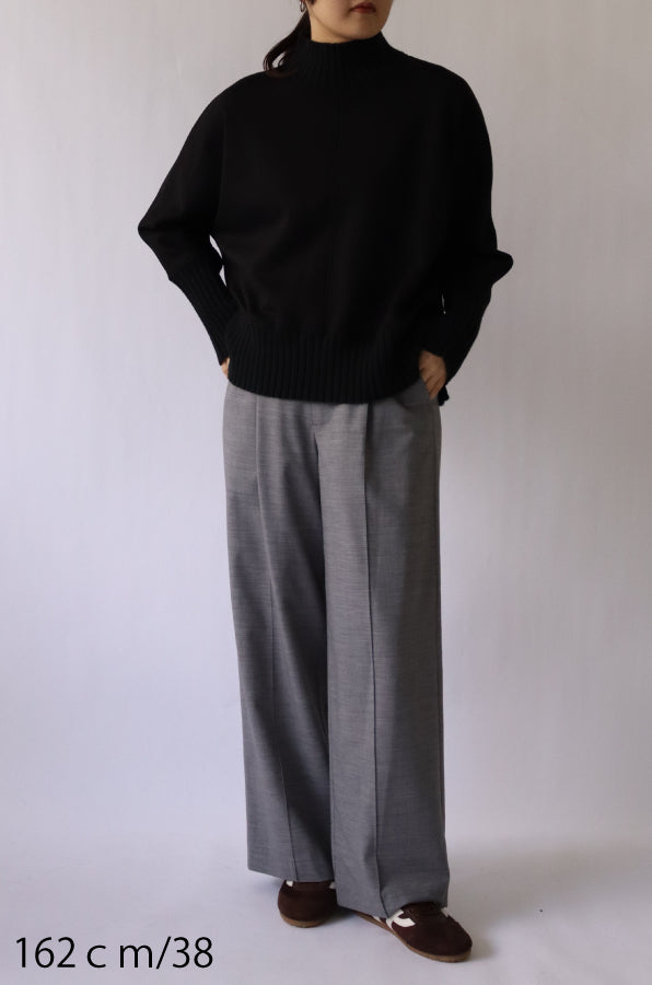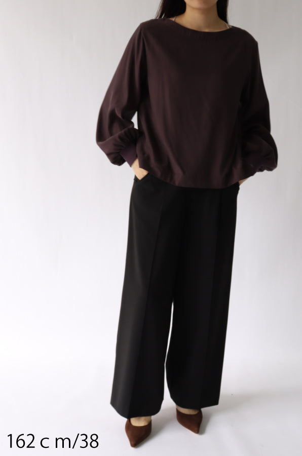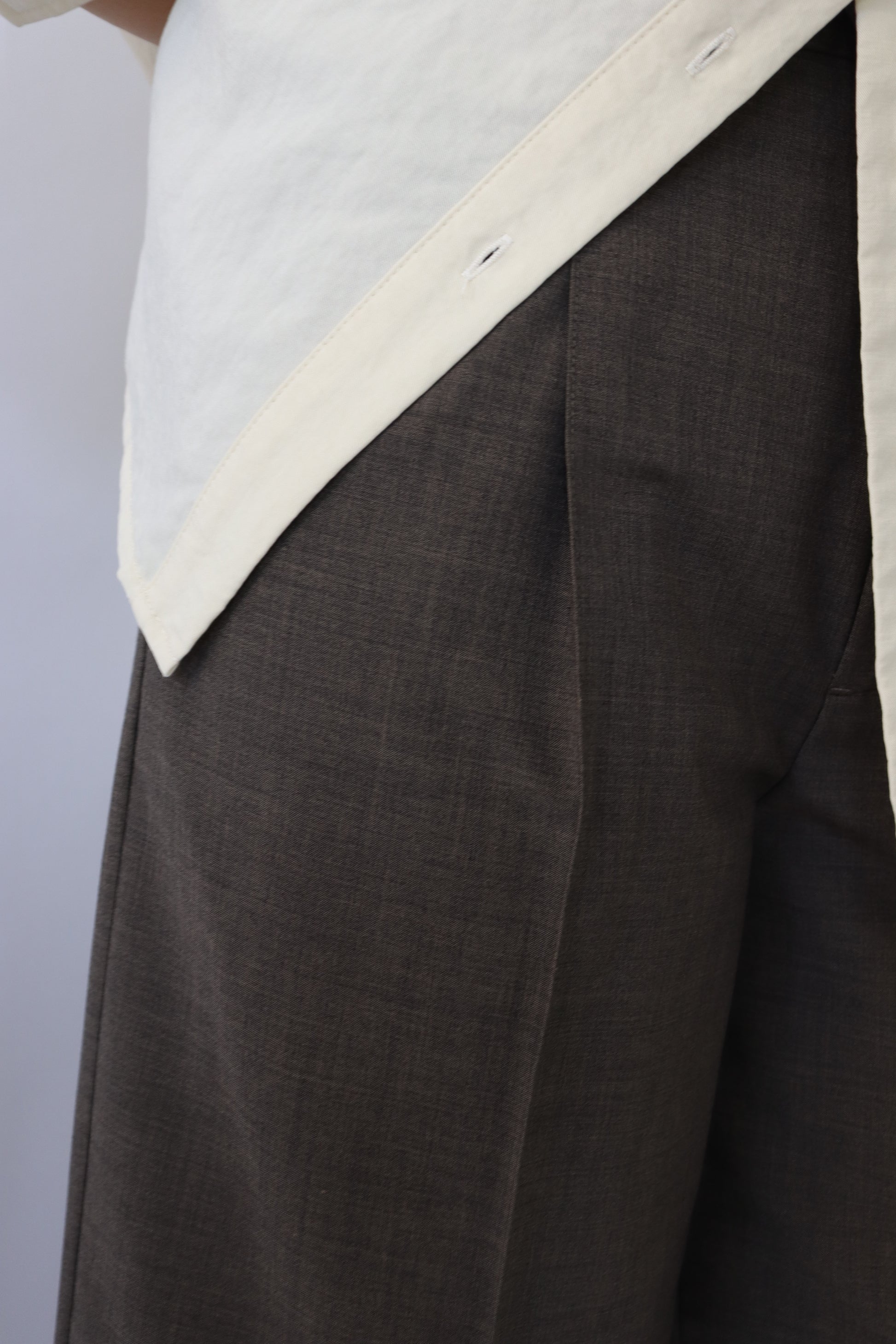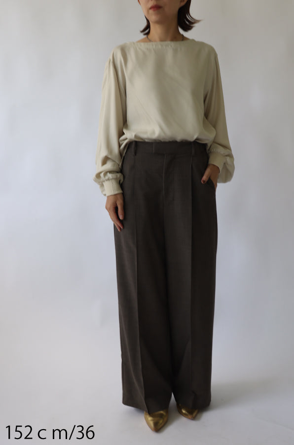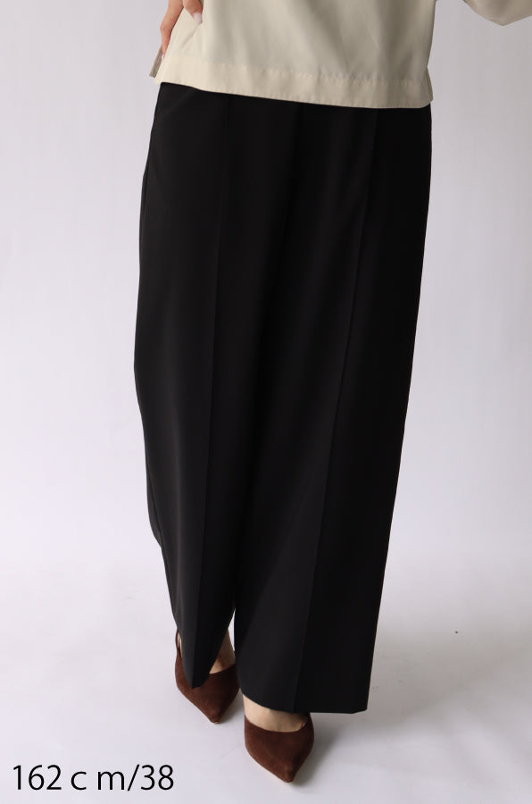 後ろウエストにはゴム入りで、リラックスした履き心地かつフロントにピンタックを施し、Iラインを強調した美シルエットなパンツ。ウールとレーヨン混で柔らかなタッチで高級感のある表面感の素材を使用し、オンオフ両用で着まわせるのでワードローブにあると便利な一本です。