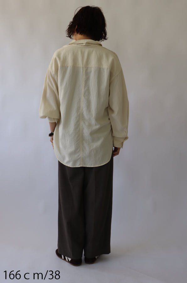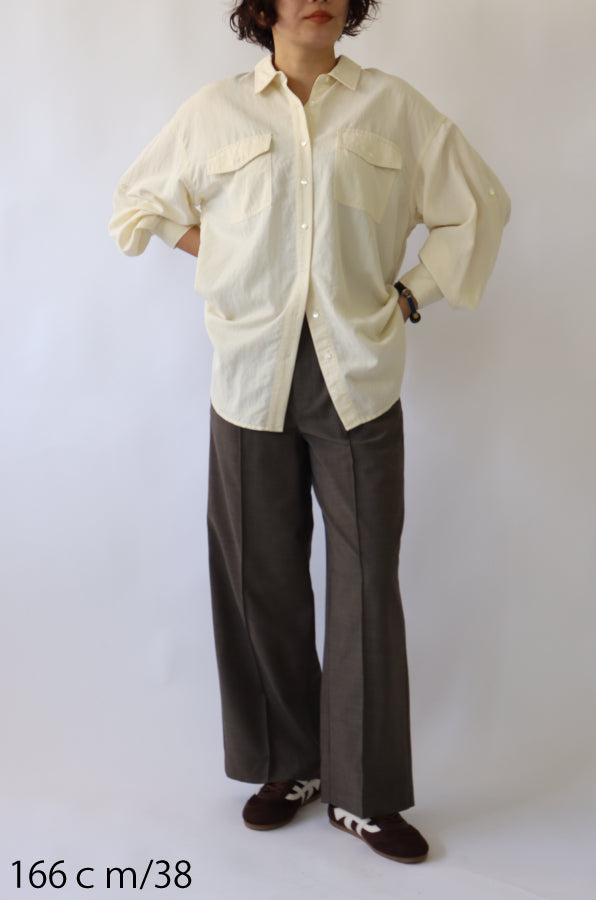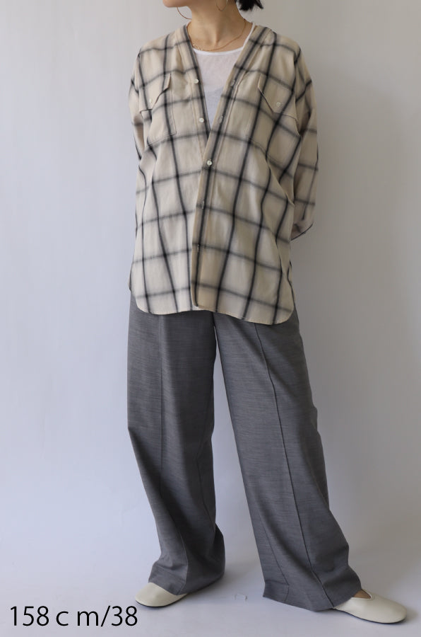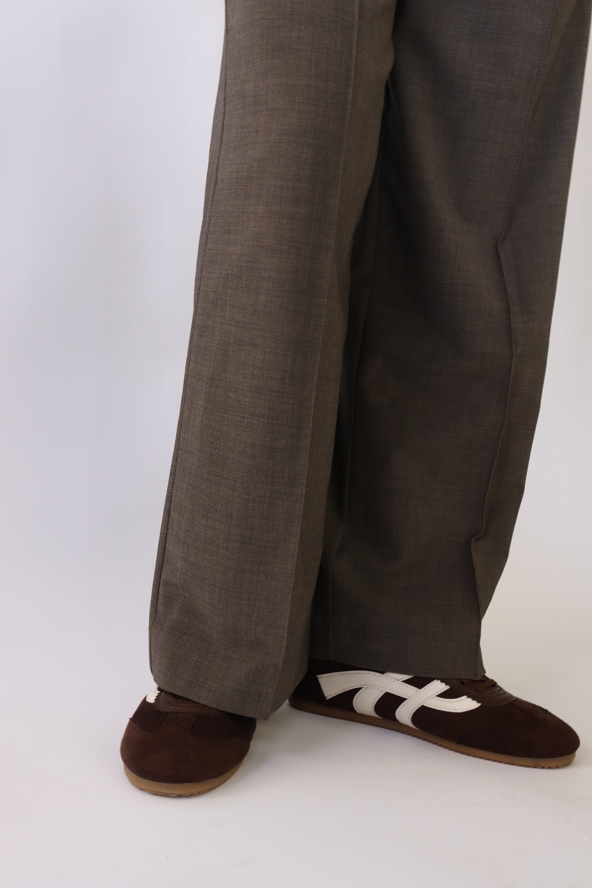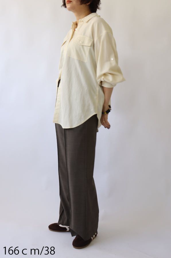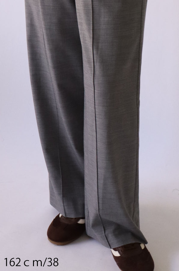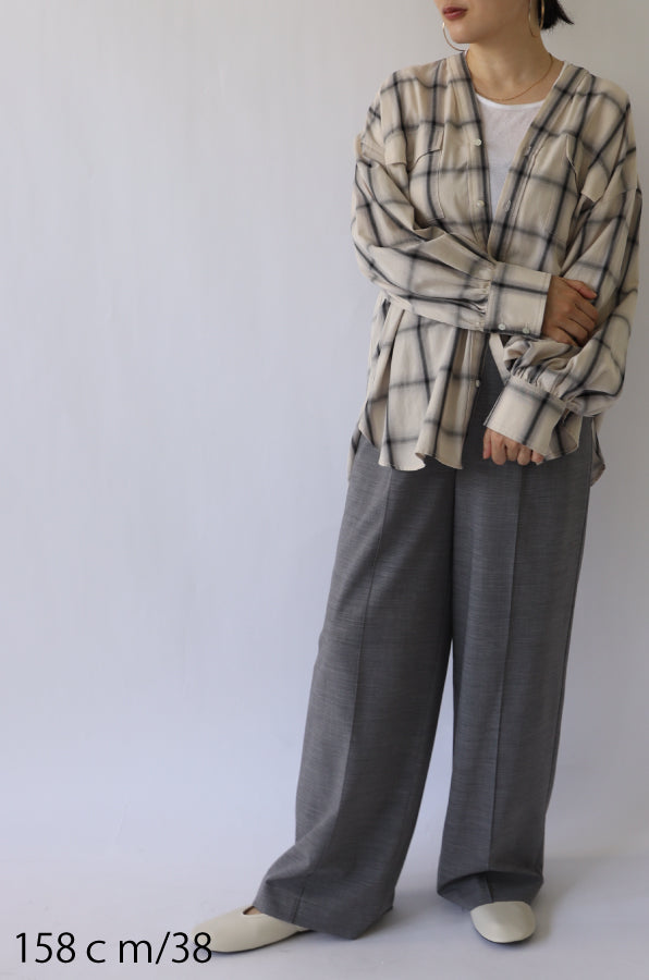 後ろウエストにはゴム入りで、リラックスした履き心地かつフロントにピンタックを施し、Iラインを強調した美シルエットなパンツ。ウールとレーヨン混で柔らかなタッチで高級感のある表面感の素材を使用し、オンオフ両用で着まわせるのでワードローブにあると便利な一本です。