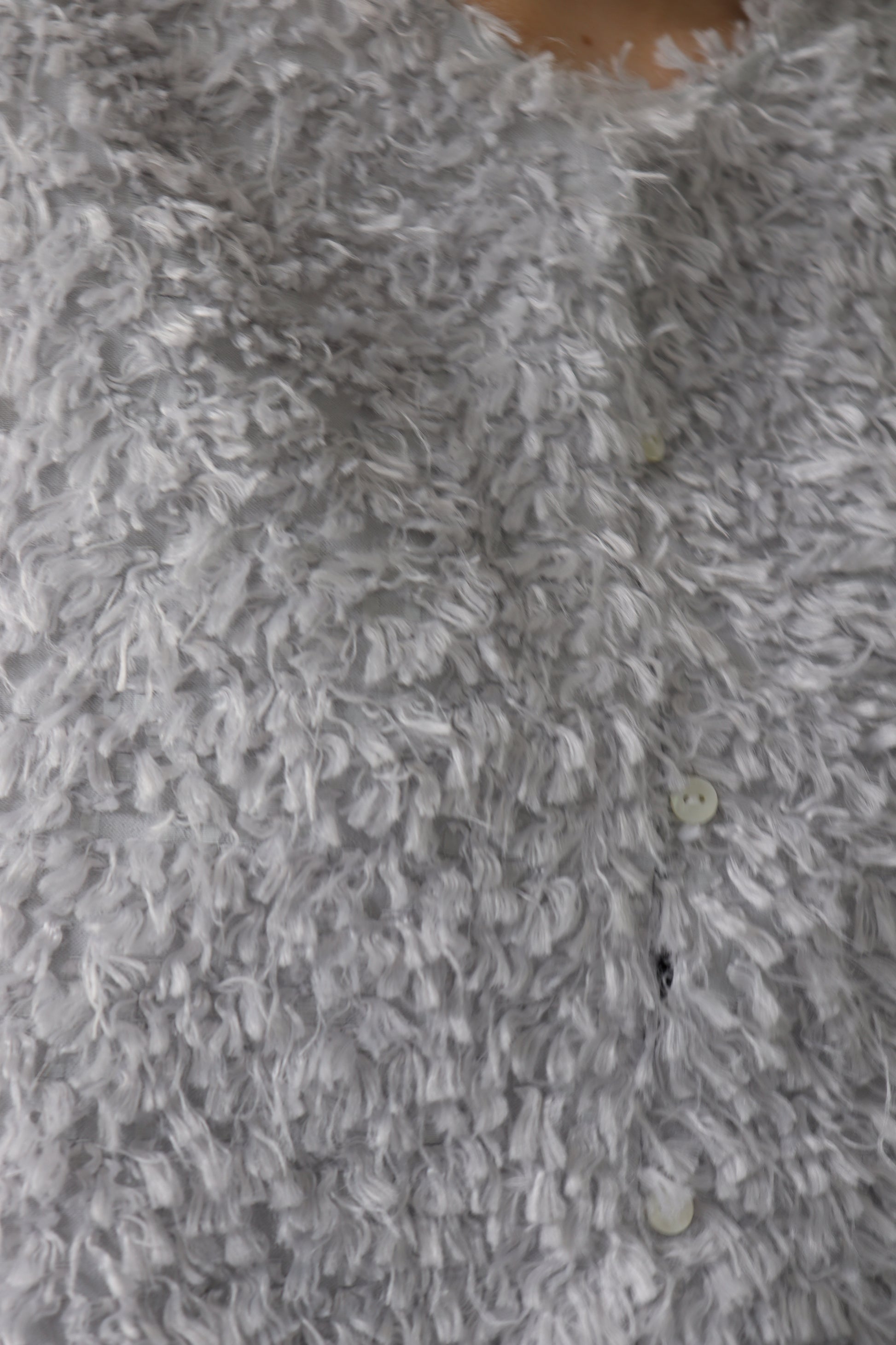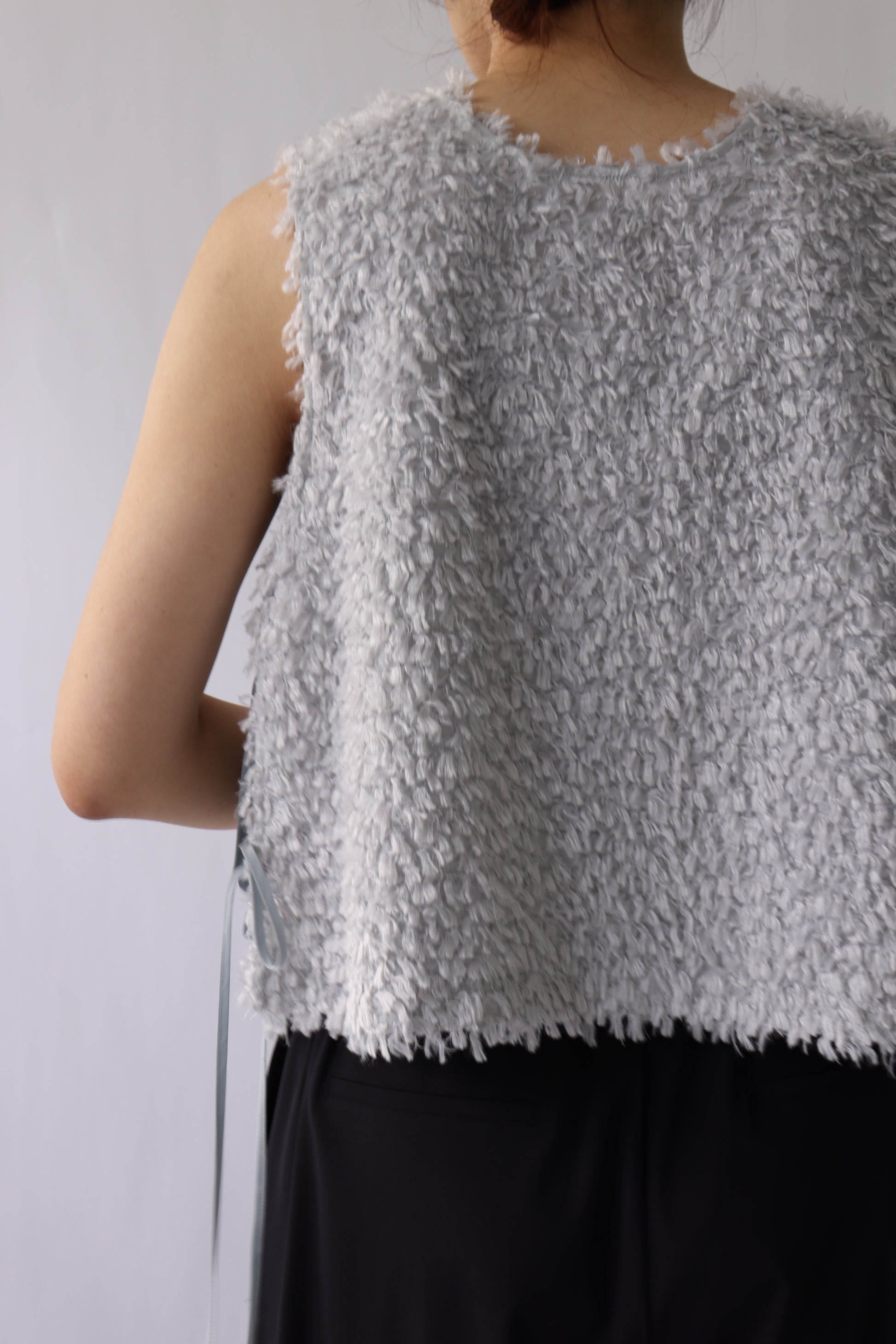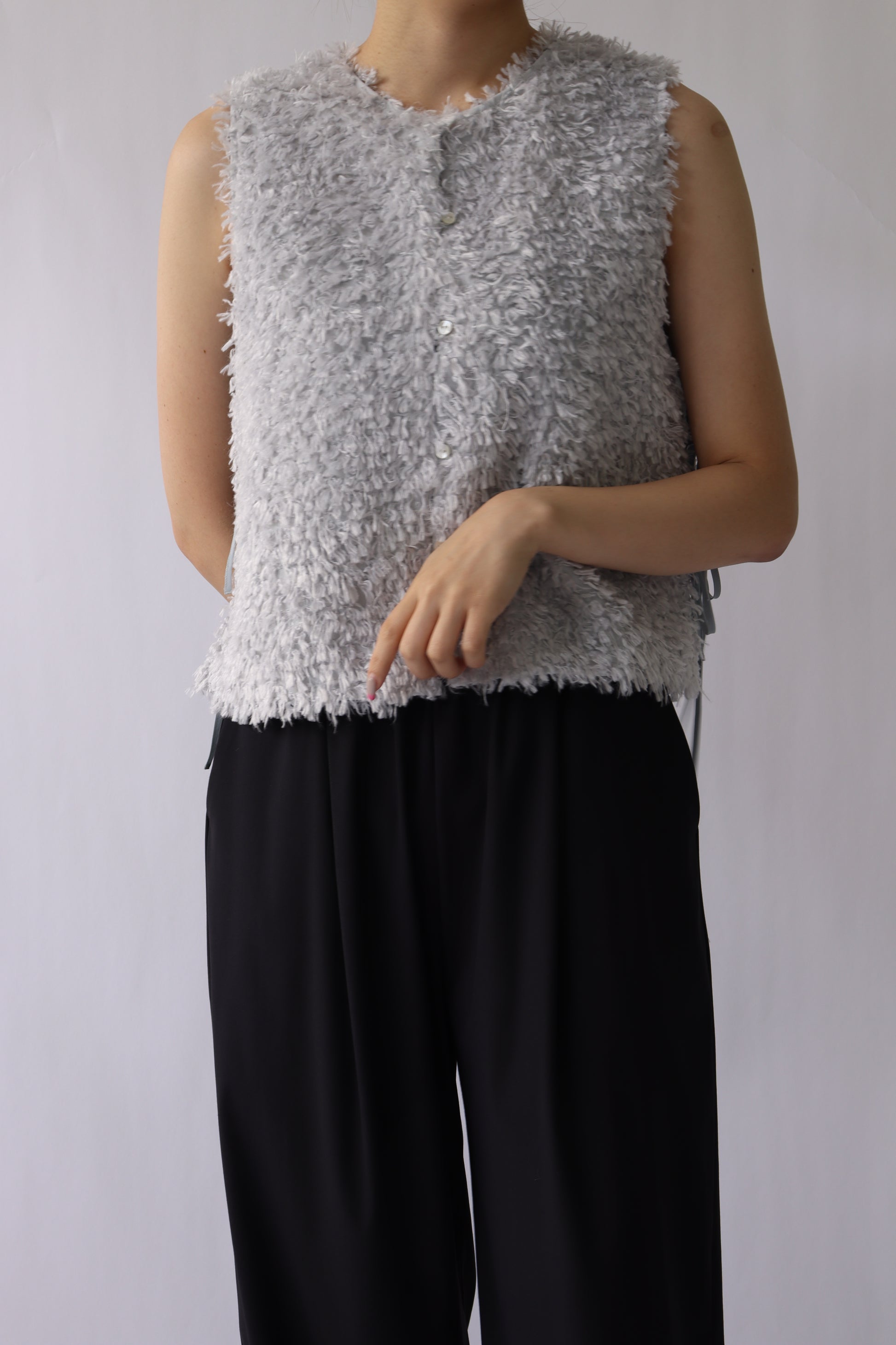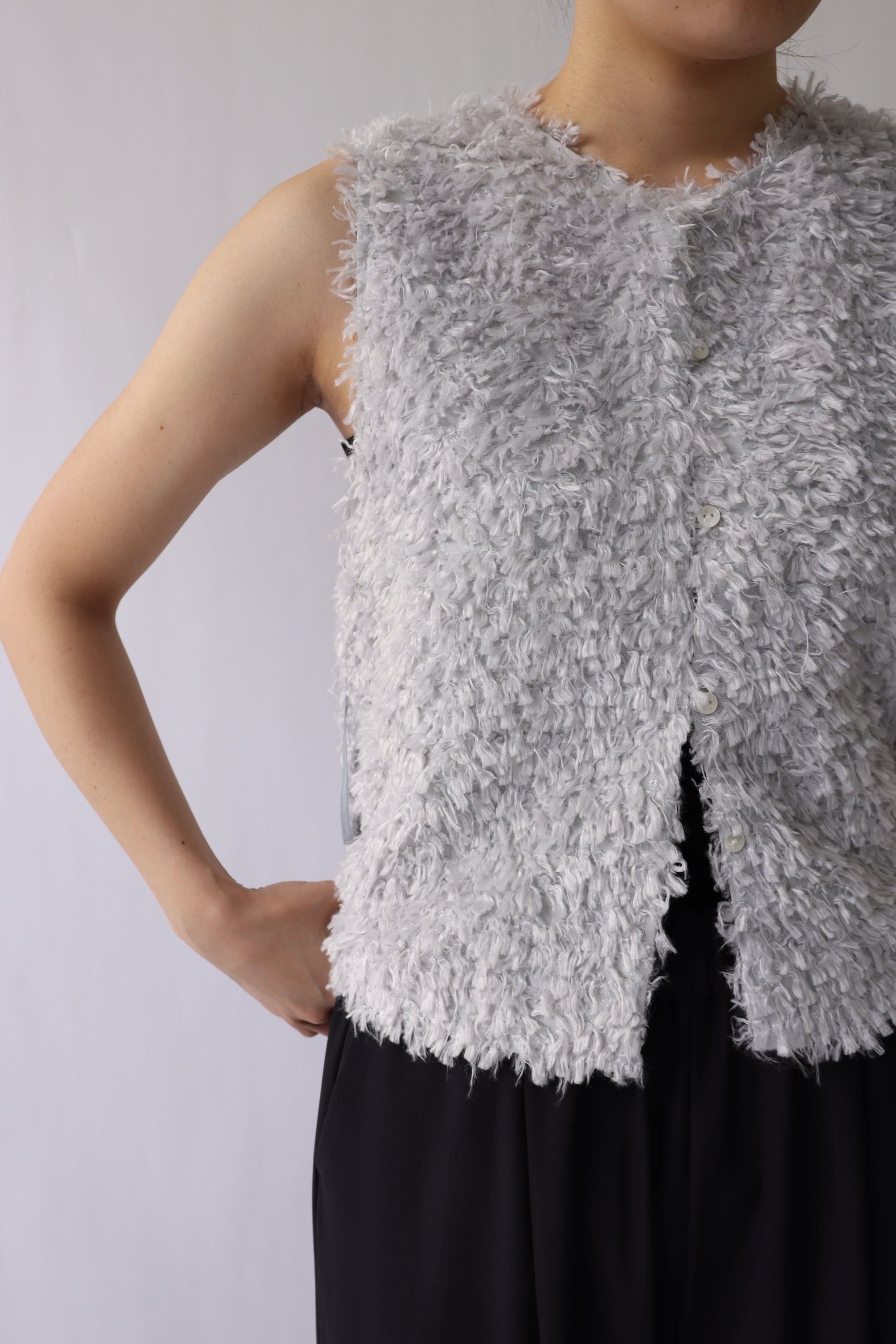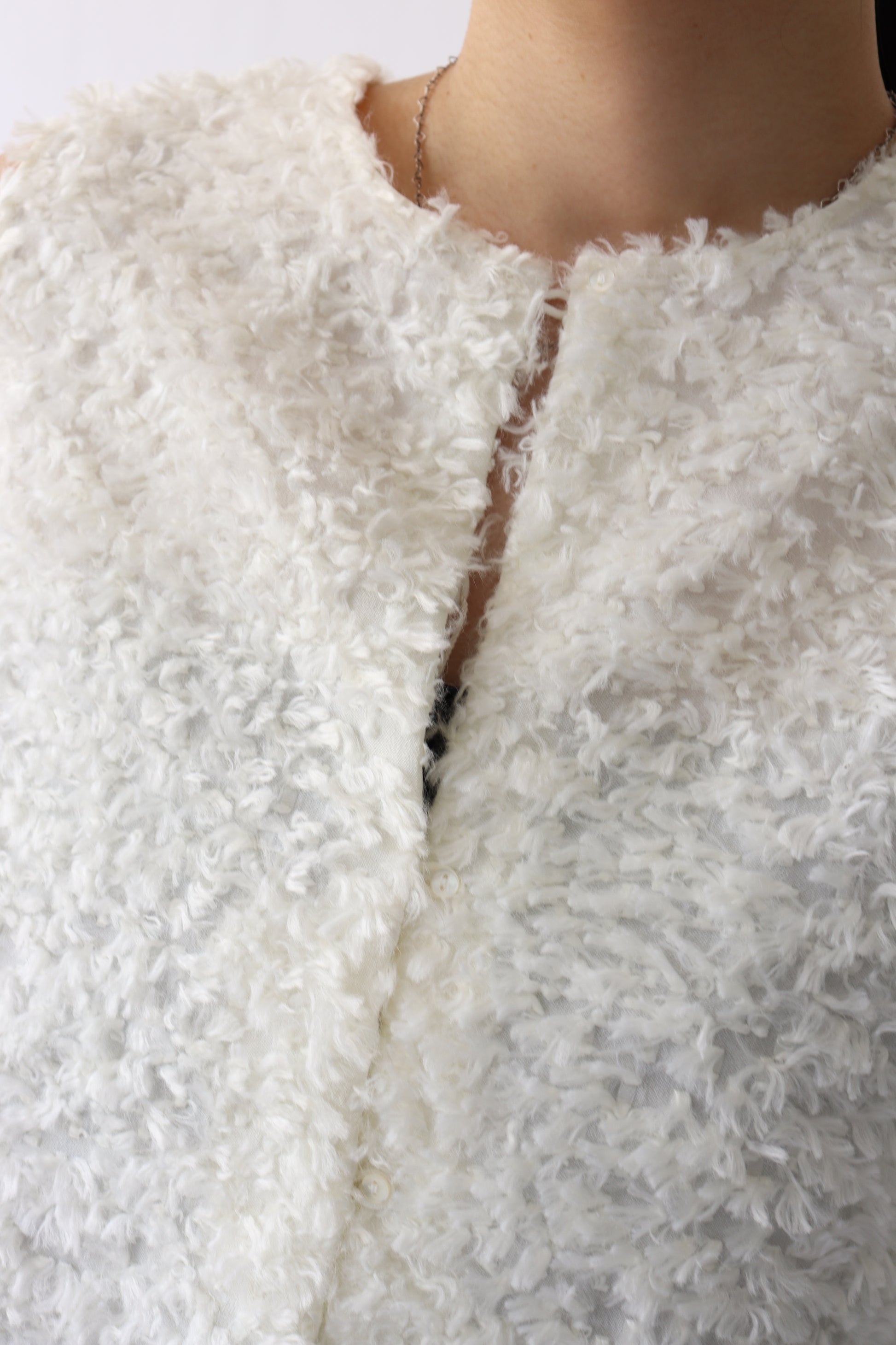 素材感を活かしたコンパクトなデザインベスト。プードルのような愛らしいモコモコ感を表現したカットジャガード素材。ボタンループの繊細さがフェミニンなボタン開きデザインとクルーネックの前後2wayで着られます。