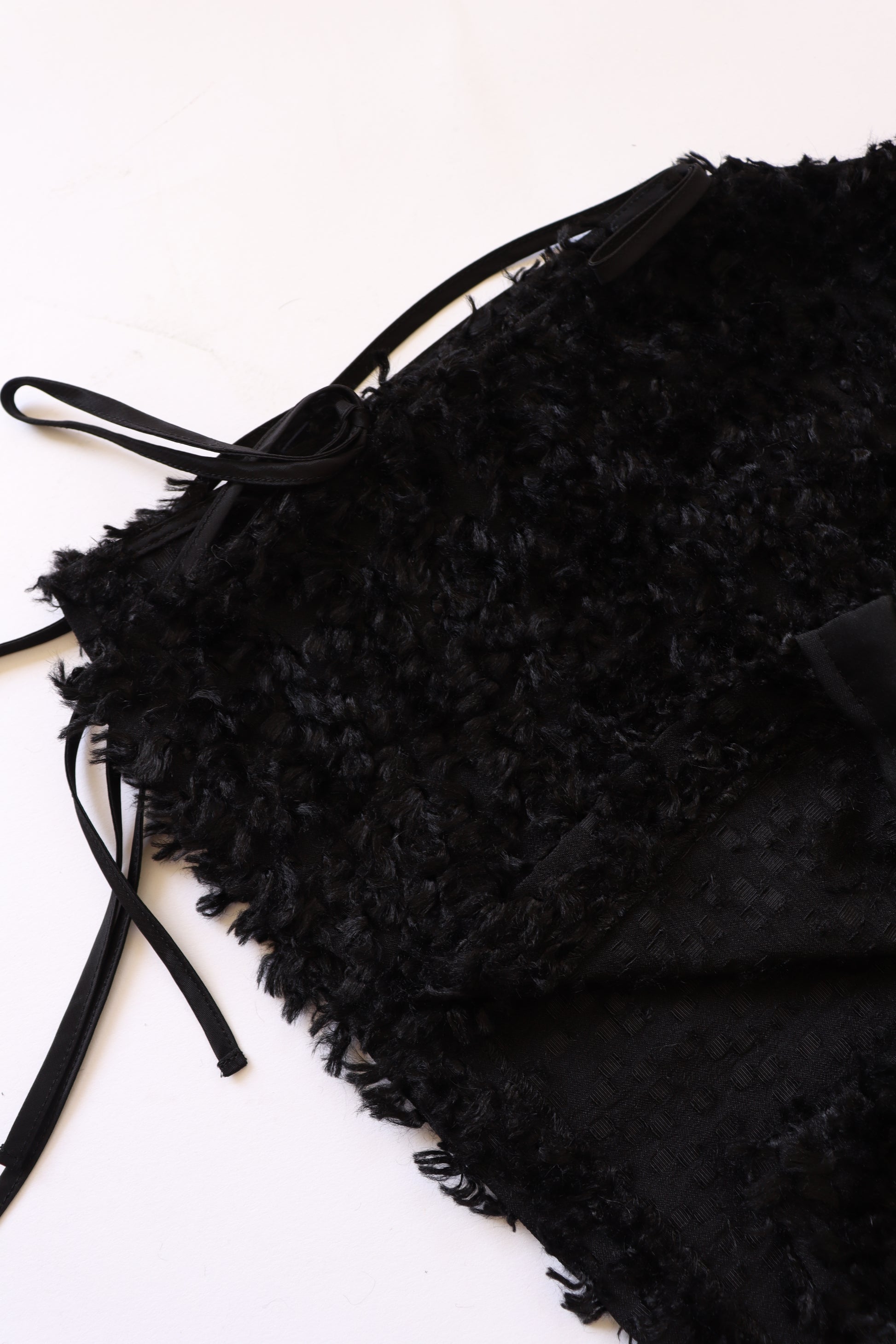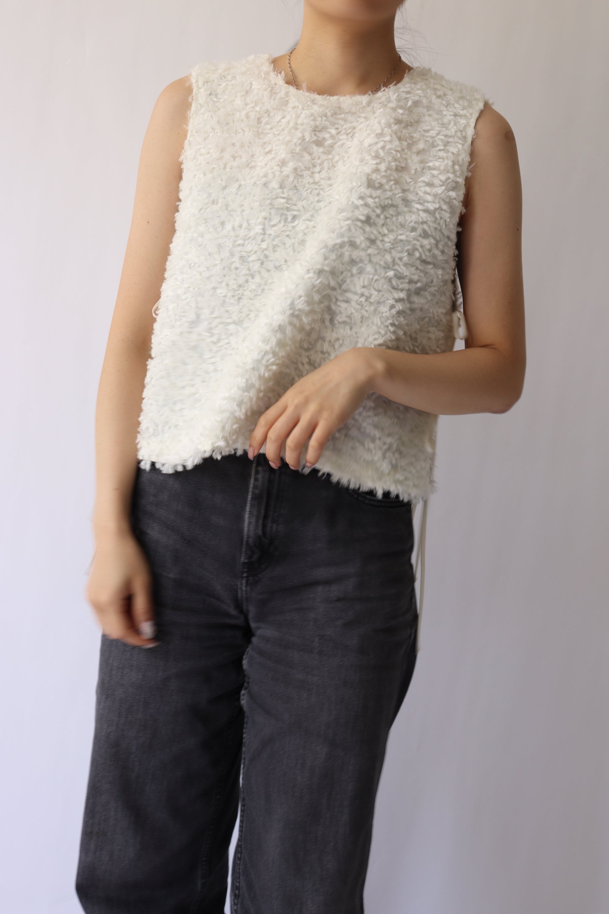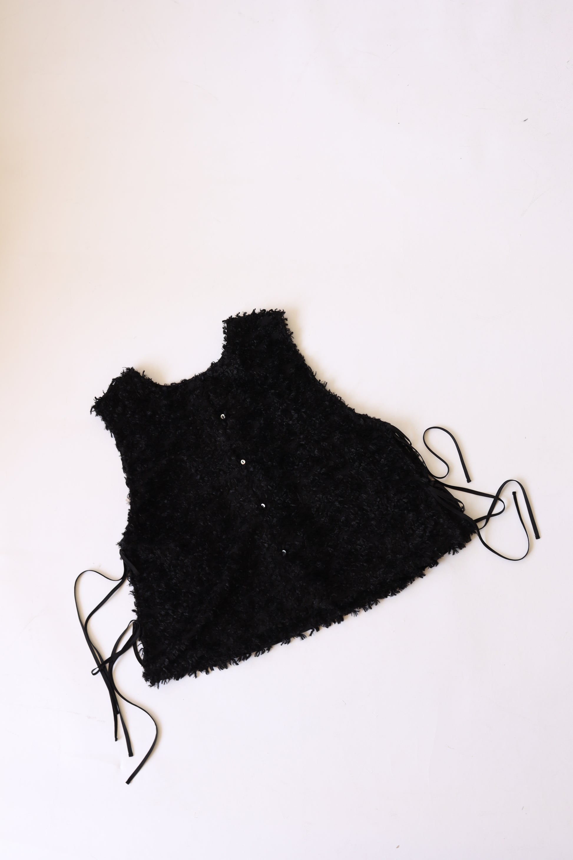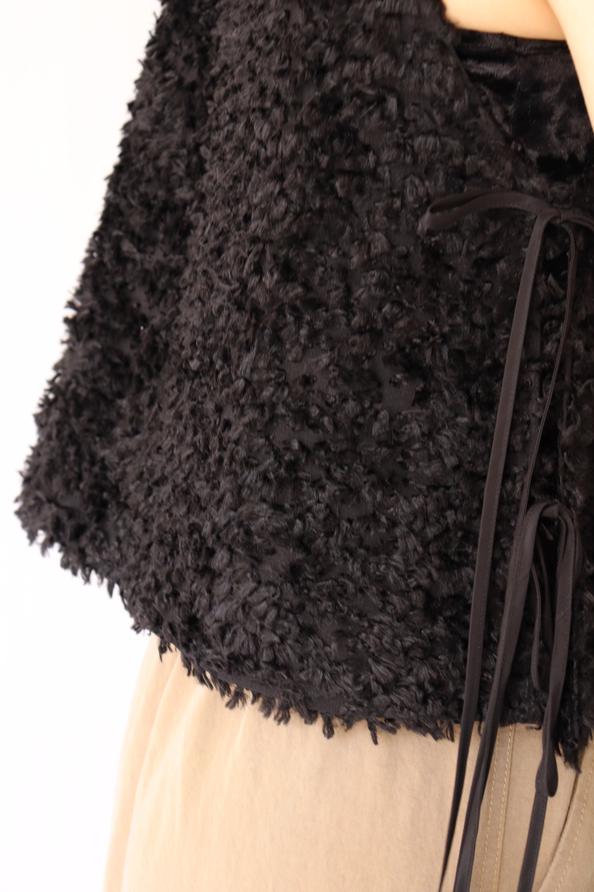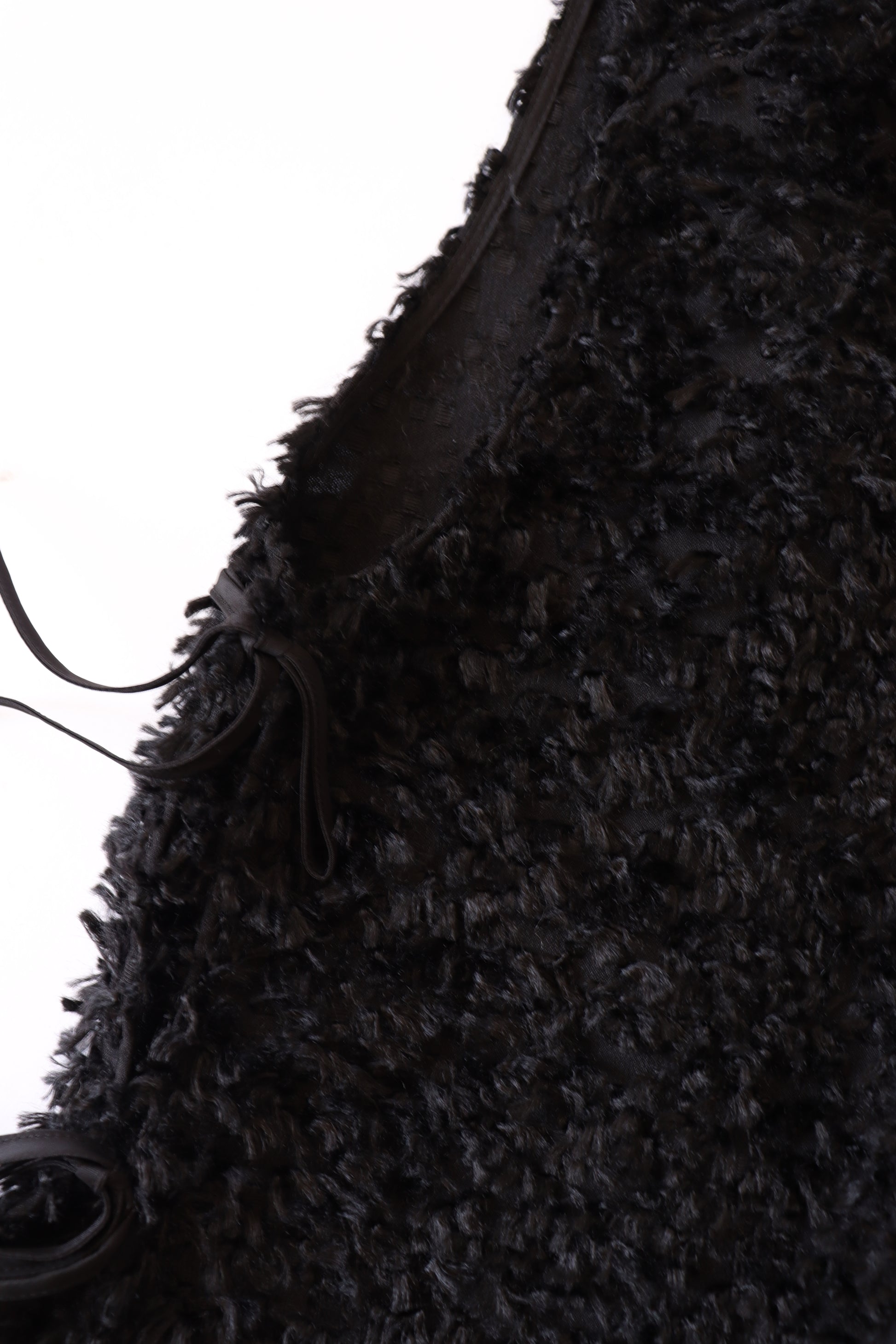 素材感を活かしたコンパクトなデザインベスト。プードルのような愛らしいモコモコ感を表現したカットジャガード素材。ボタンループの繊細さがフェミニンなボタン開きデザインとクルーネックの前後2wayで着られます。