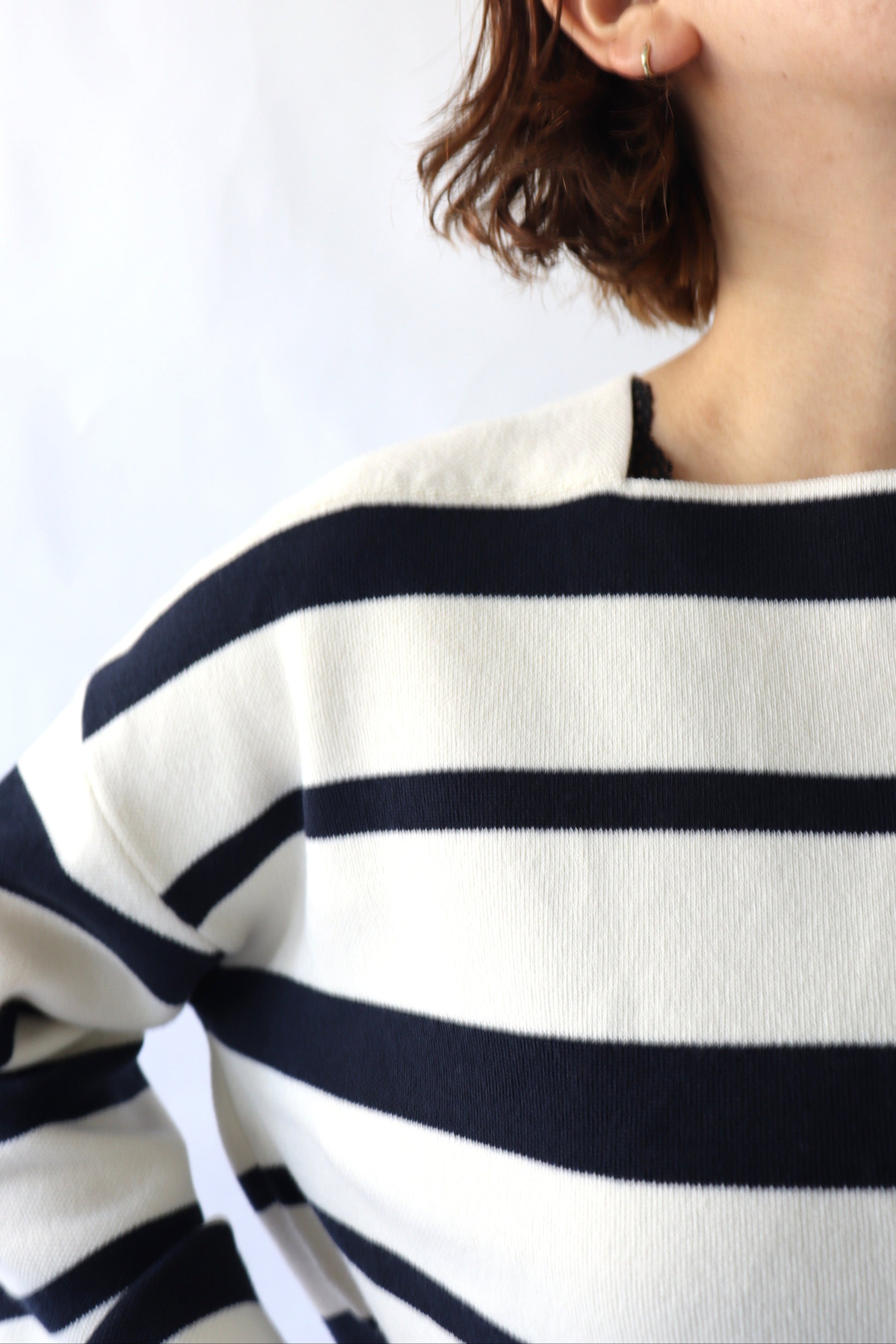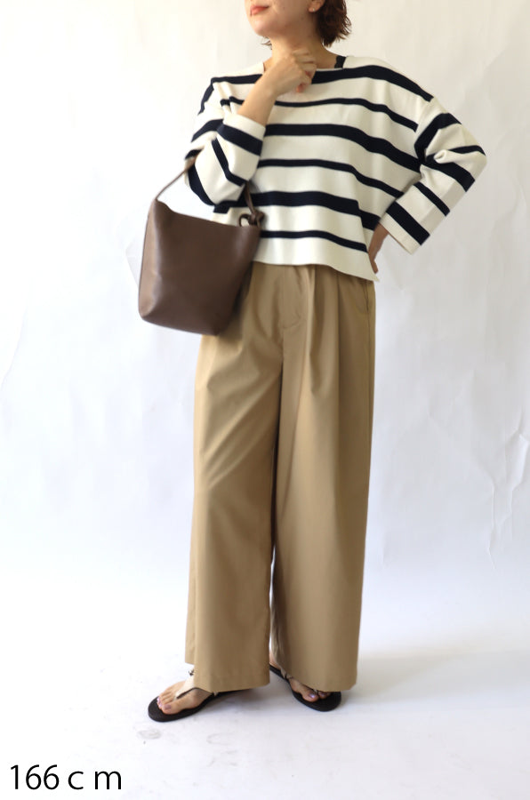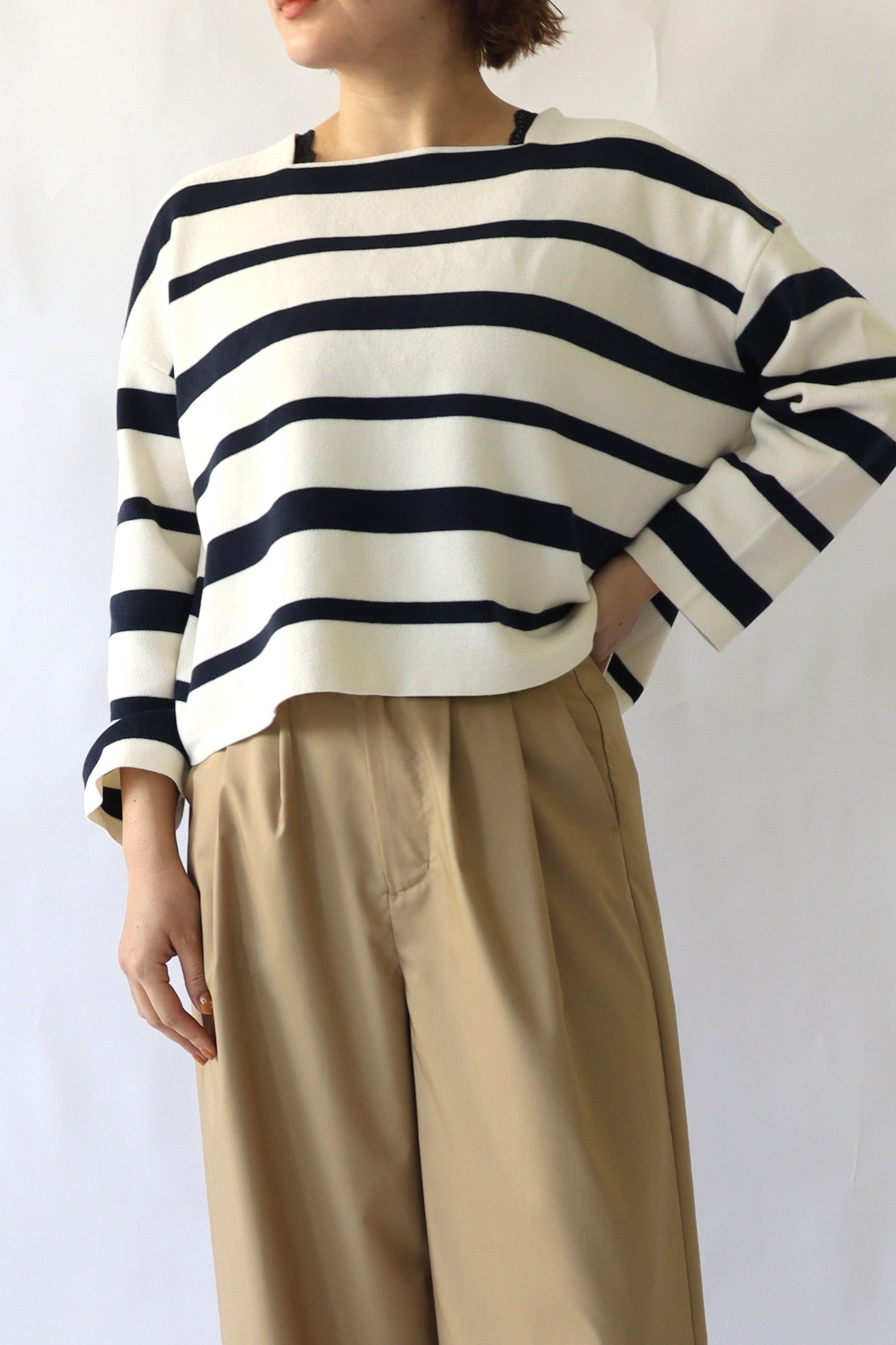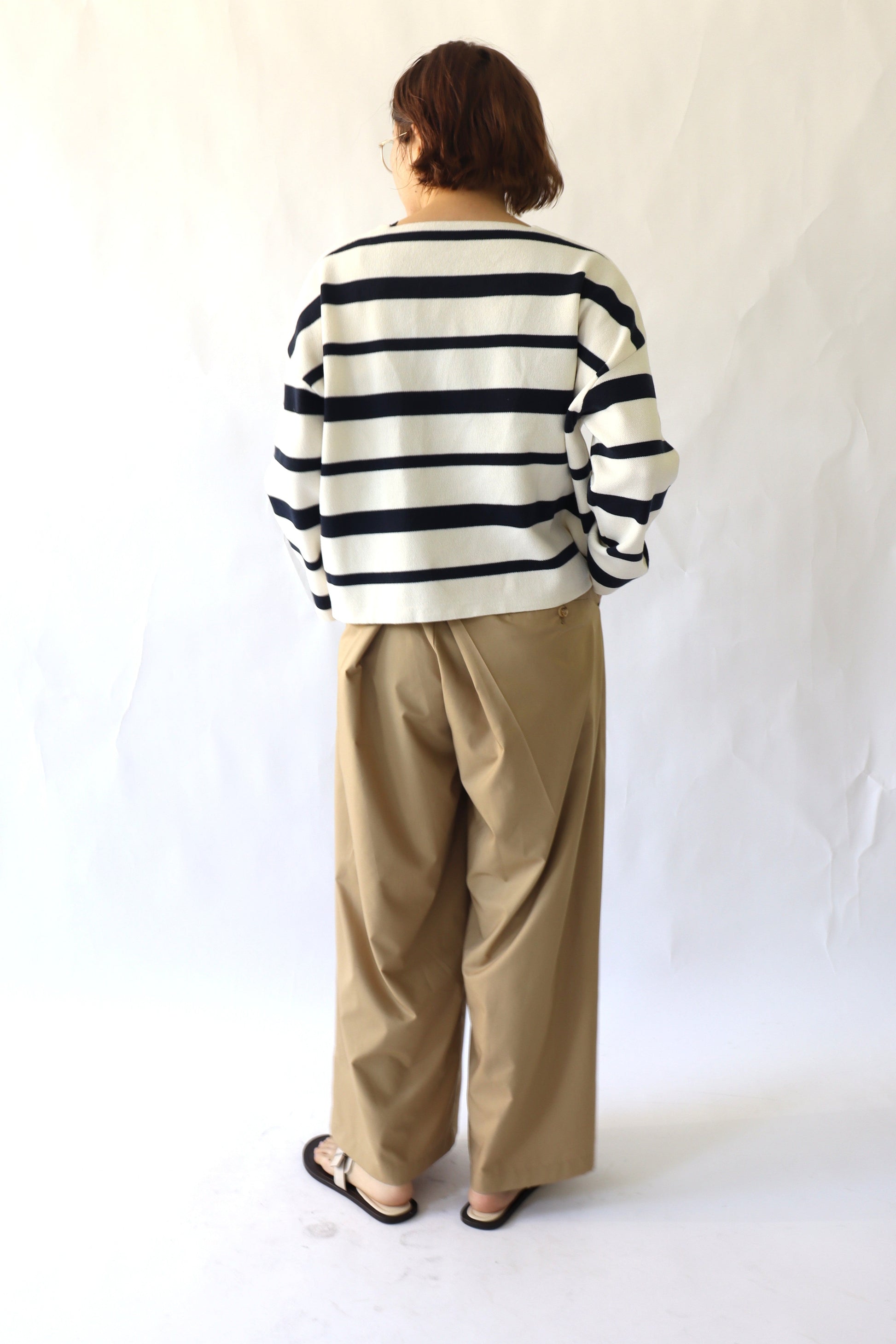 カジュアルになりがちなボーダーアイテムも、女性らしい衿元と全体のバランスで上品な雰囲気にも着ていただけます。