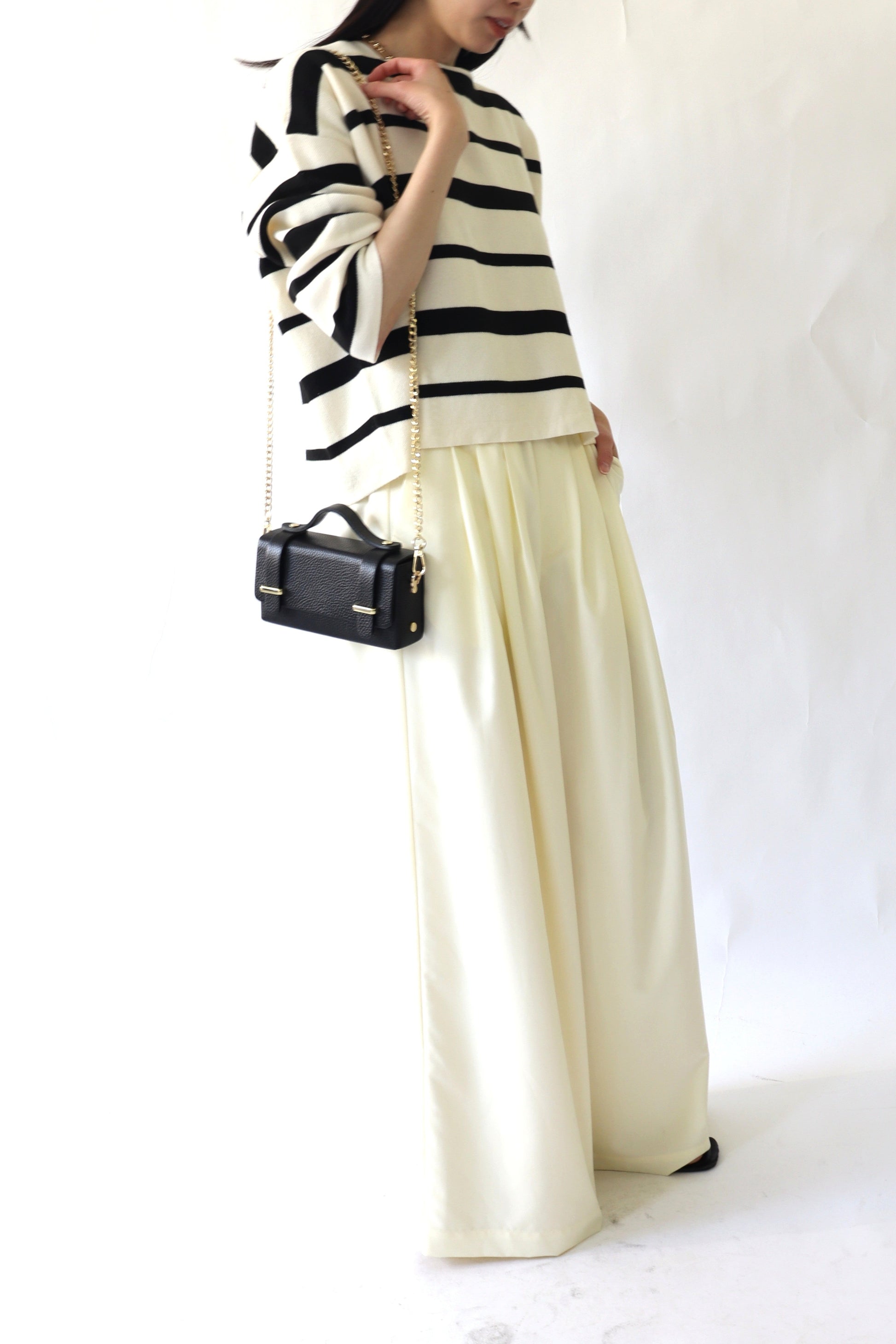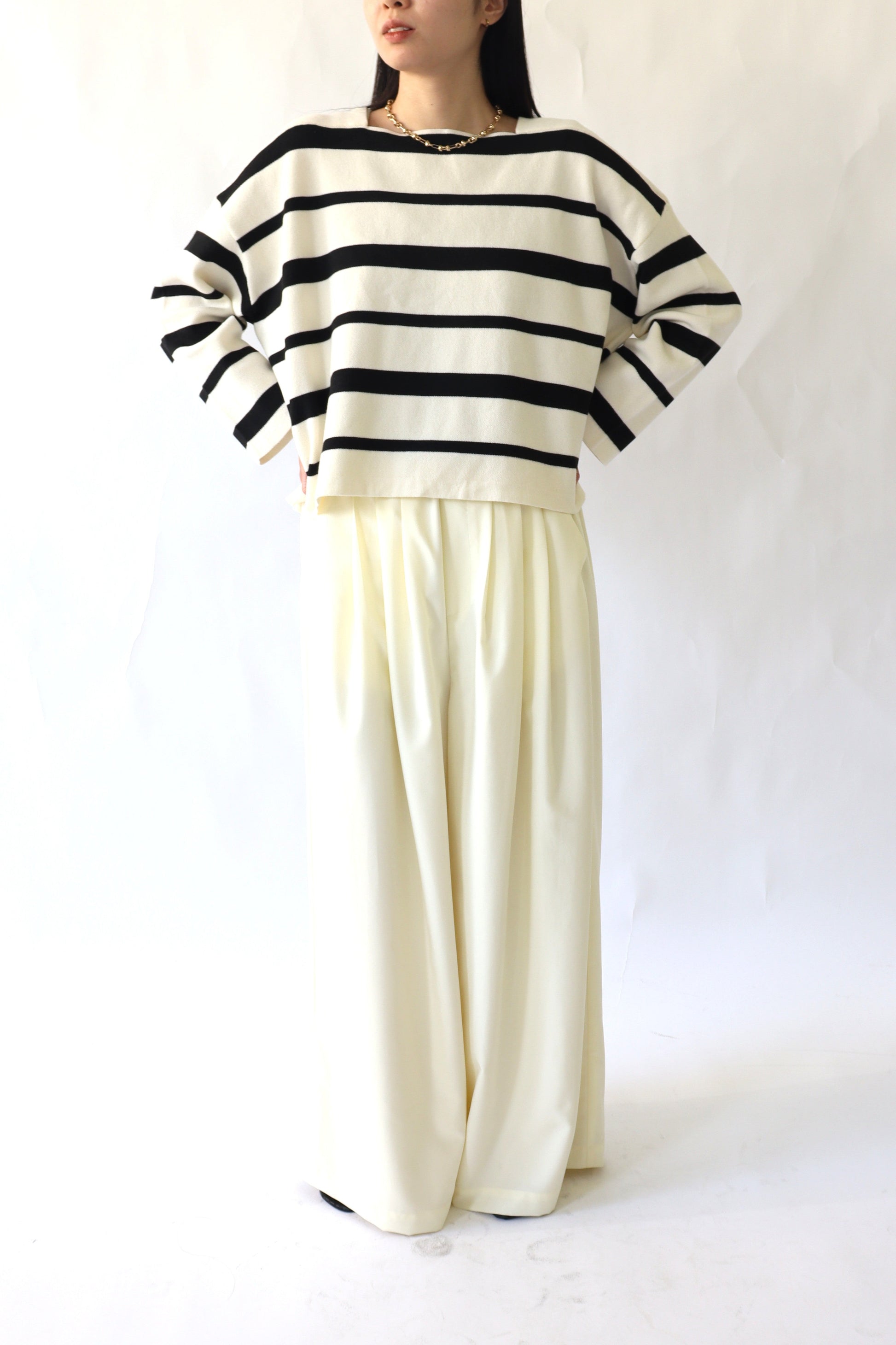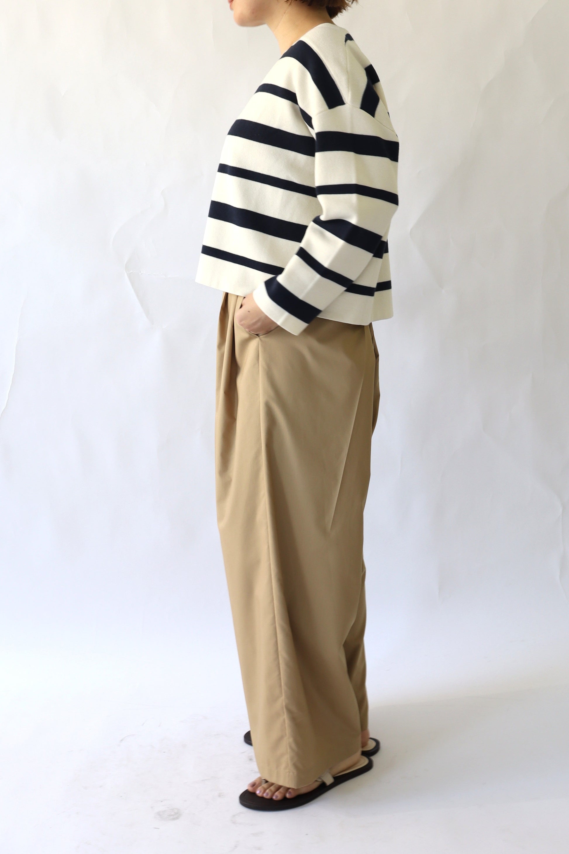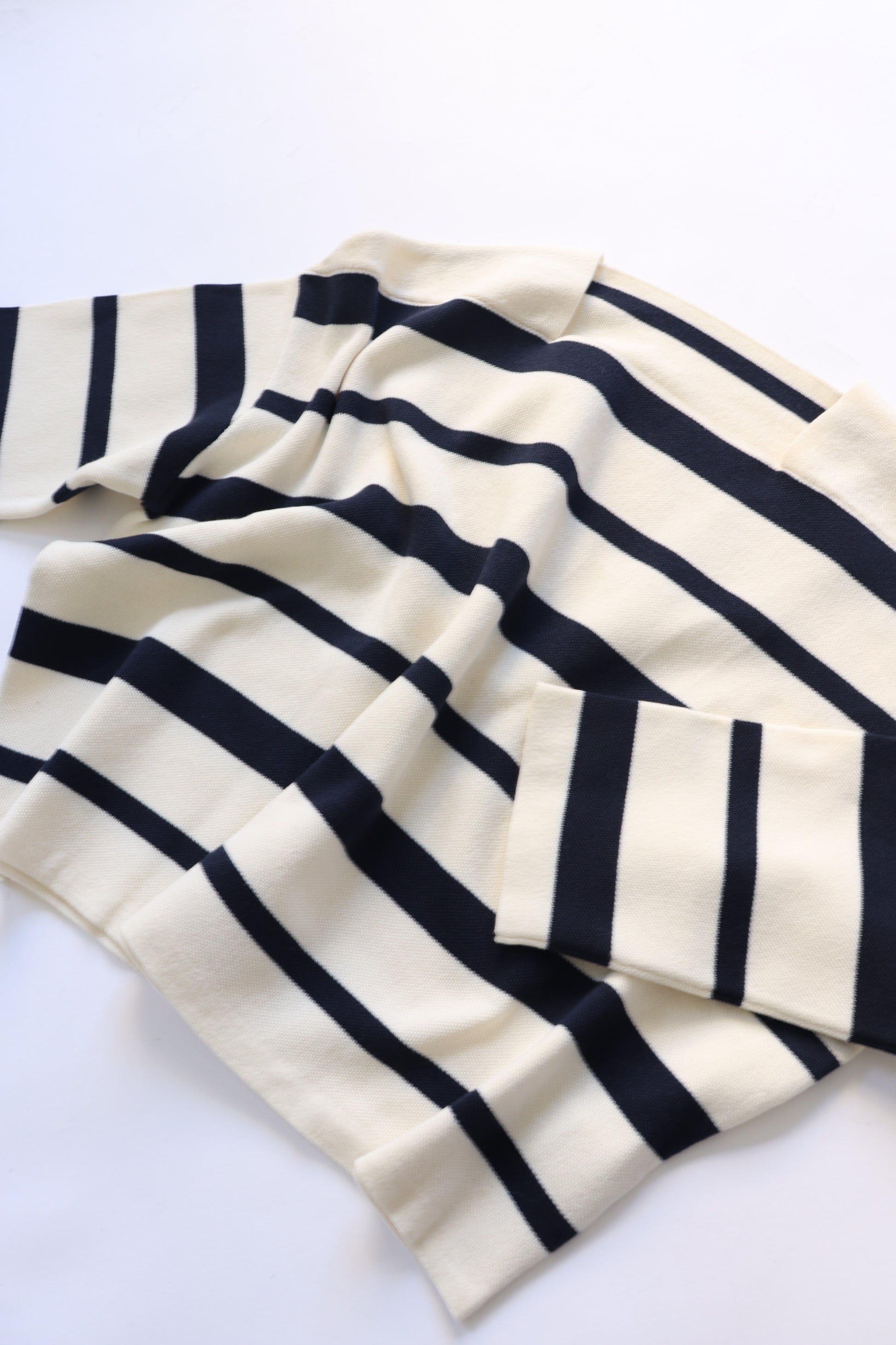 カジュアルになりがちなボーダーアイテムも、女性らしい衿元と全体のバランスで上品な雰囲気にも着ていただけます。