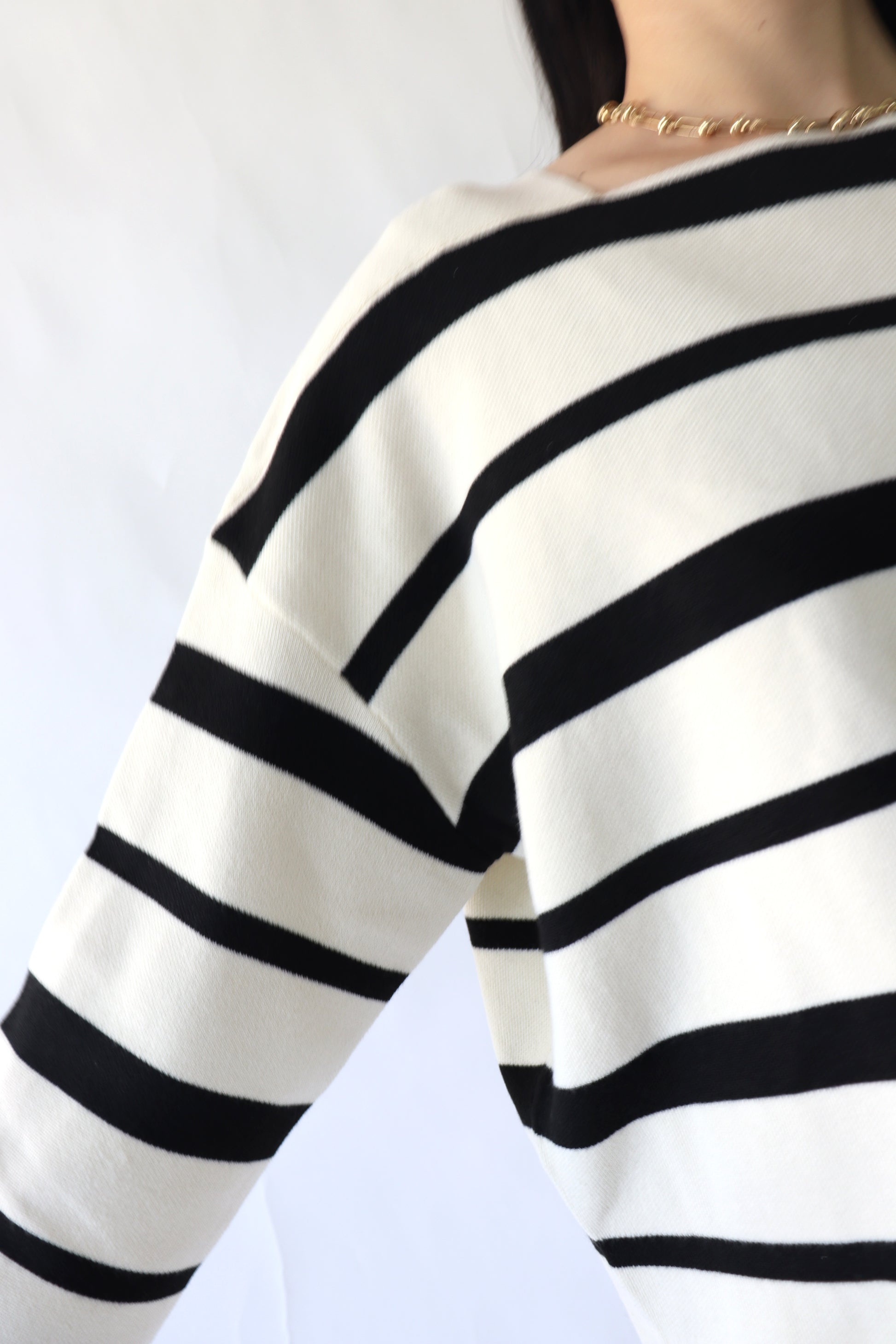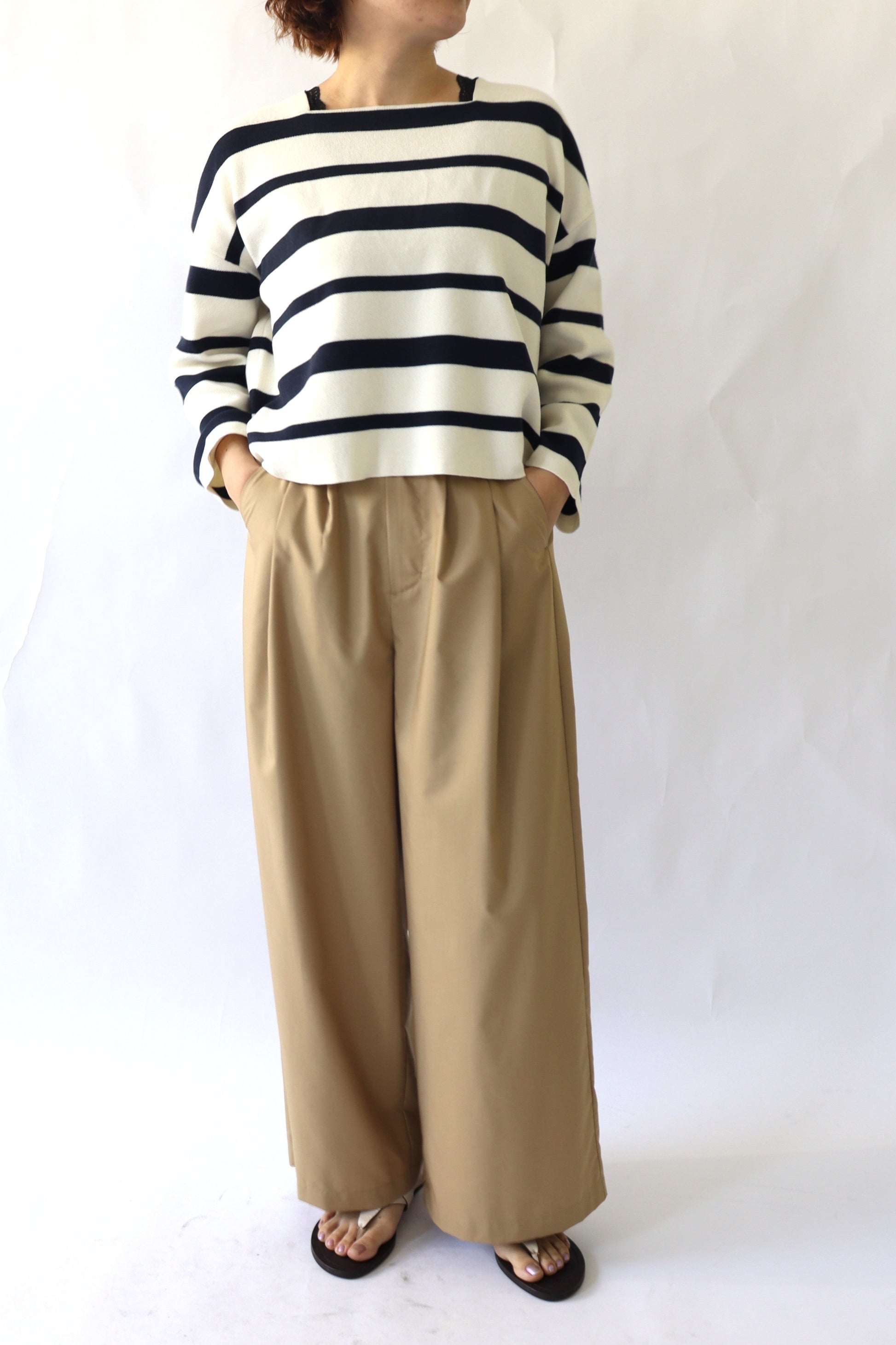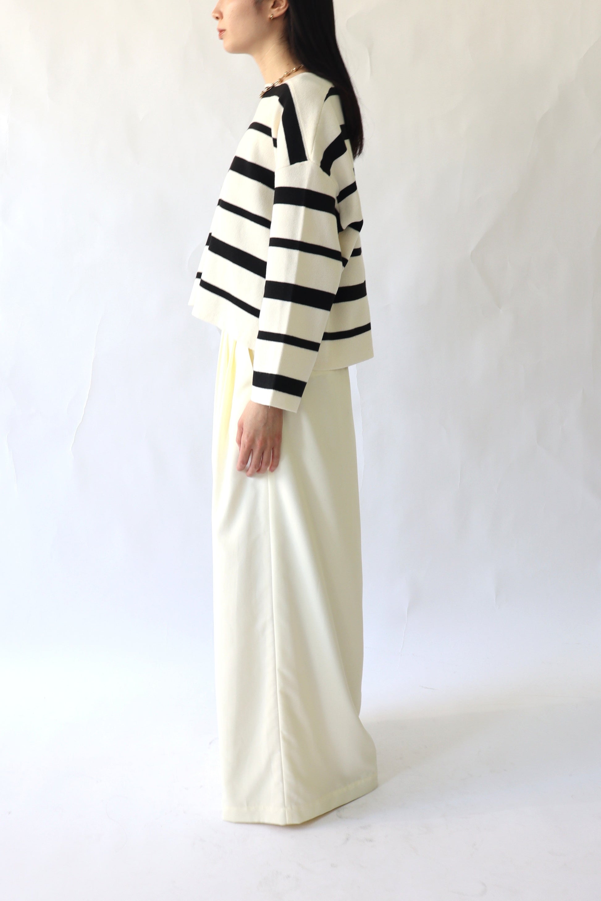 カジュアルになりがちなボーダーアイテムも、女性らしい衿元と全体のバランスで上品な雰囲気にも着ていただけます。