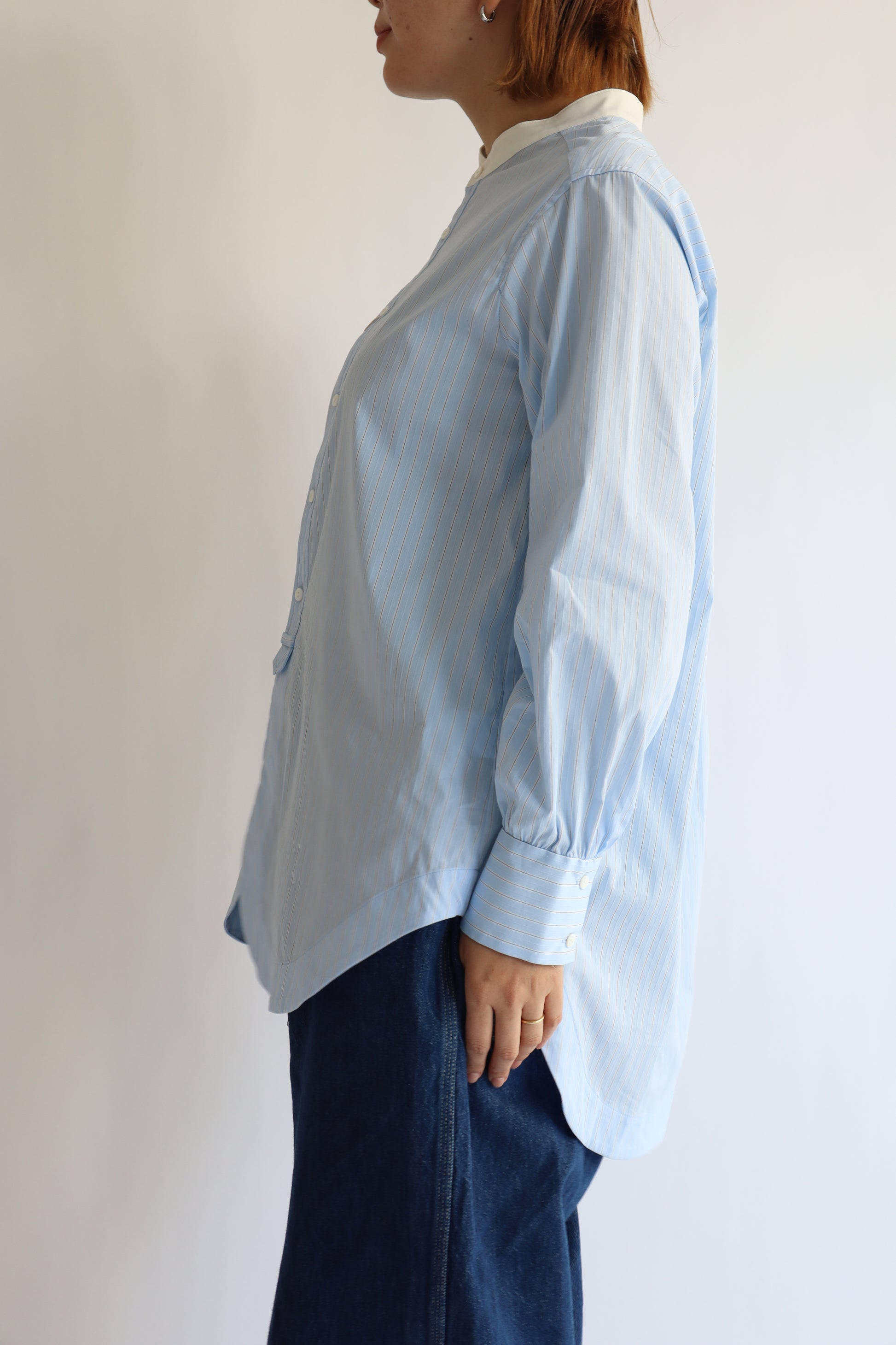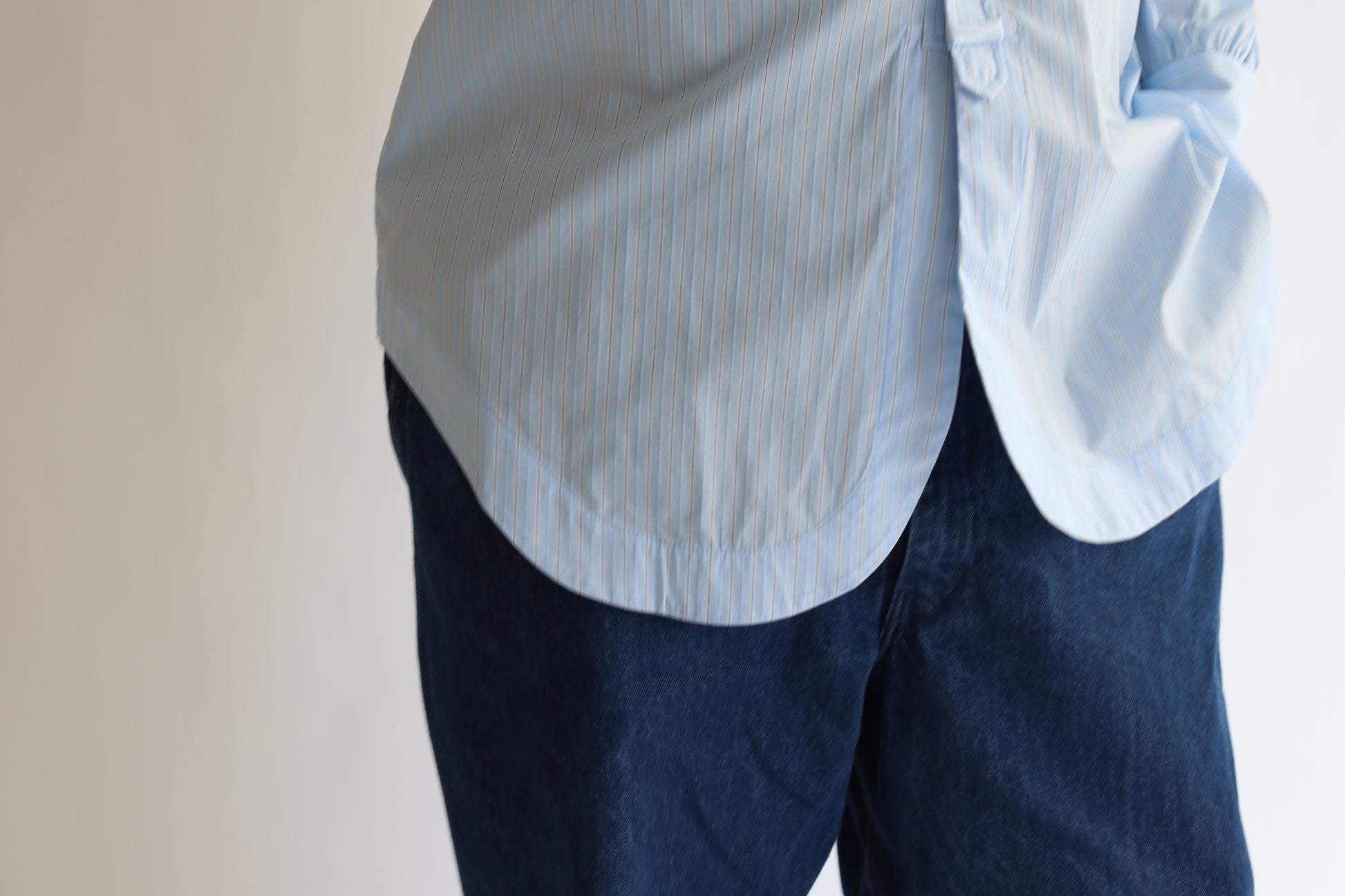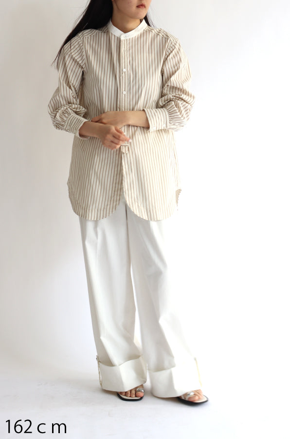 クレリックシャツとはもともと英国発祥の衿や袖が白い生地で切り替えられたマニッシュなシャツですが、裾をラウンドさせ、袖のボリュームを調整したことでハンサムかつ女性らしい仕上がりに。