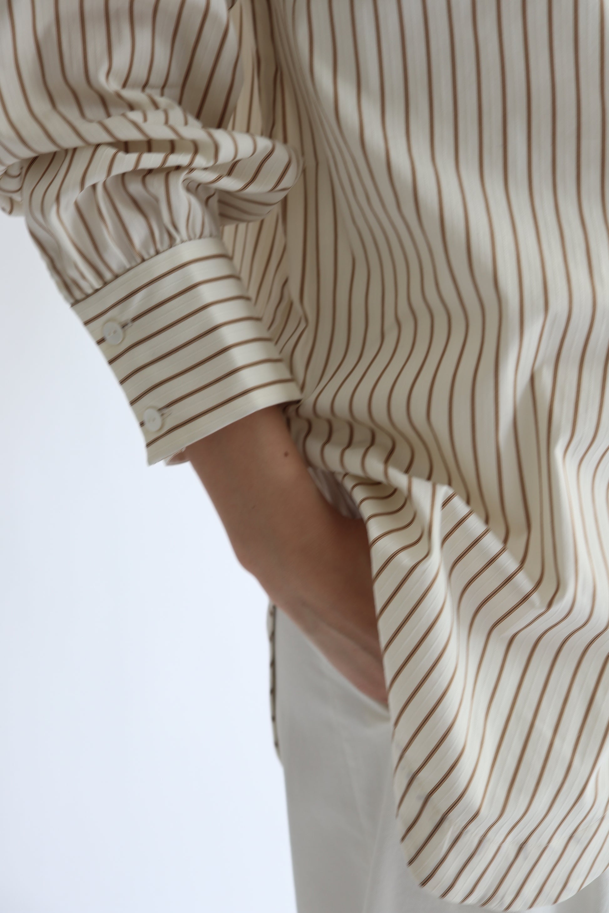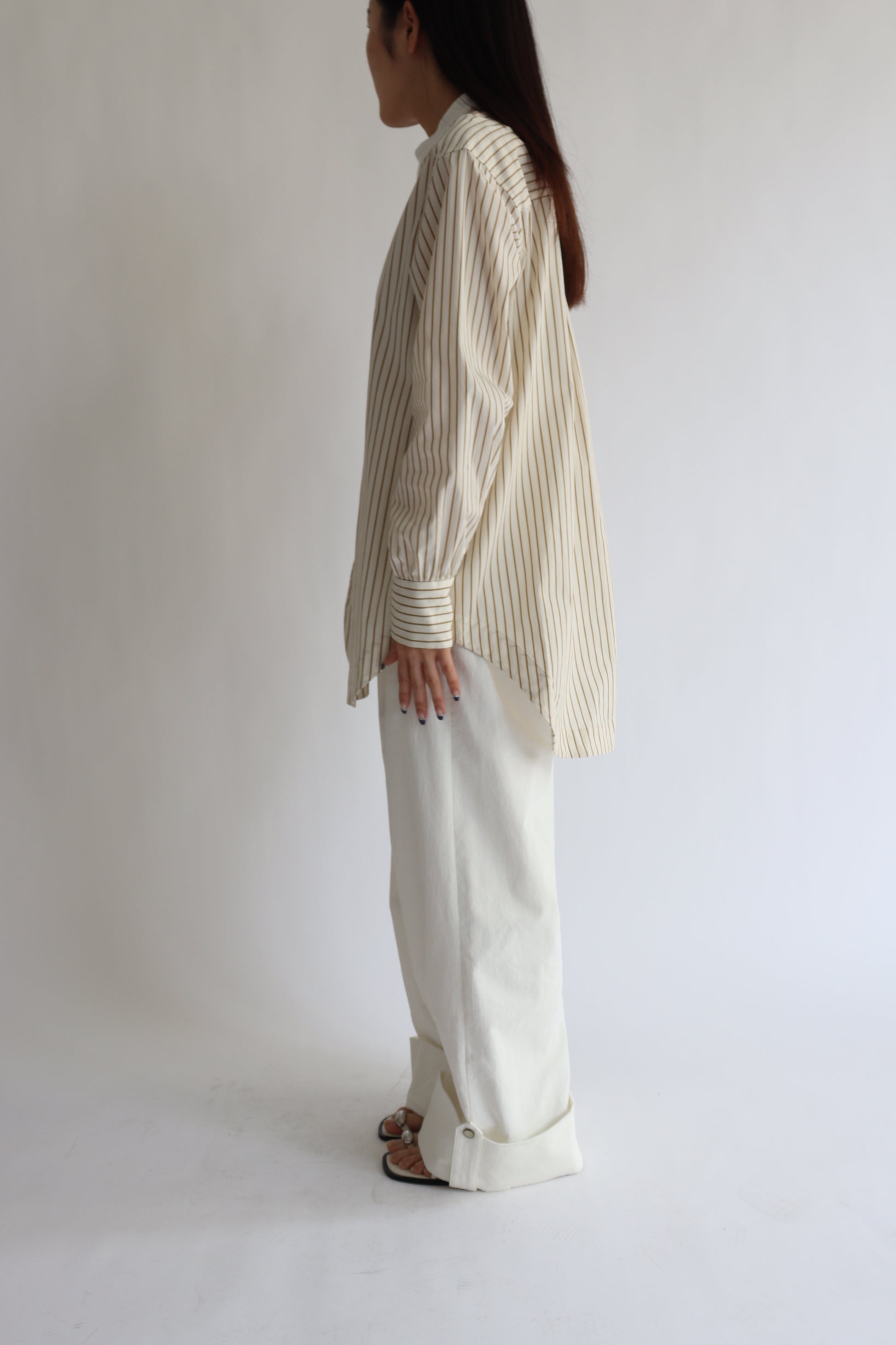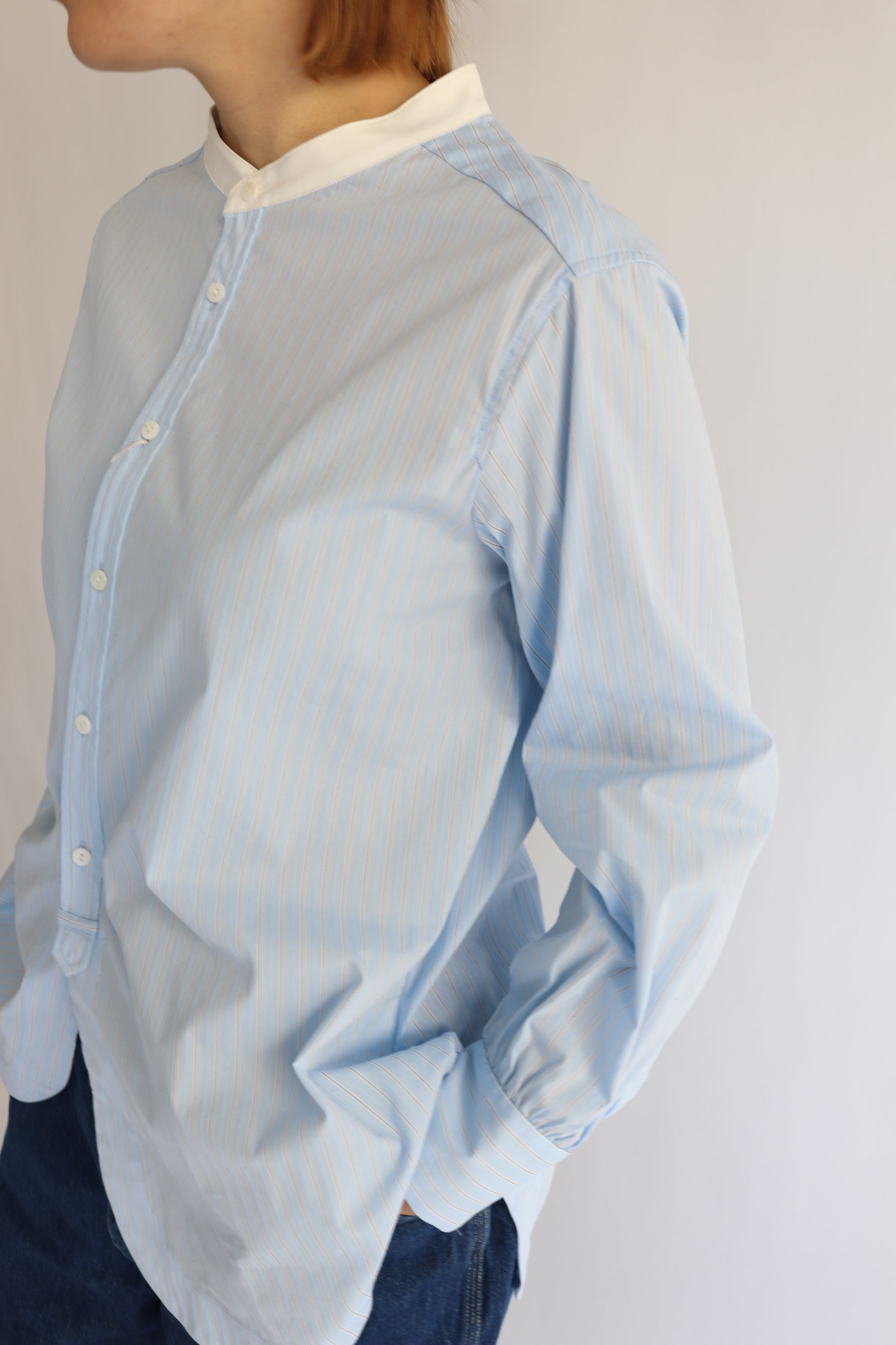 クレリックシャツとはもともと英国発祥の衿や袖が白い生地で切り替えられたマニッシュなシャツですが、裾をラウンドさせ、袖のボリュームを調整したことでハンサムかつ女性らしい仕上がりに。