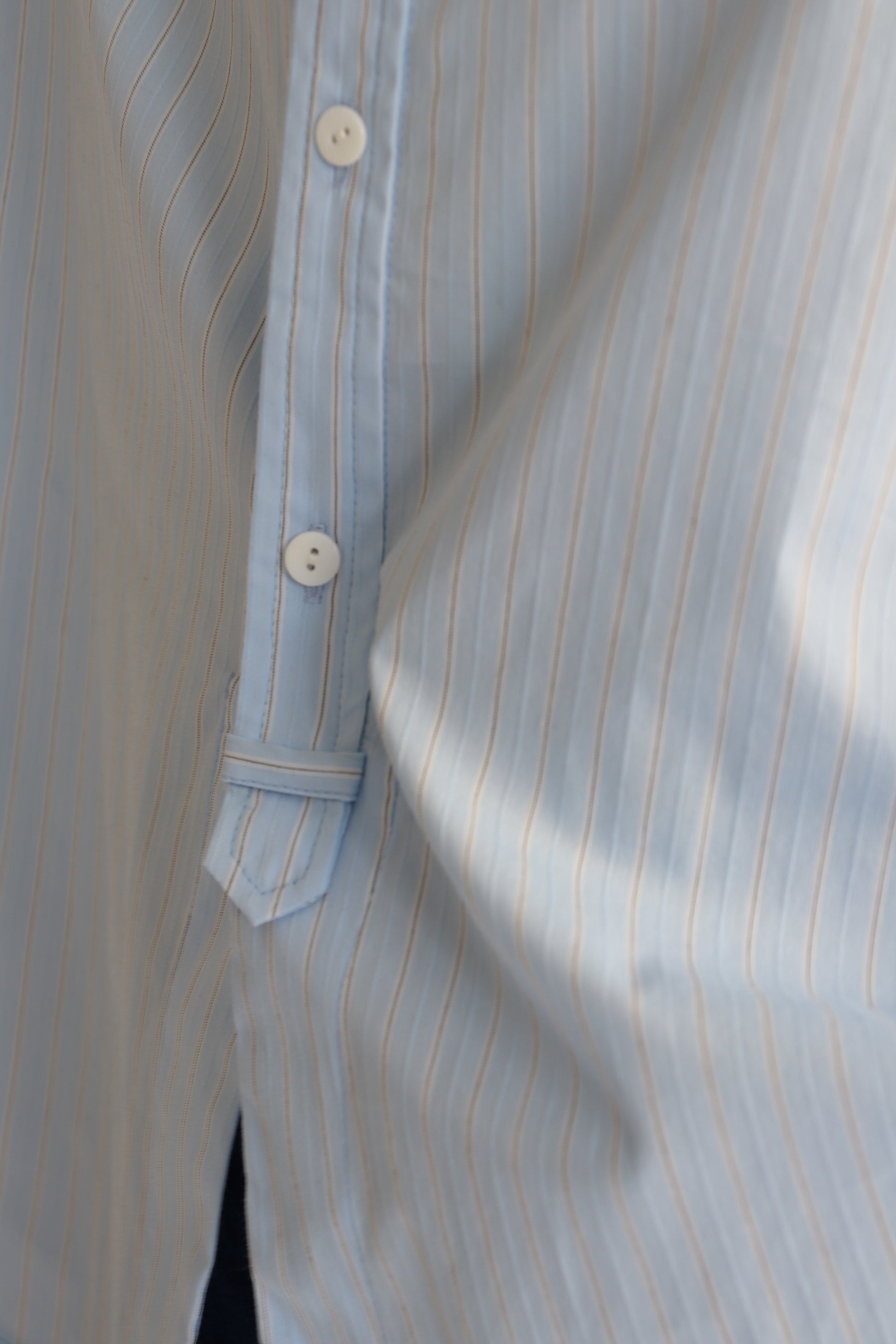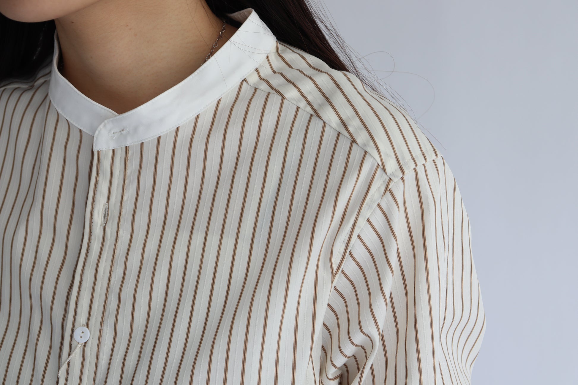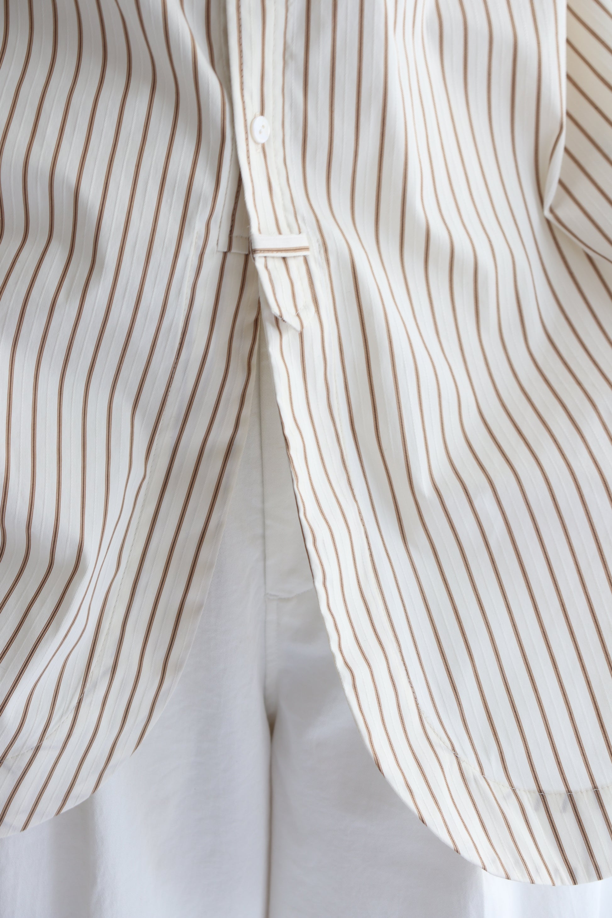 春らしくさわやかなストライプ生地を使用したクレリックシャツ。どんな方にも似合う様に色合いと柄のピッチにこだわりました。