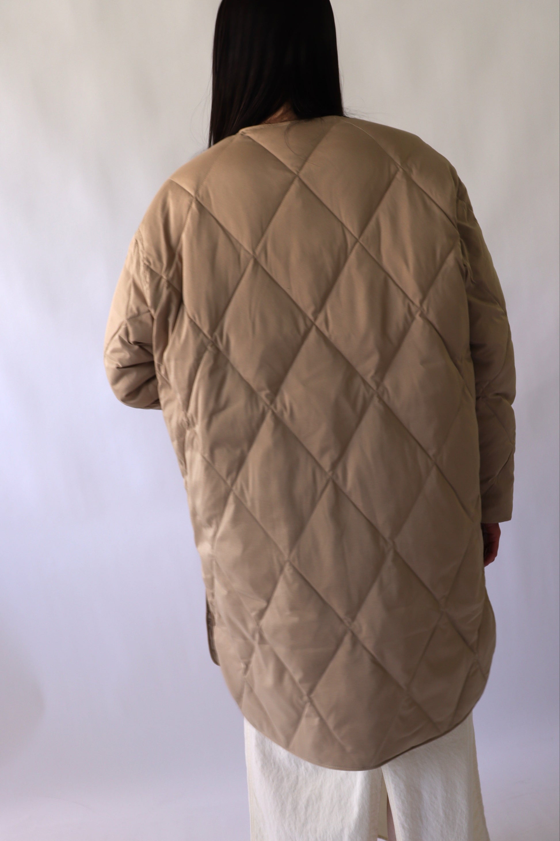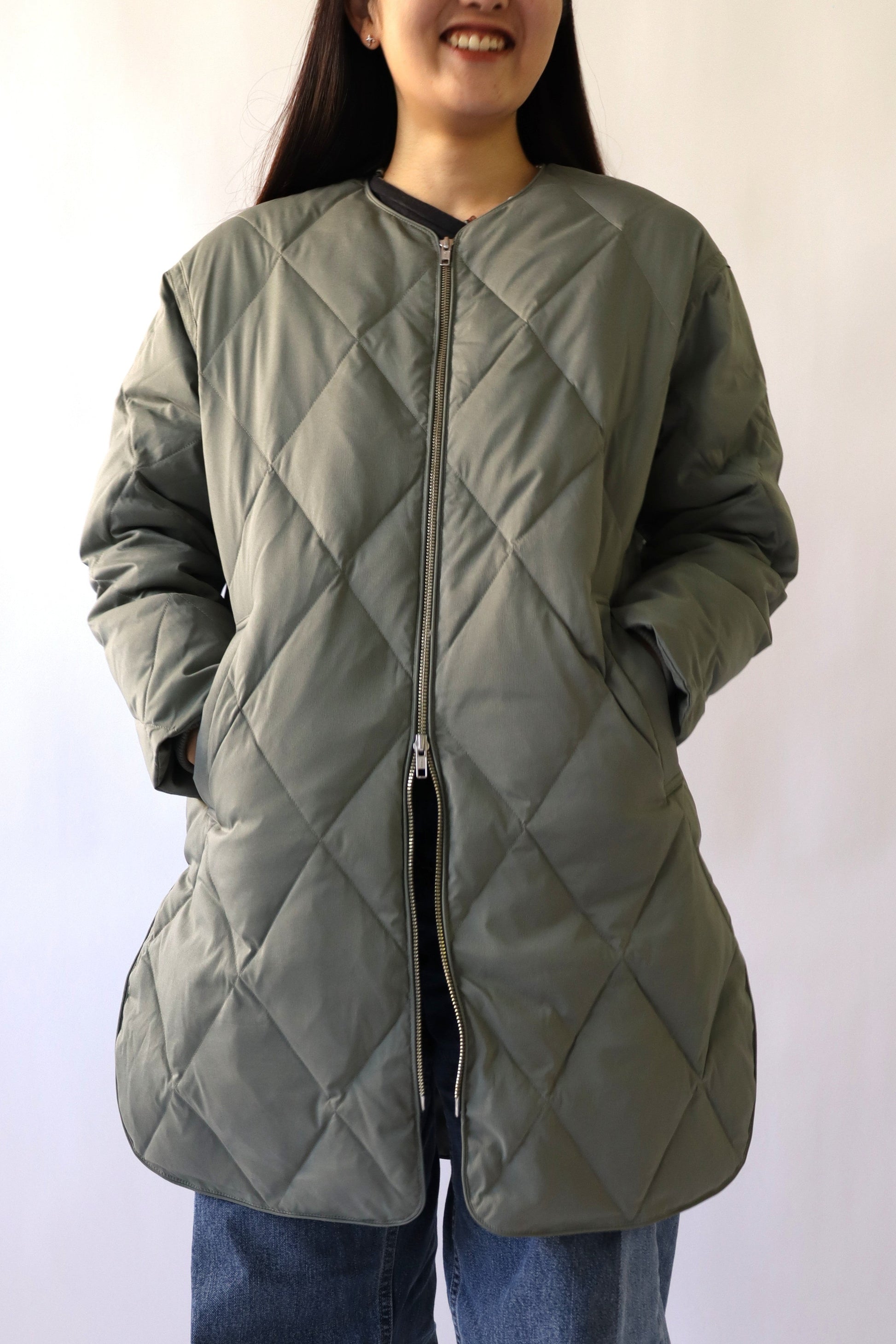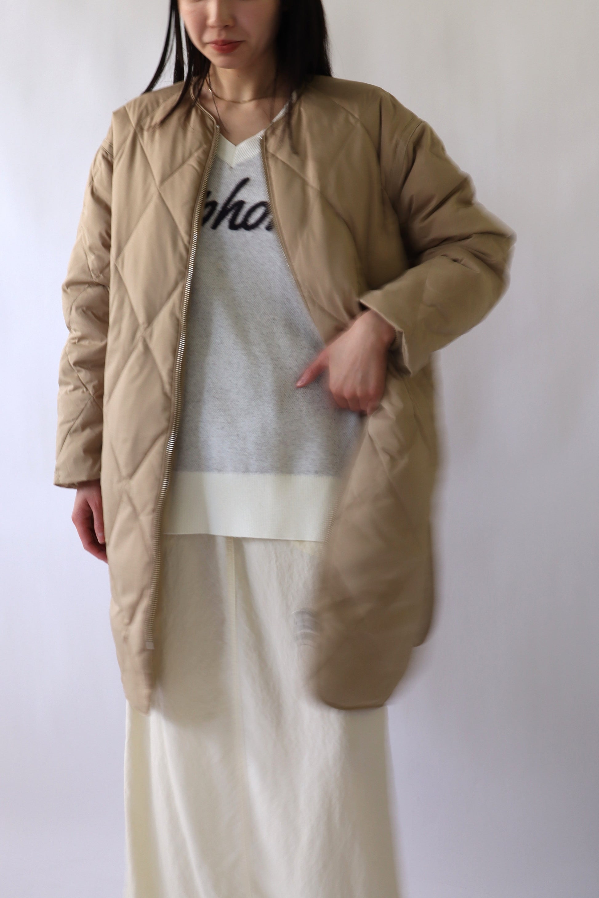 中綿は贅沢にダウン80%、フェザー20%を使用し、ボリュームを抑えた分量に調整したことで、着膨れ感を気にせず着ていただくことができます。また、お尻がすっぽり隠れるロング丈でありながら、総重量が700g以下と軽量で着心地も◎