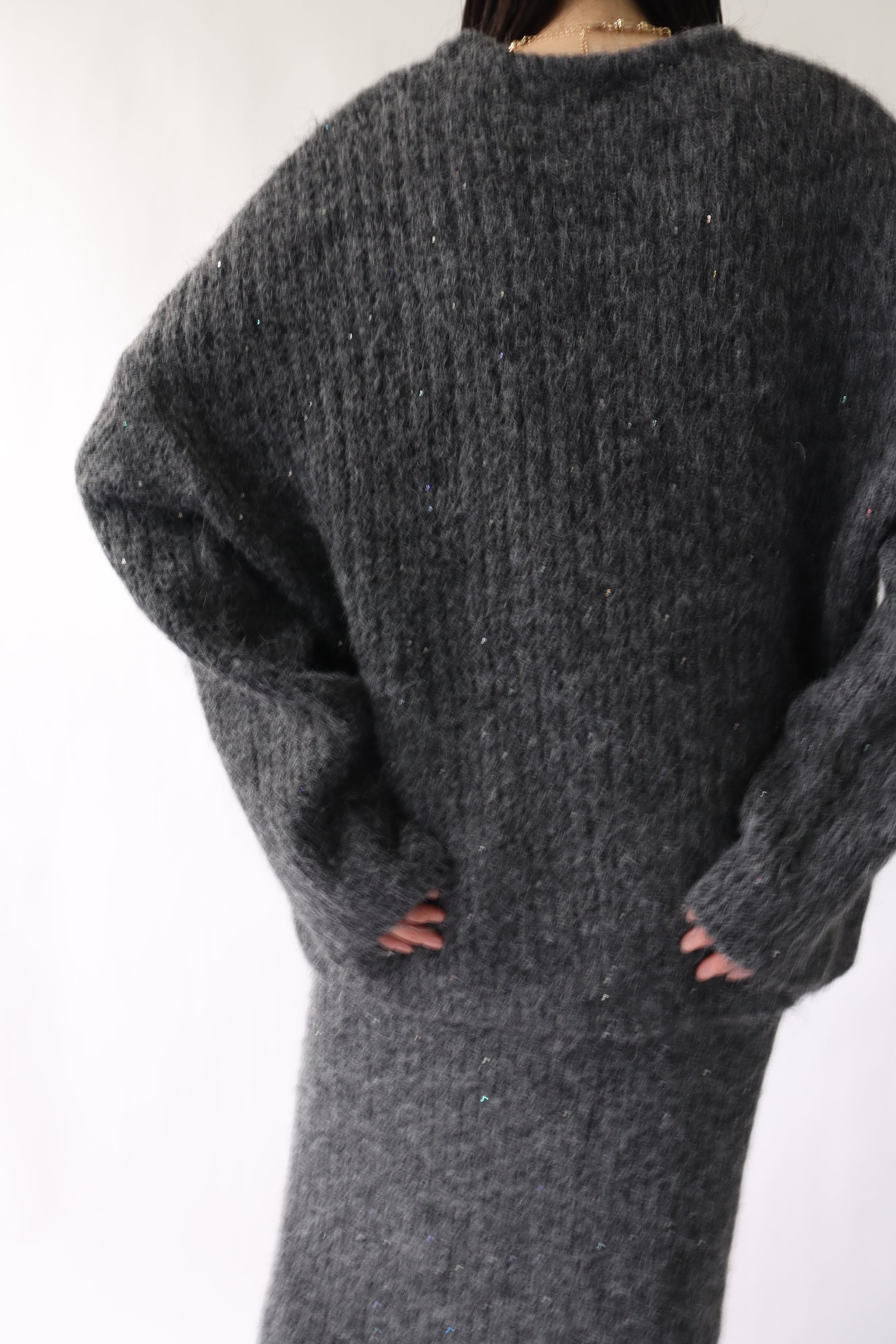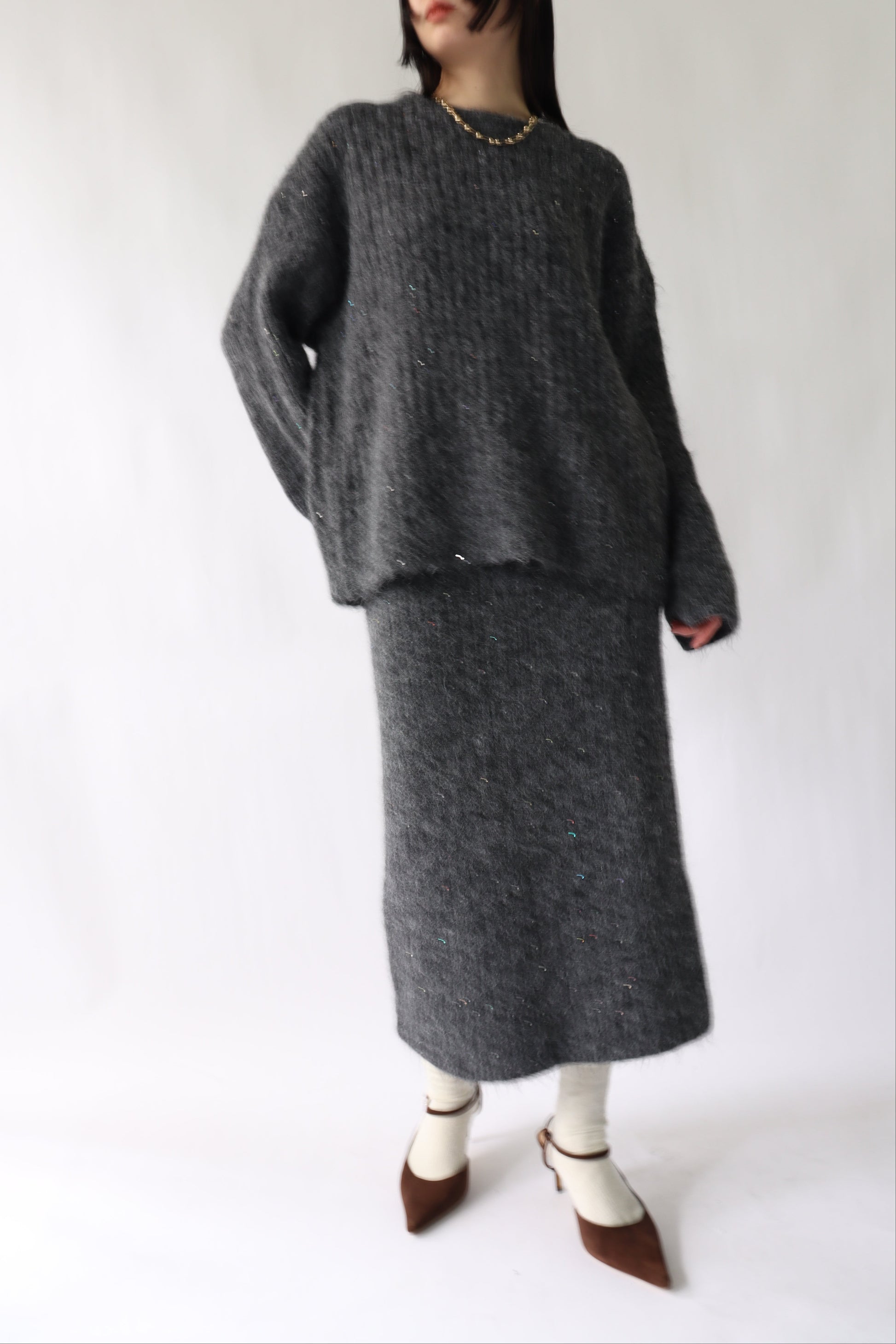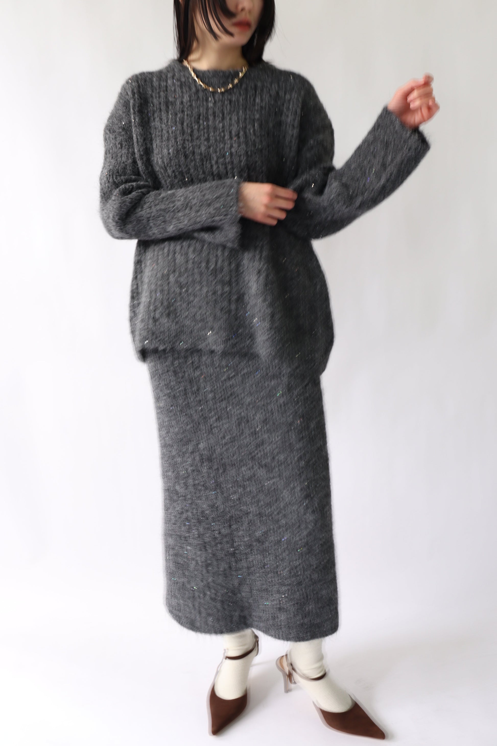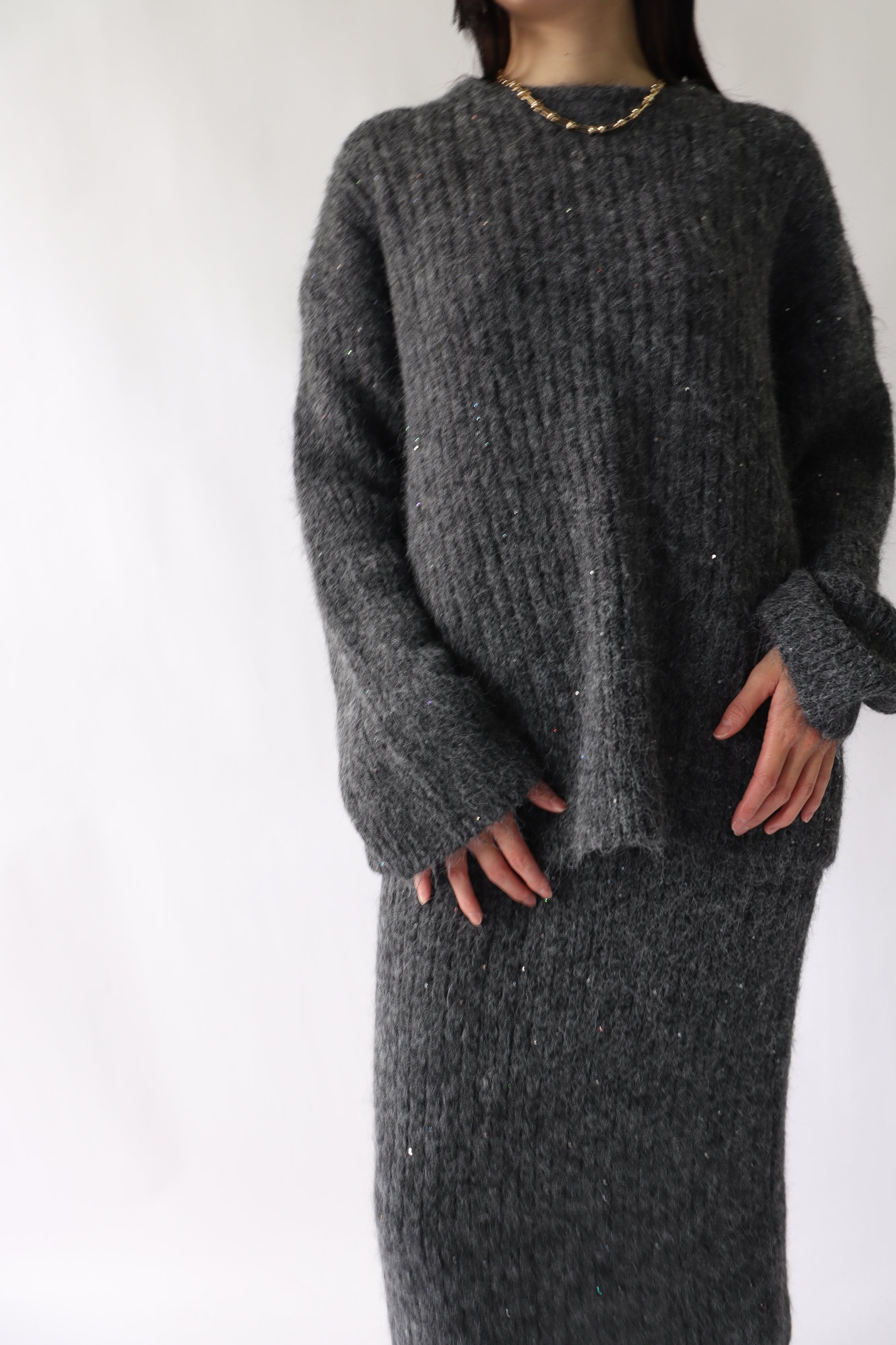立体的な編地に繊細なラメとスパンコールが編み込まれたニットのセットアップ。トップスはやや大きめなサイズ感ですが、スカートのシルエットを調整し、全体的にすっきり&抜け感のあるスタイルになるように仕上げました。スカートはウエストがゴム仕様で着用しやすく、小柄な方や華奢な方にもセットアップでバランス良く着られる丈感に。