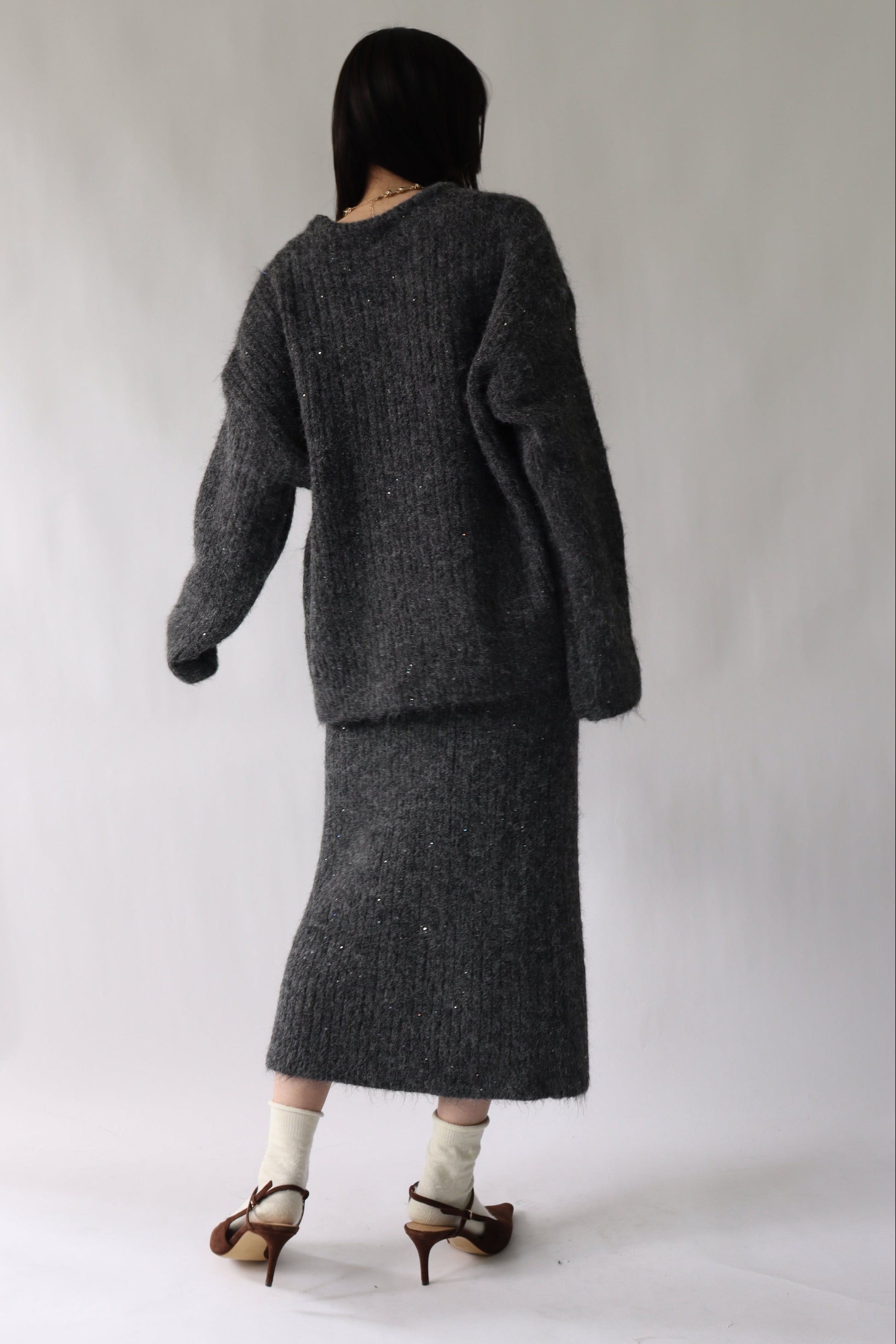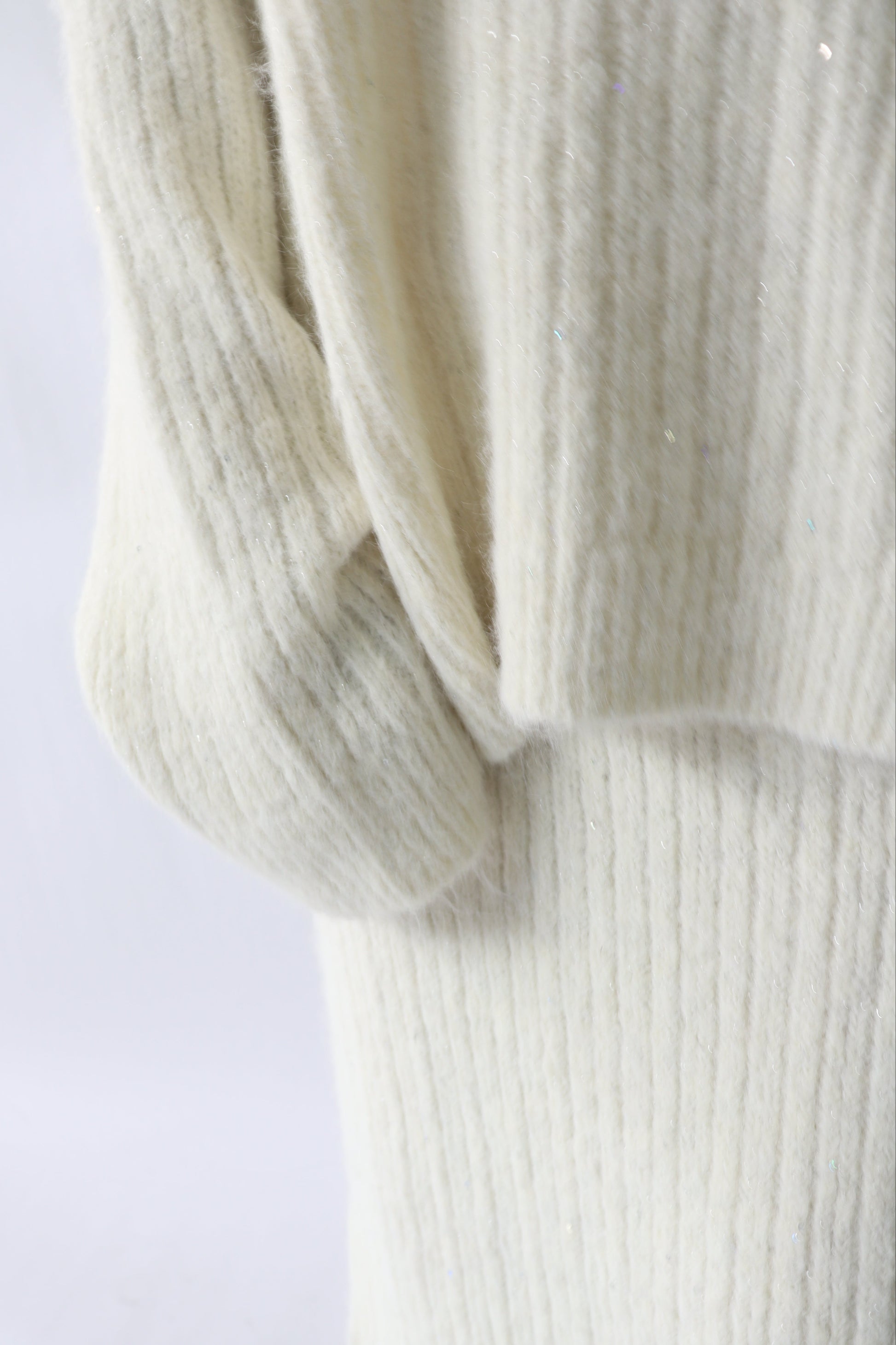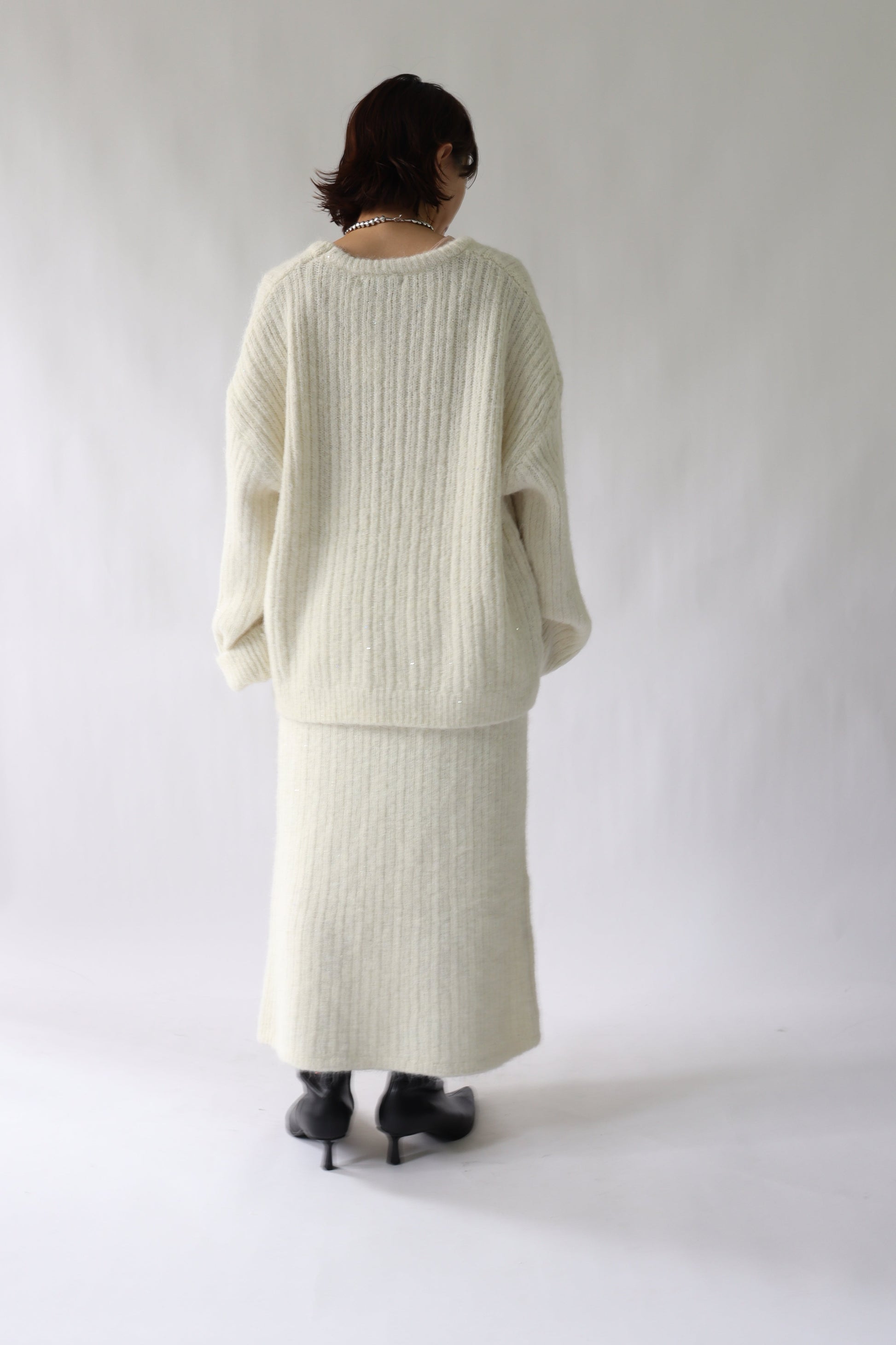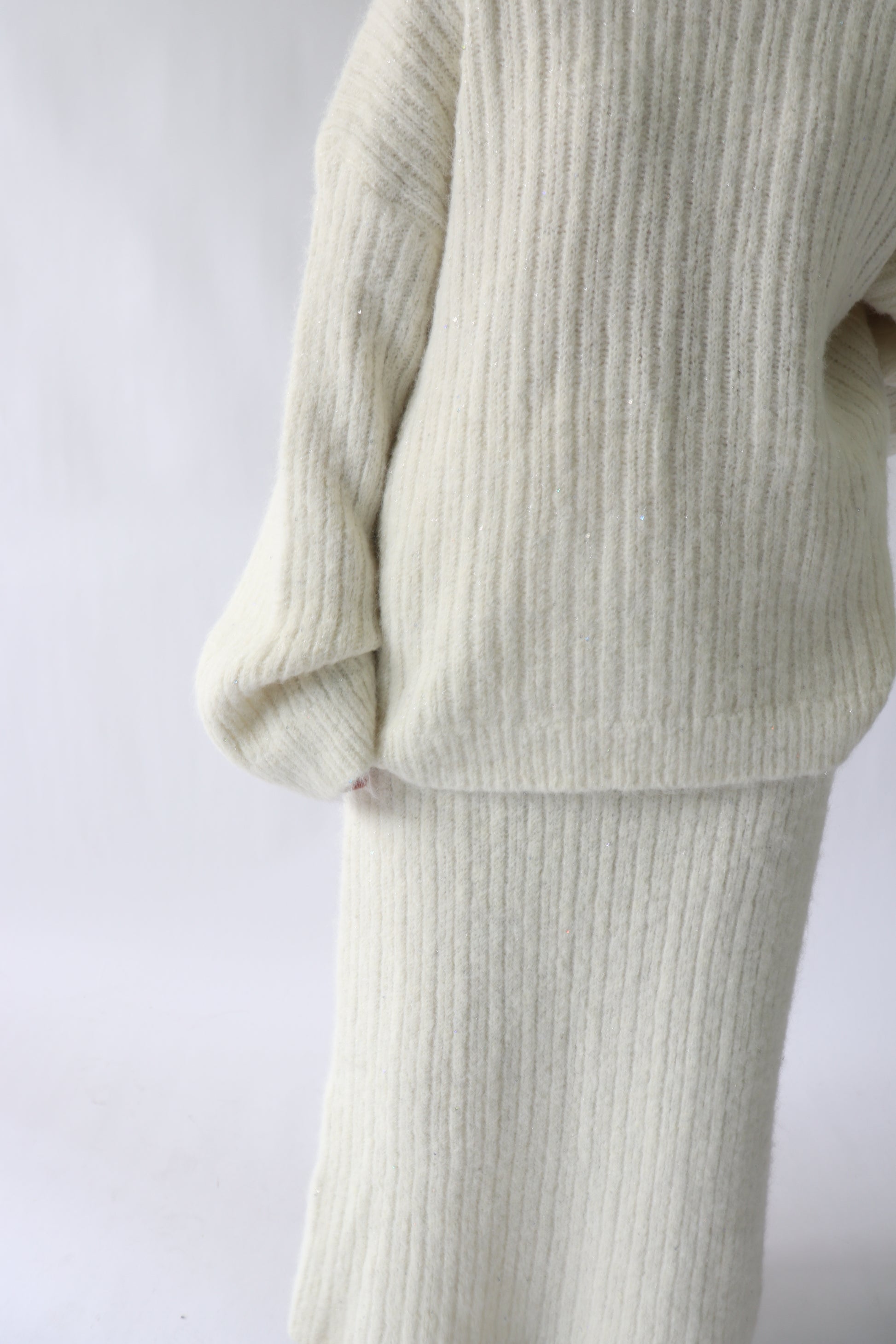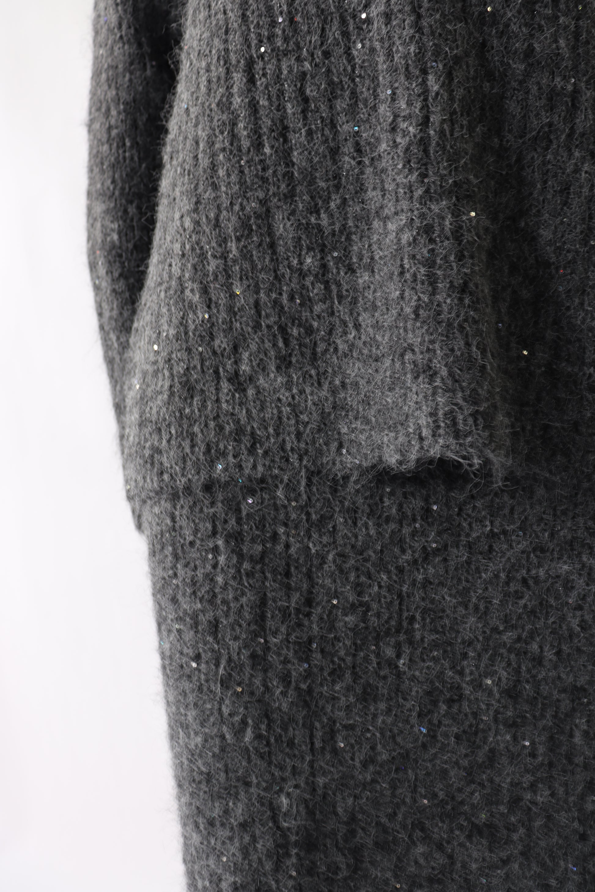 立体的な編地に繊細なラメとスパンコールが編み込まれたニットのセットアップ。トップスはやや大きめなサイズ感ですが、スカートのシルエットを調整し、全体的にすっきり&抜け感のあるスタイルになるように仕上げました。スカートはウエストがゴム仕様で着用しやすく、小柄な方や華奢な方にもセットアップでバランス良く着られる丈感に。