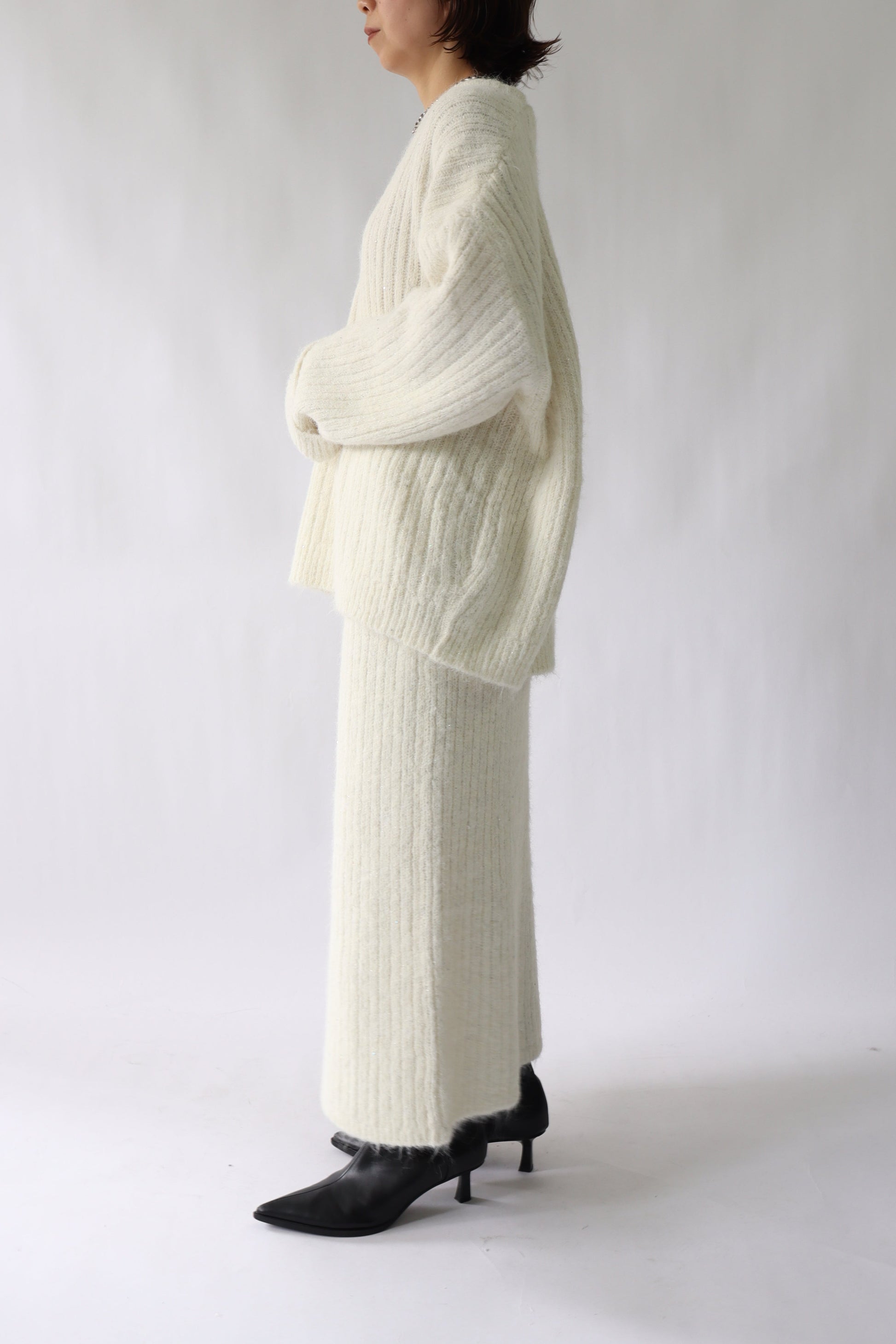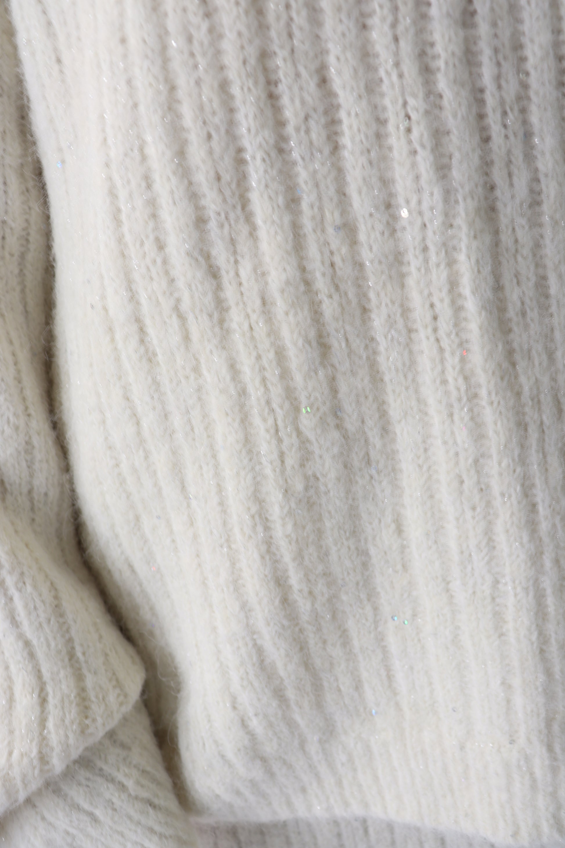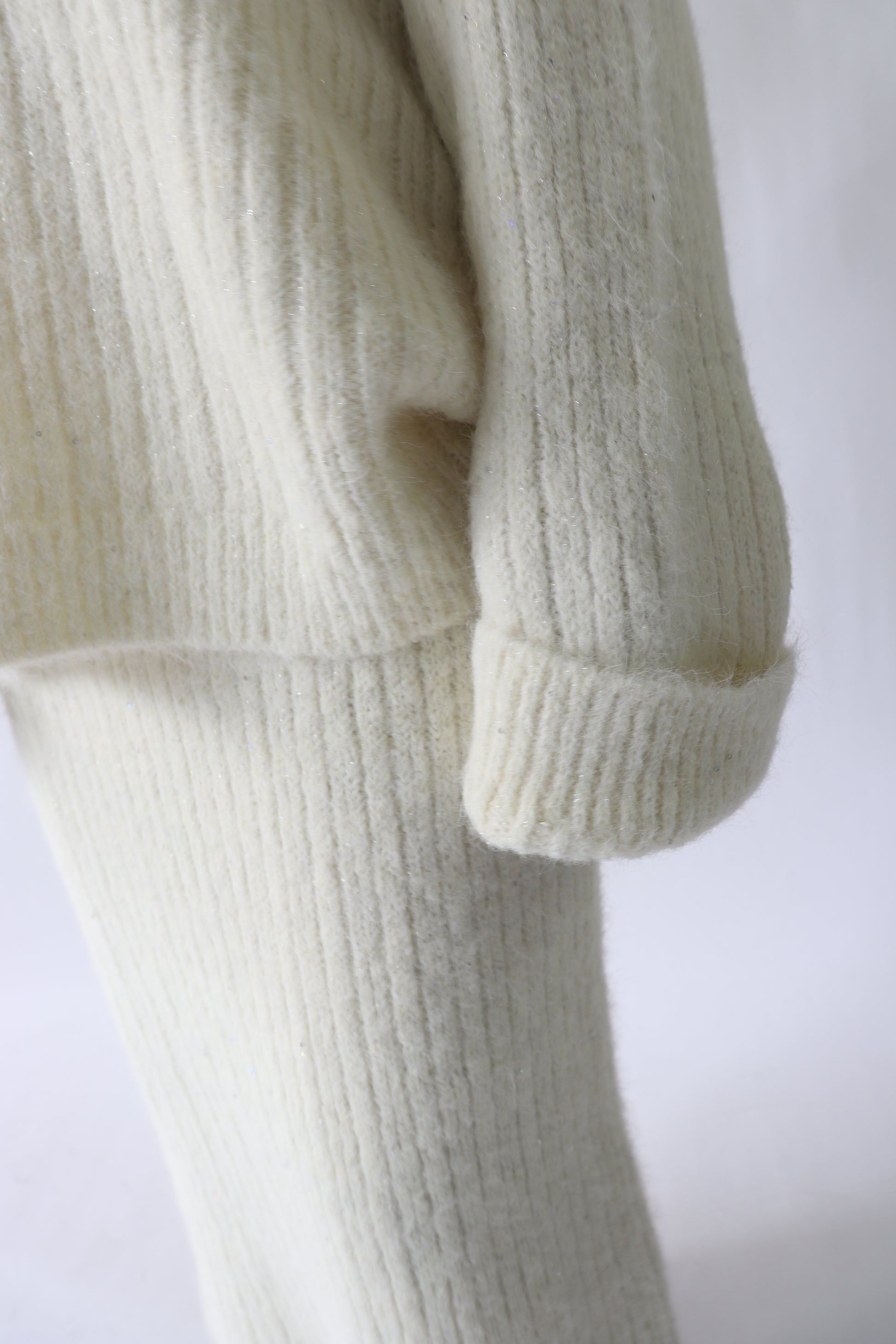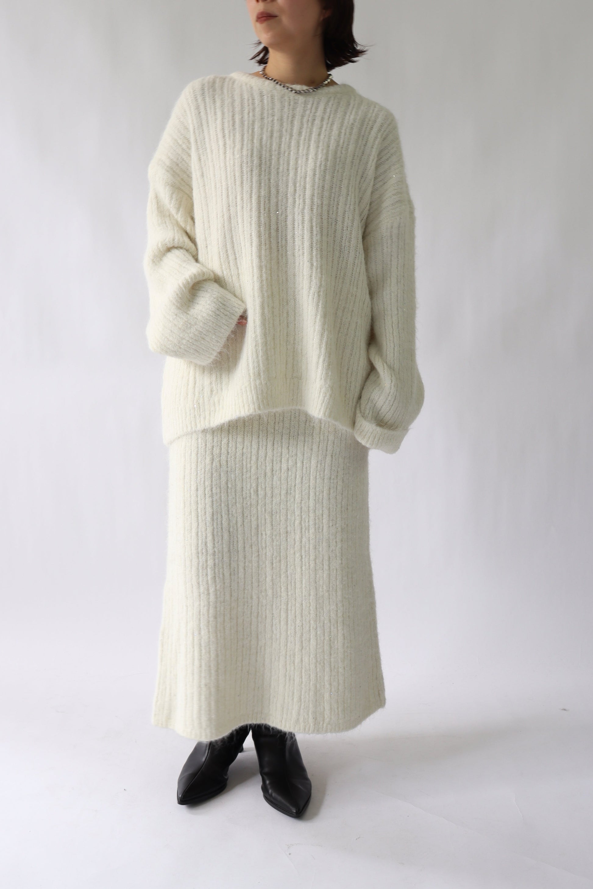 立体的な編地に繊細なラメとスパンコールが編み込まれたニットのセットアップ。トップスはやや大きめなサイズ感ですが、スカートのシルエットを調整し、全体的にすっきり&抜け感のあるスタイルになるように仕上げました。スカートはウエストがゴム仕様で着用しやすく、小柄な方や華奢な方にもセットアップでバランス良く着られる丈感に。