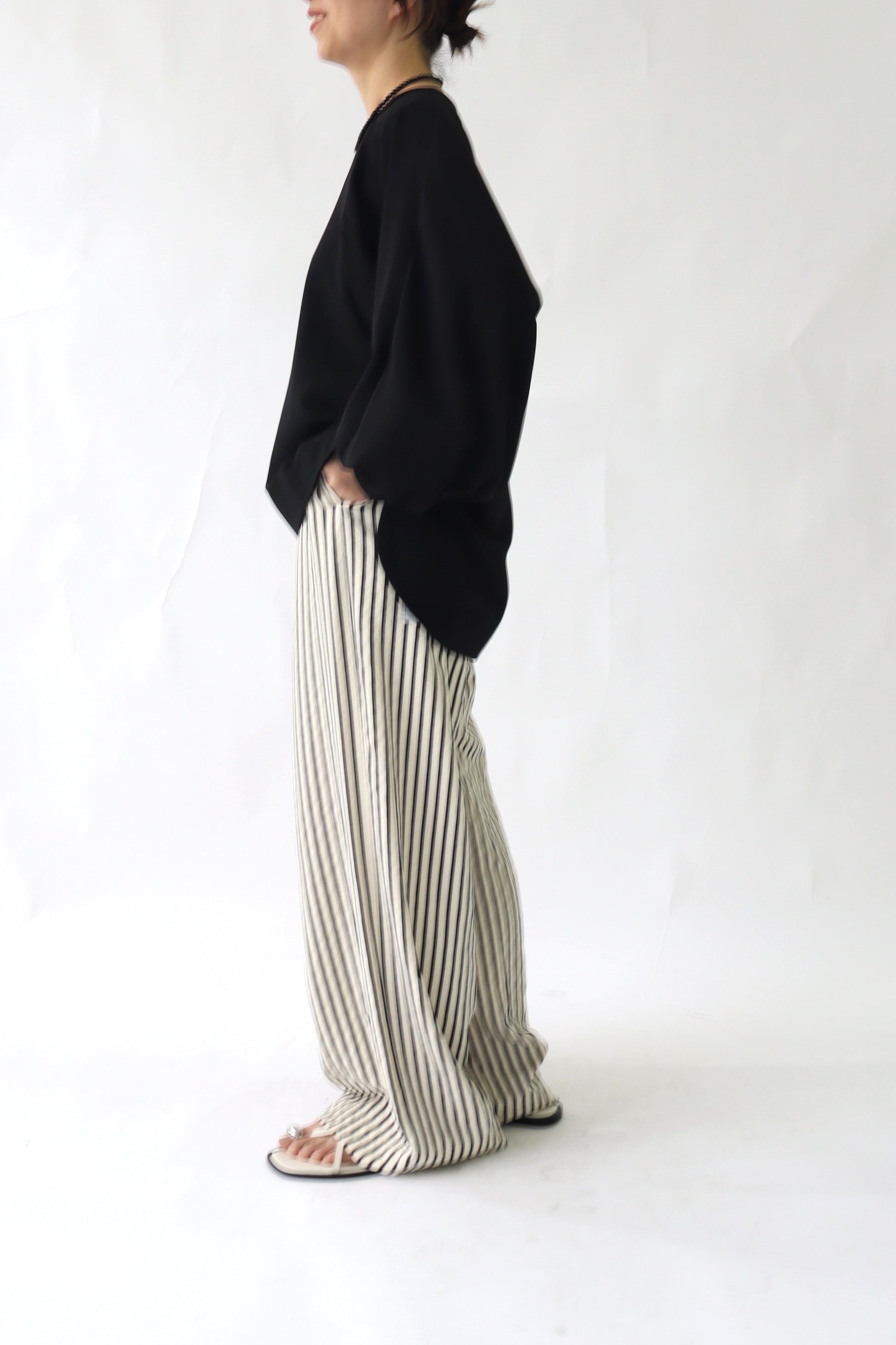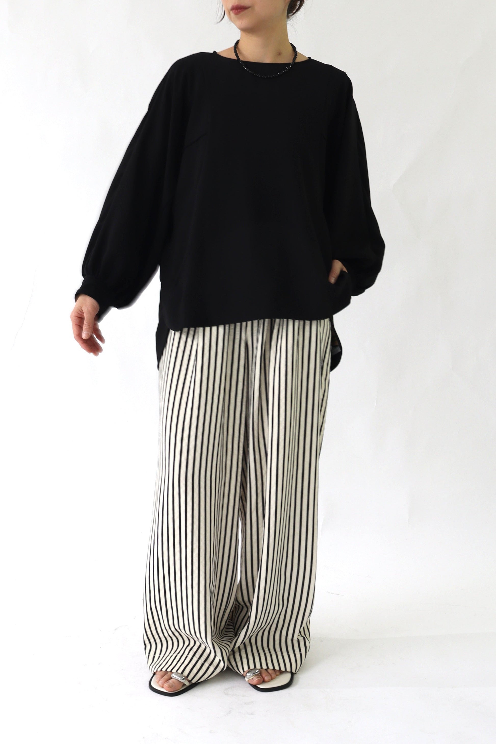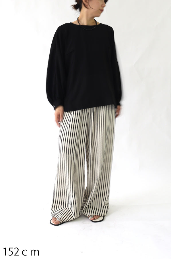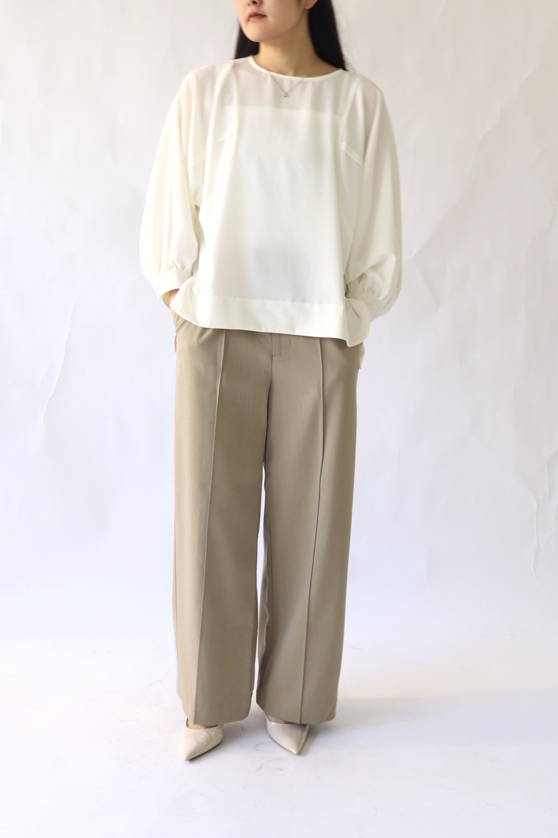 ゆとりあるシルエットですが、通勤にも使えるきちんと感もあり、しわになりにくい素材を使用しているので普段使いにも重宝します。