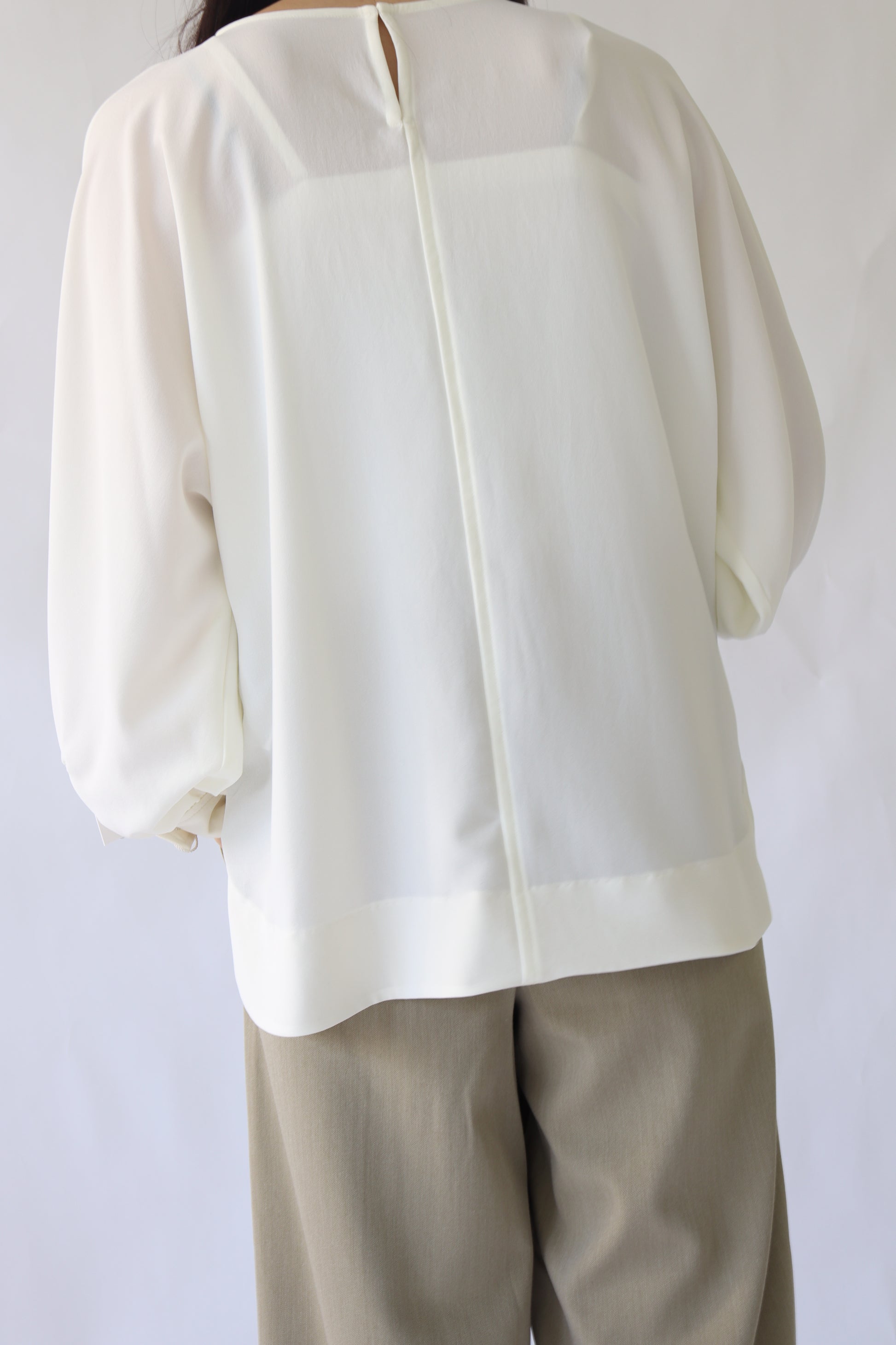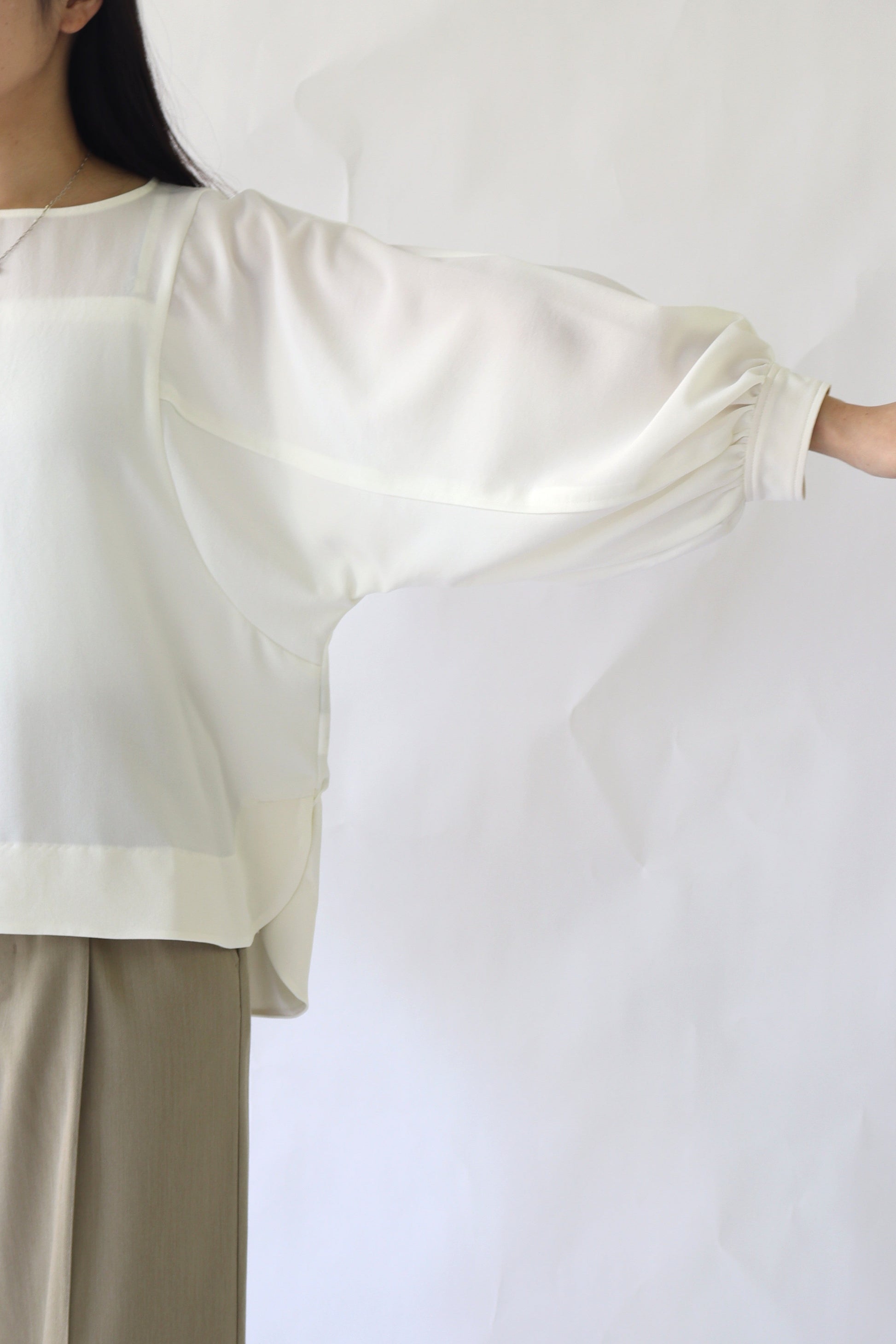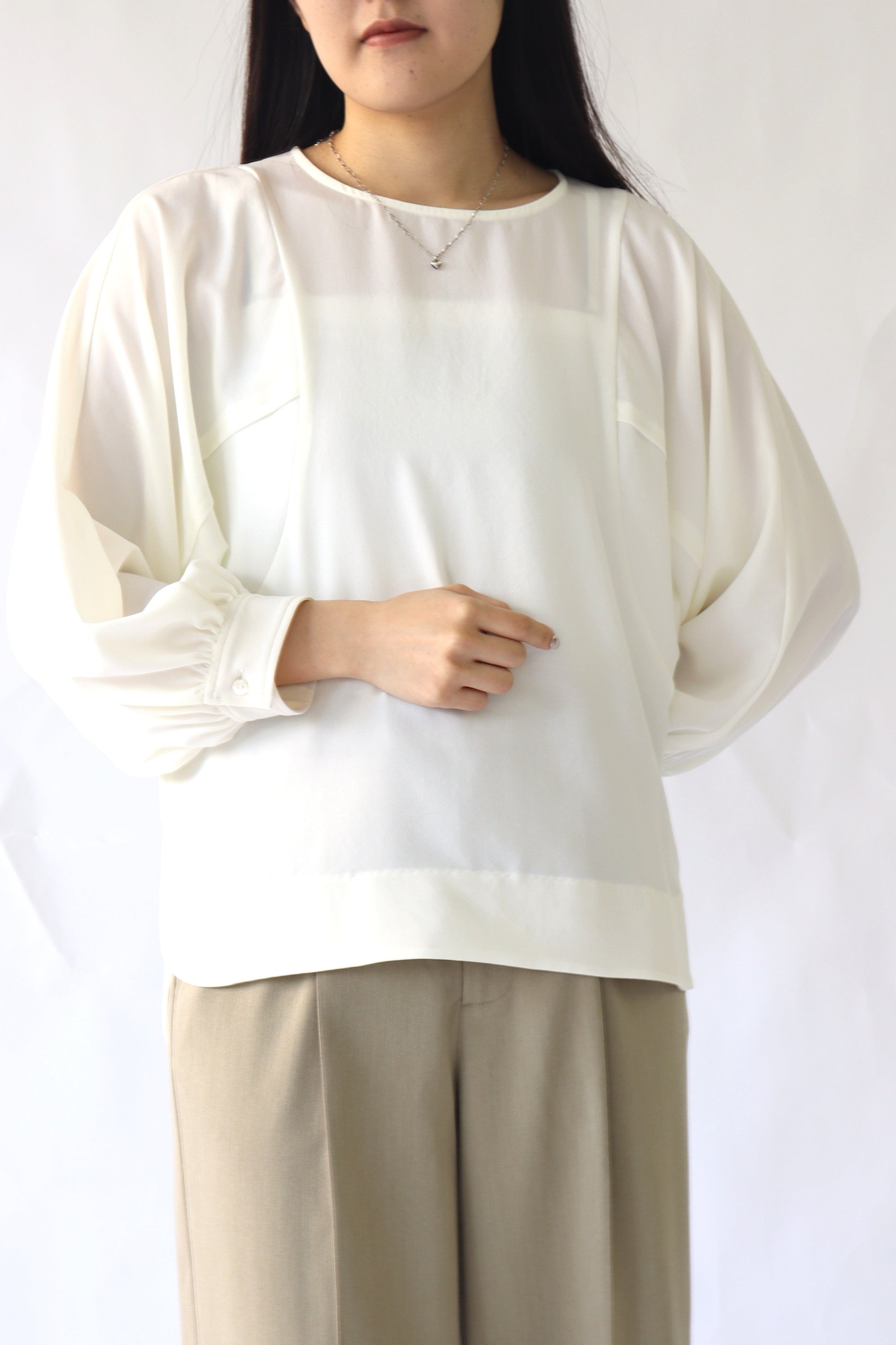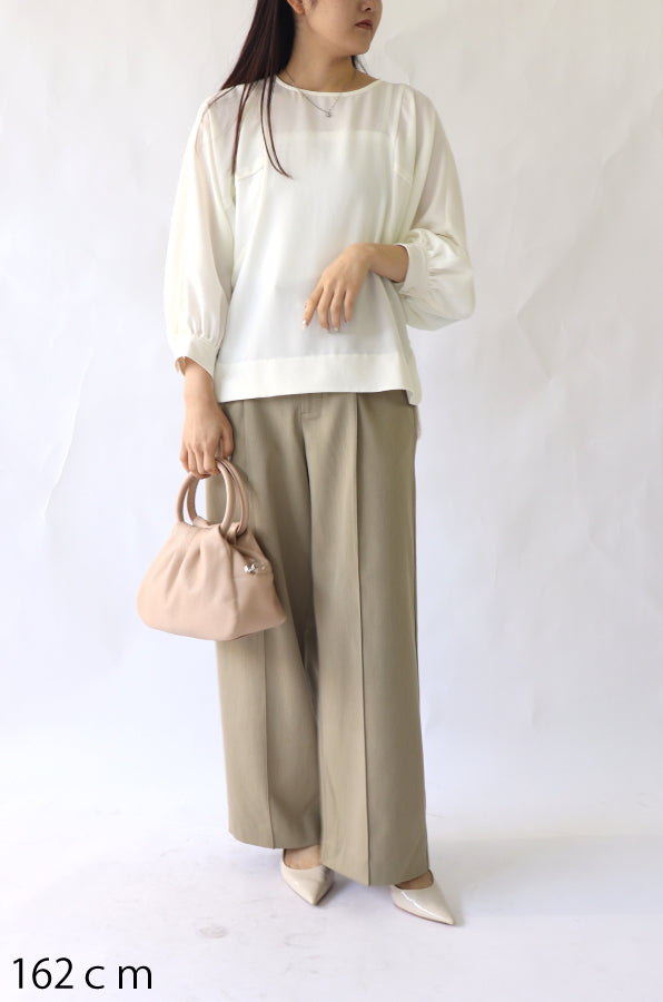 女性らしい印象のドルマンスリーブ風のブラウス。ぐっと入った肩幅と袖のボリュームでスタイルアップ効果が期待でき、凝った1品に仕上がっています。
