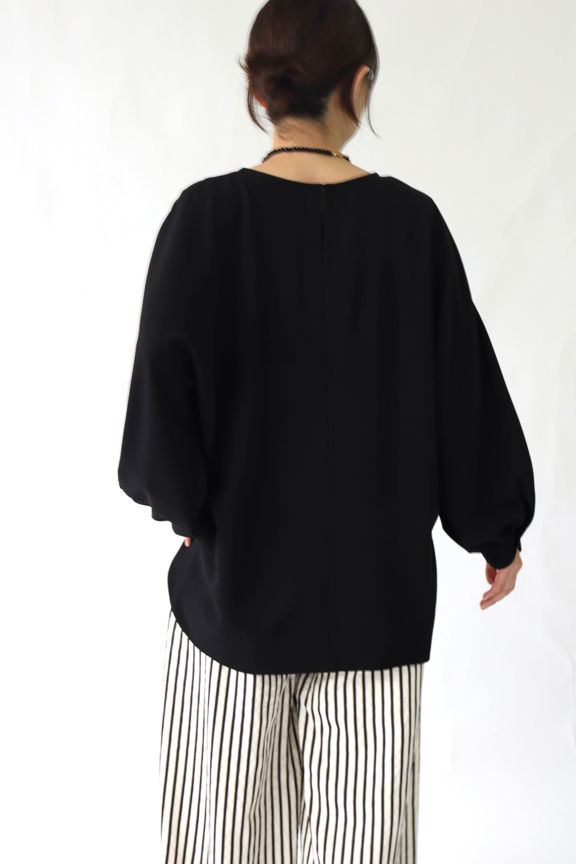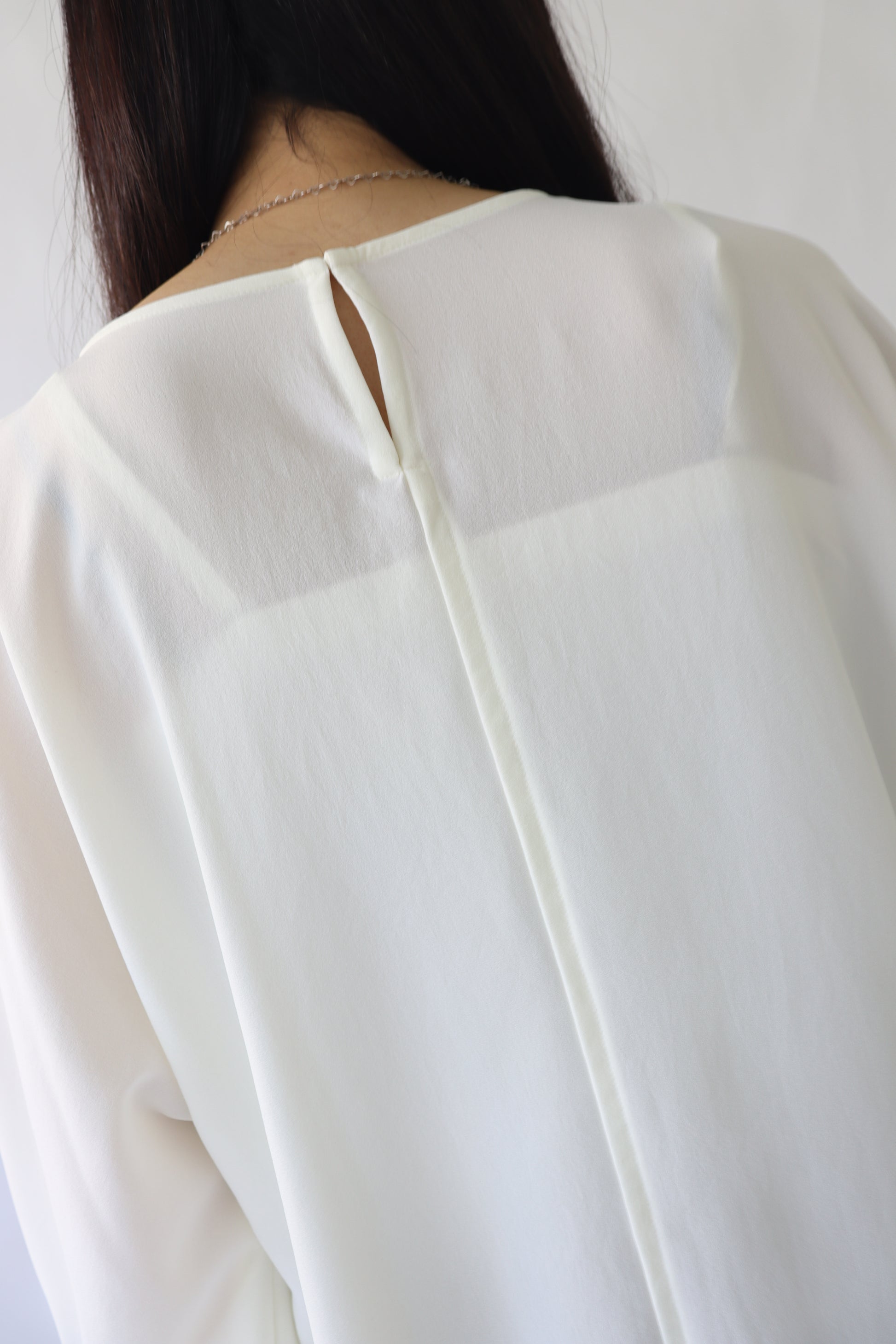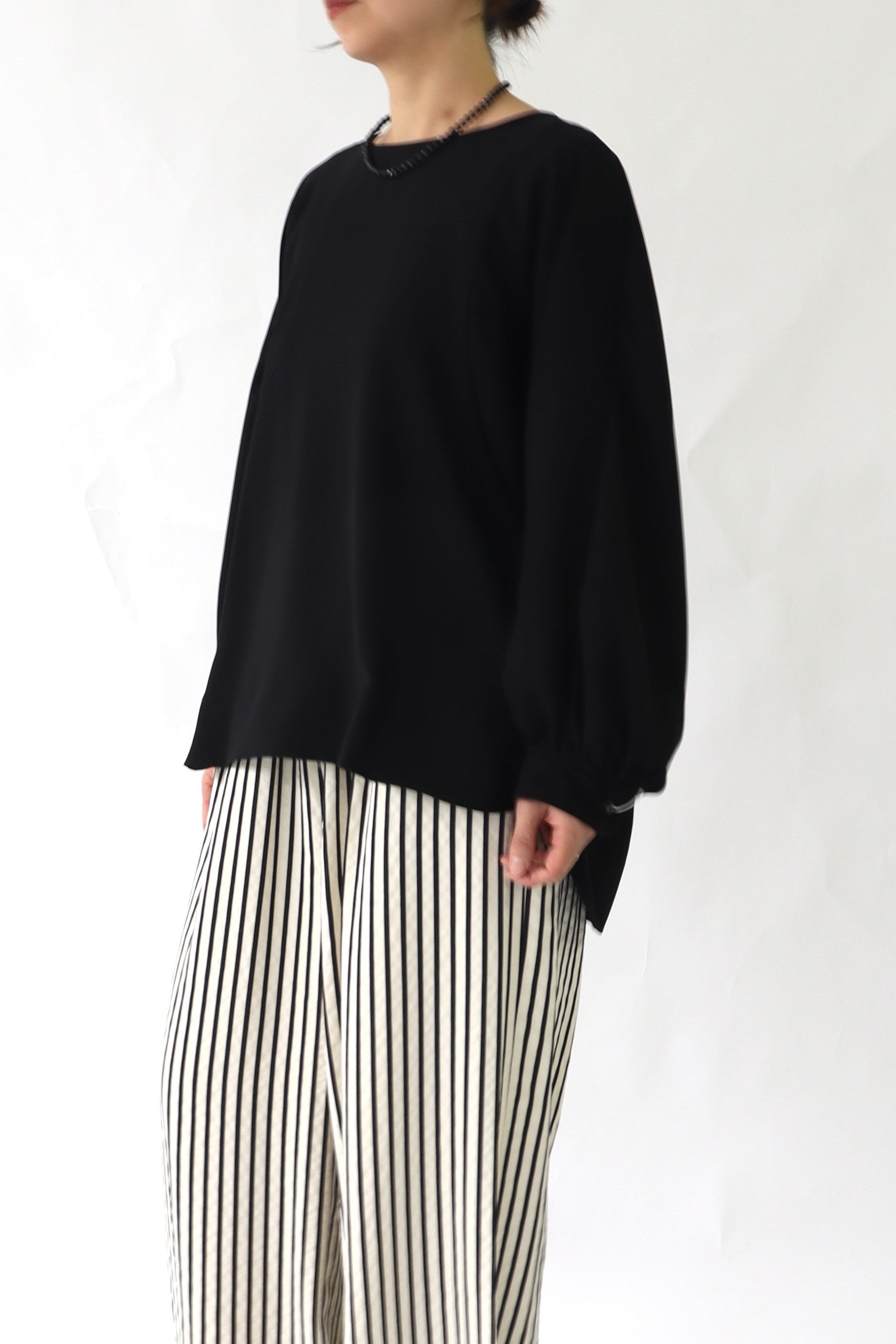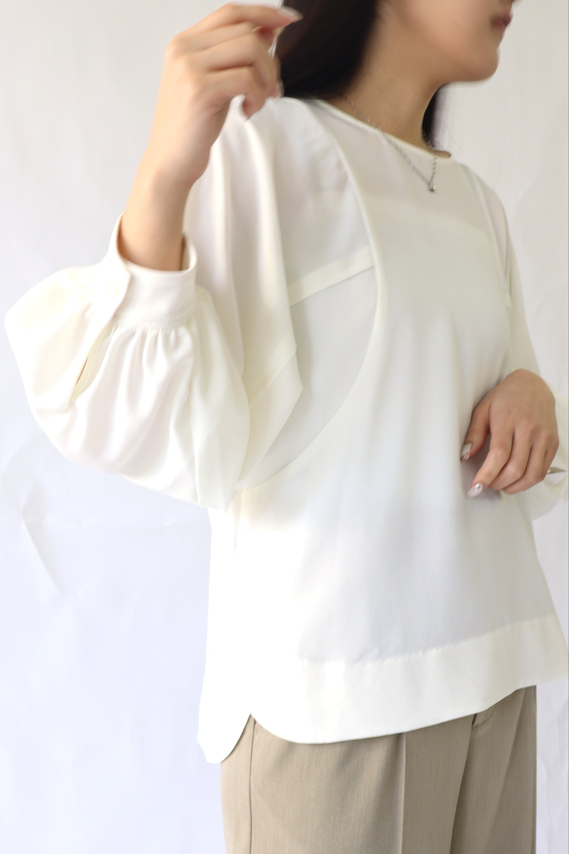 女性らしい印象のドルマンスリーブ風のブラウス。ぐっと入った肩幅と袖のボリュームでスタイルアップ効果が期待でき、凝った1品に仕上がっています。