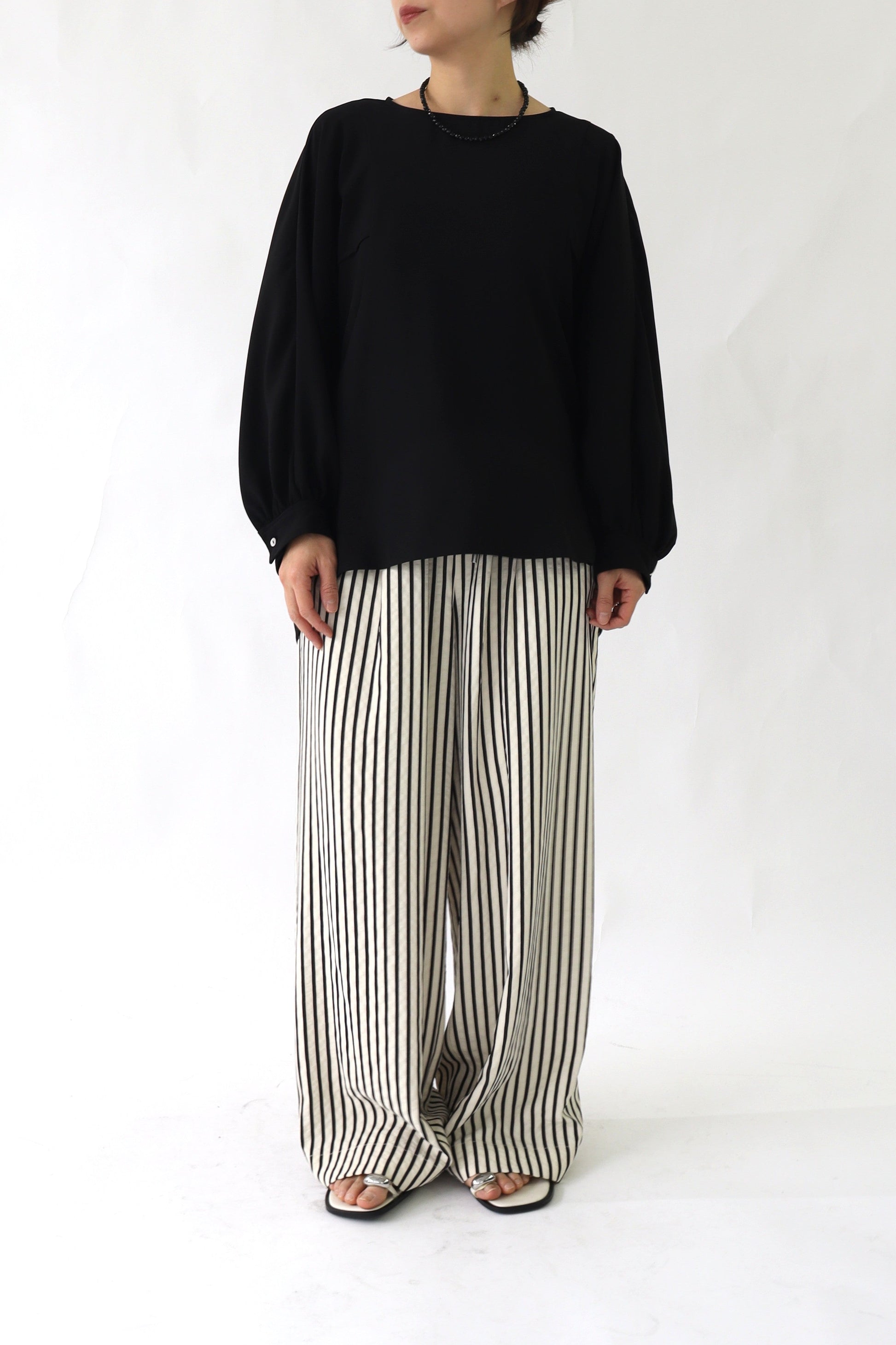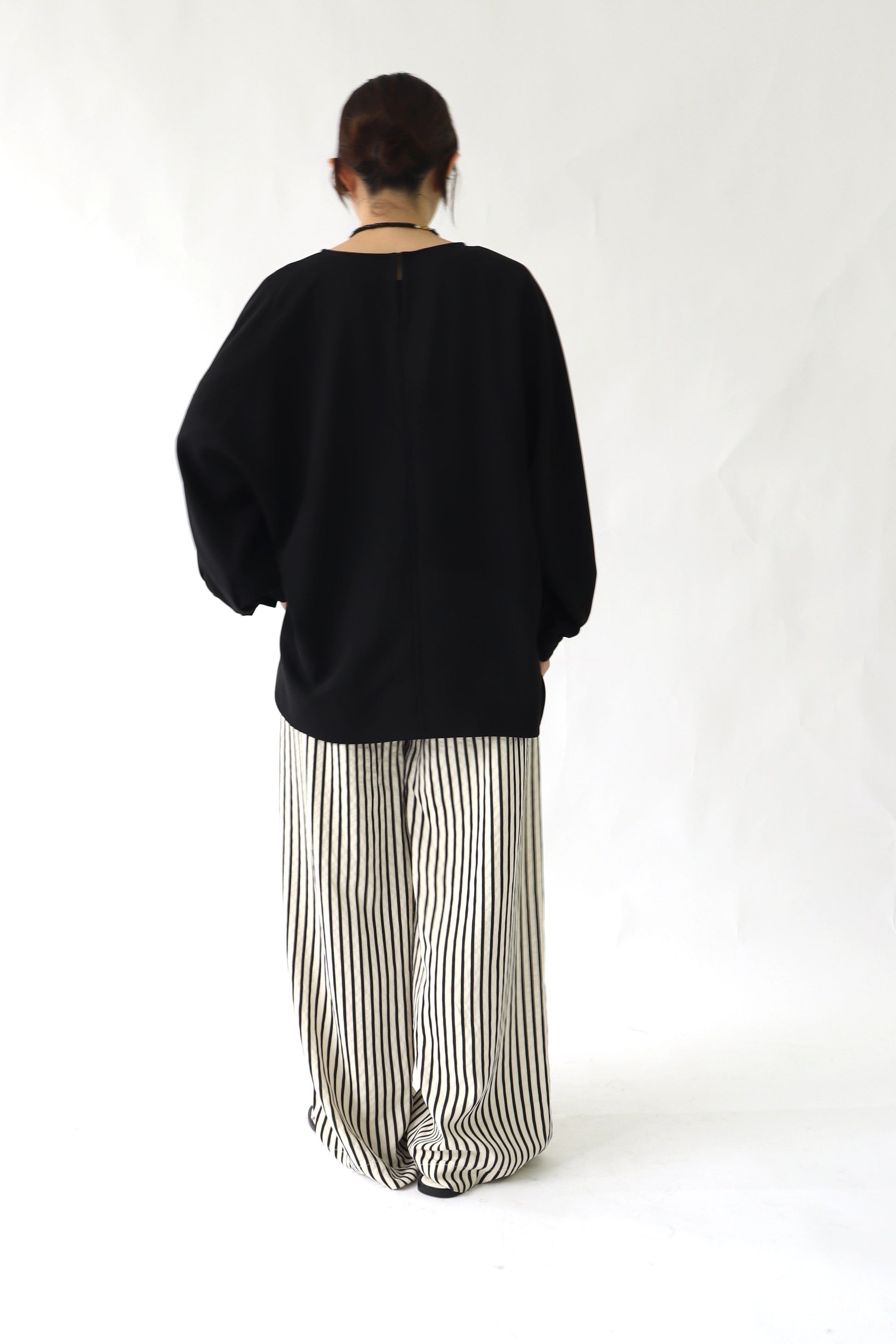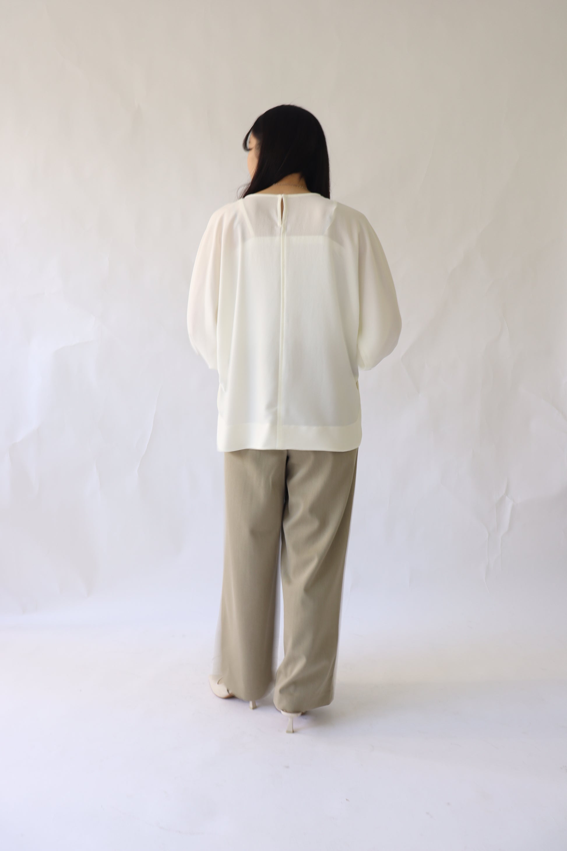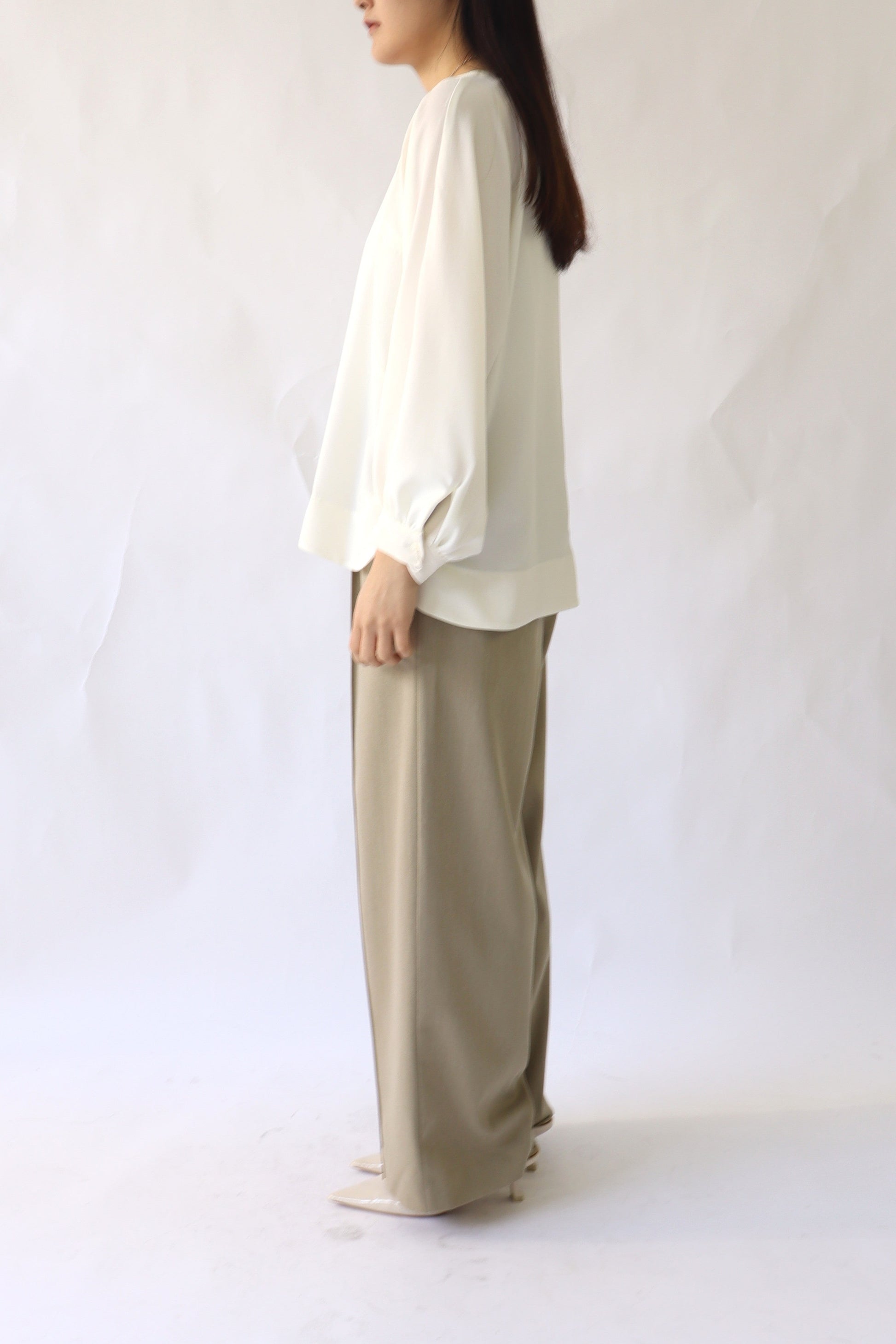 女性らしい印象のドルマンスリーブ風のブラウス。ぐっと入った肩幅と袖のボリュームでスタイルアップ効果が期待でき、凝った1品に仕上がっています。