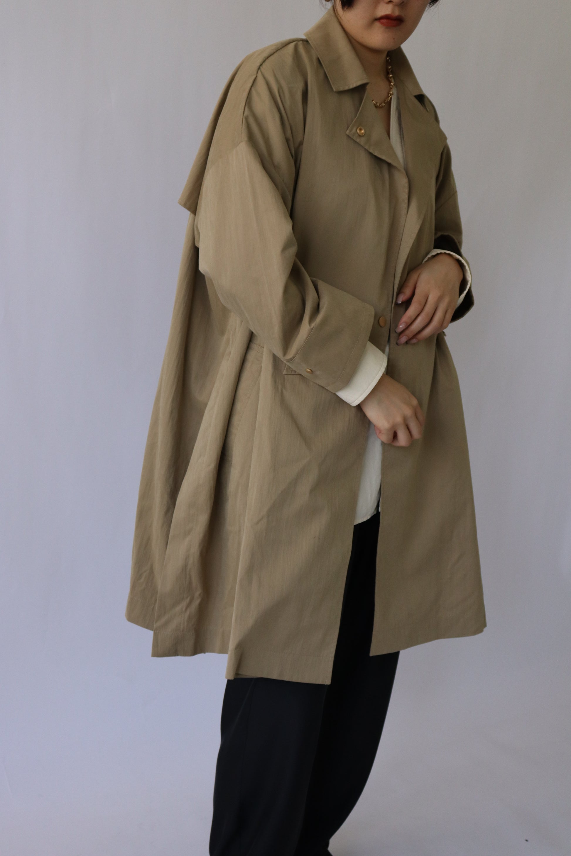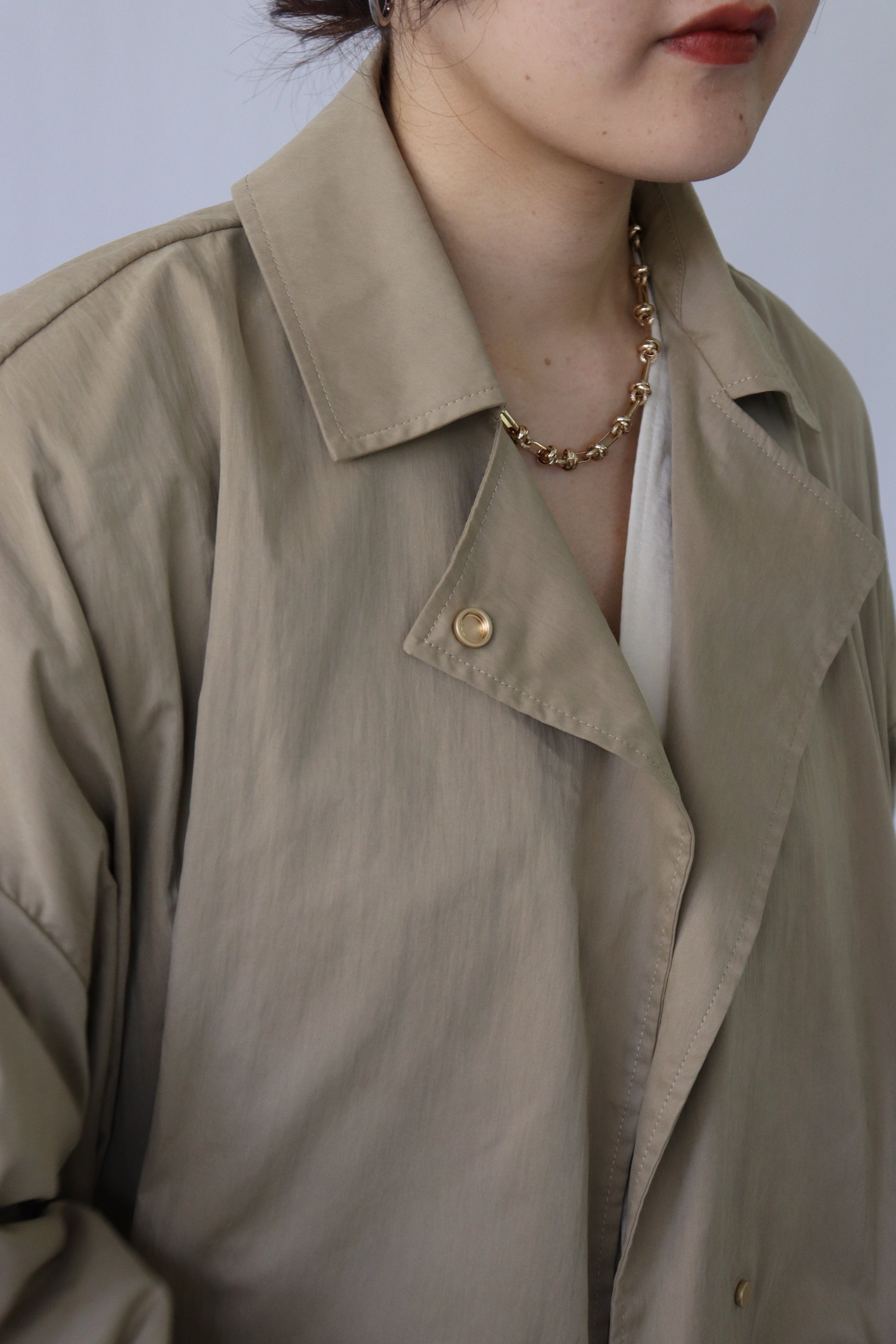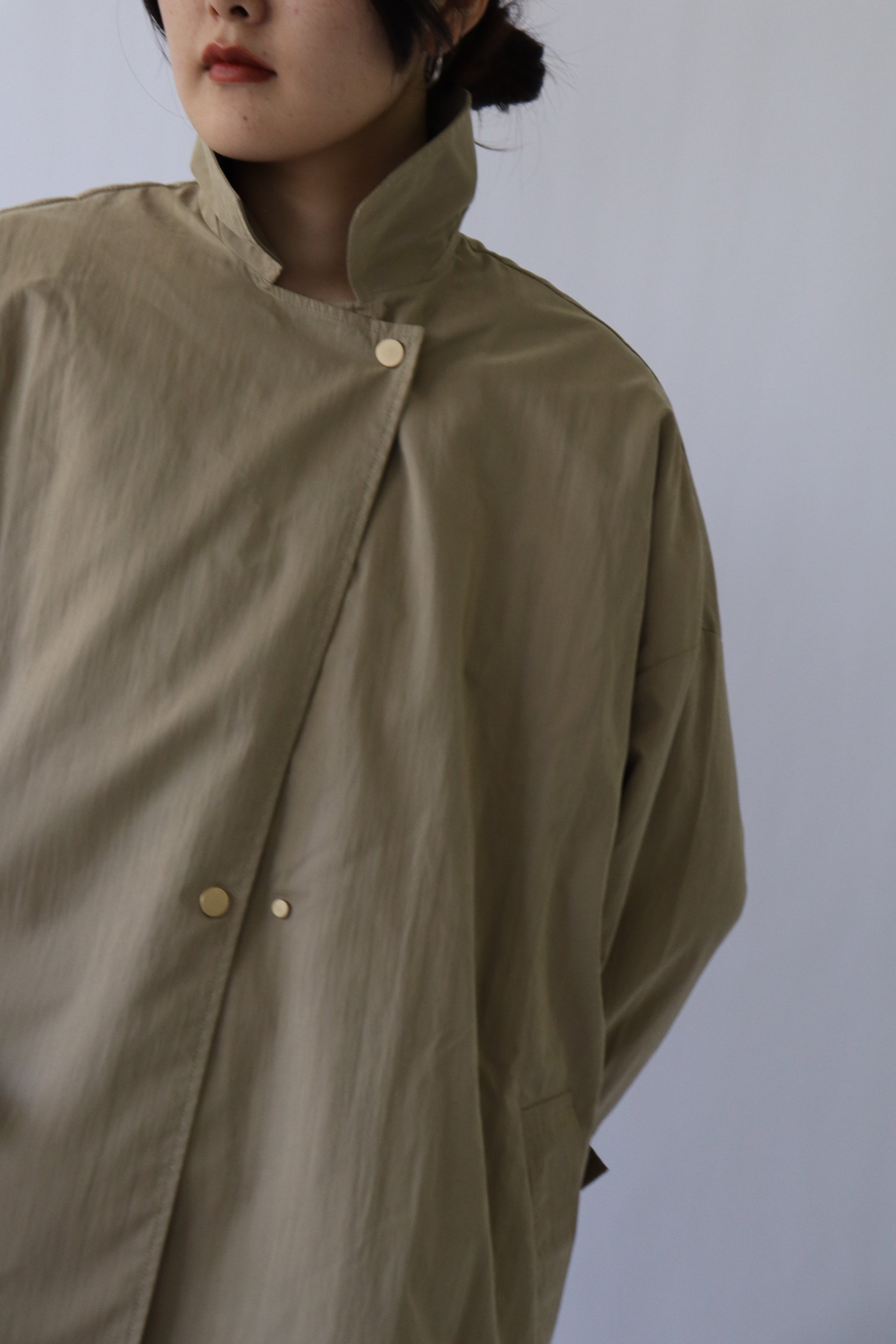 程よい張り感と落ち感が大人っぽいライトアウター。ナイロン混のフィブリルタッチの生地が、表情豊かに秋のムードを高めてくれる人気の商品です。オーバーサイズなので、秋口はもちろん、インナーに厚手の物もお召しいただけ、長い期間活躍してくれるアイテムです。