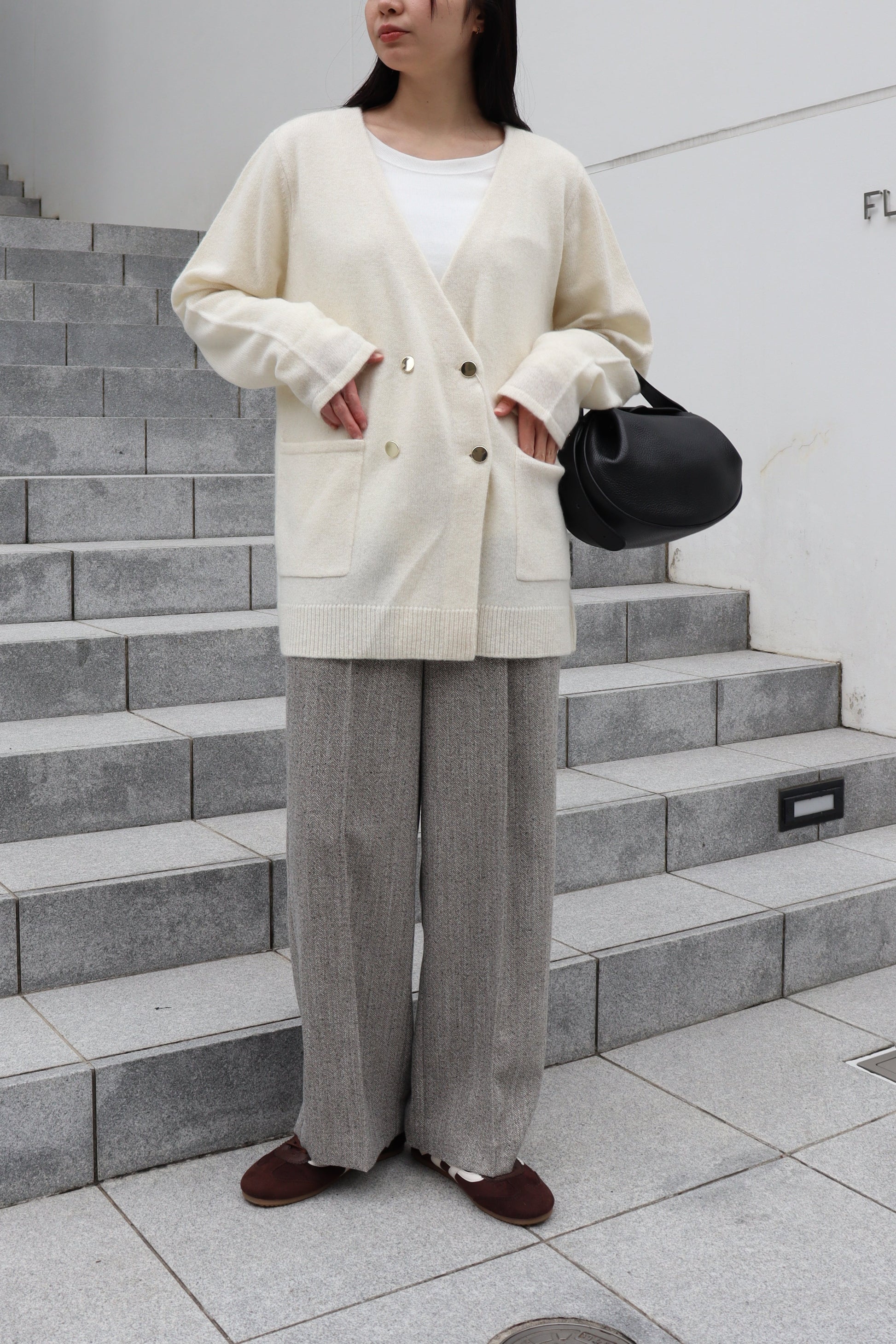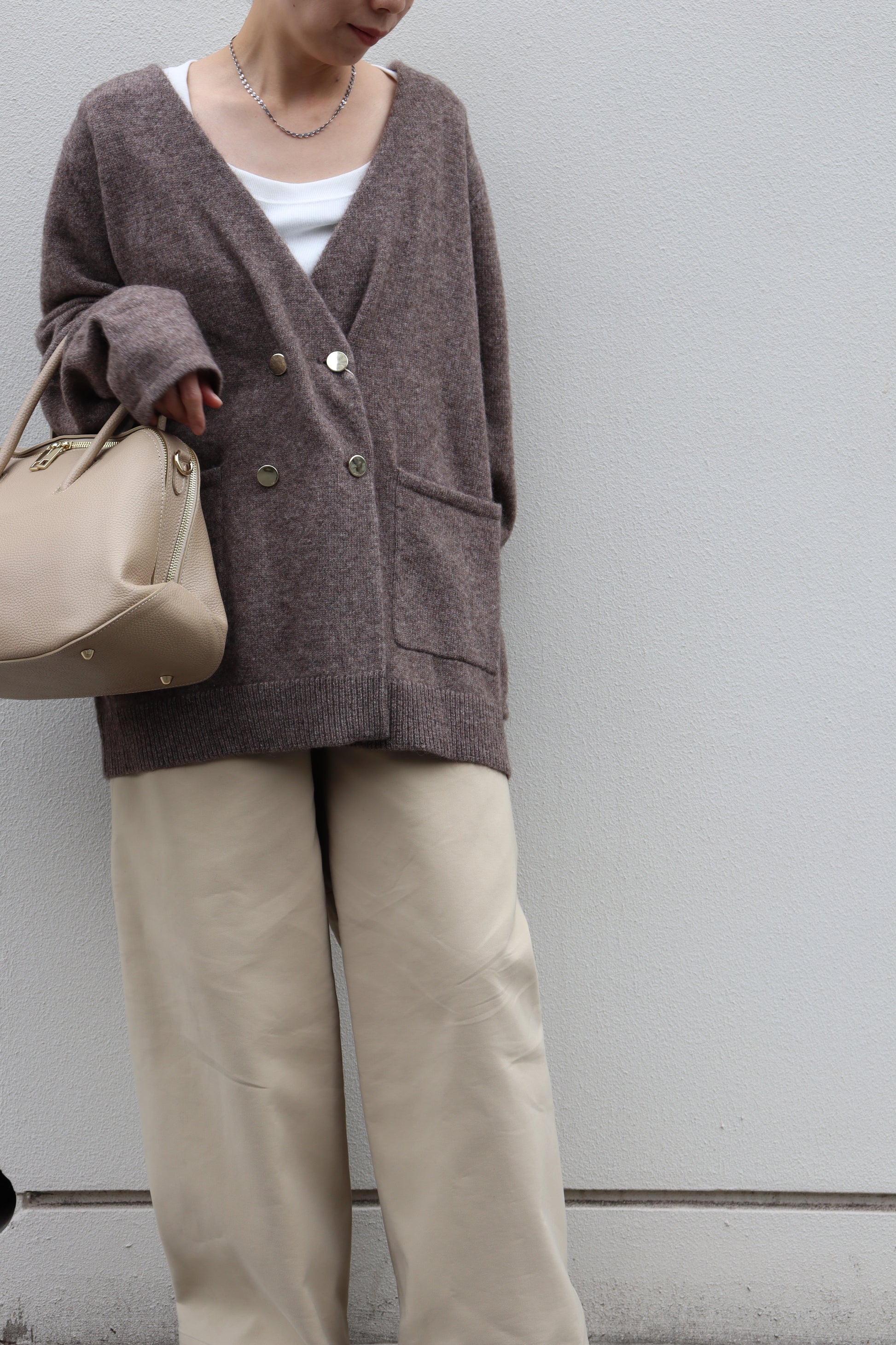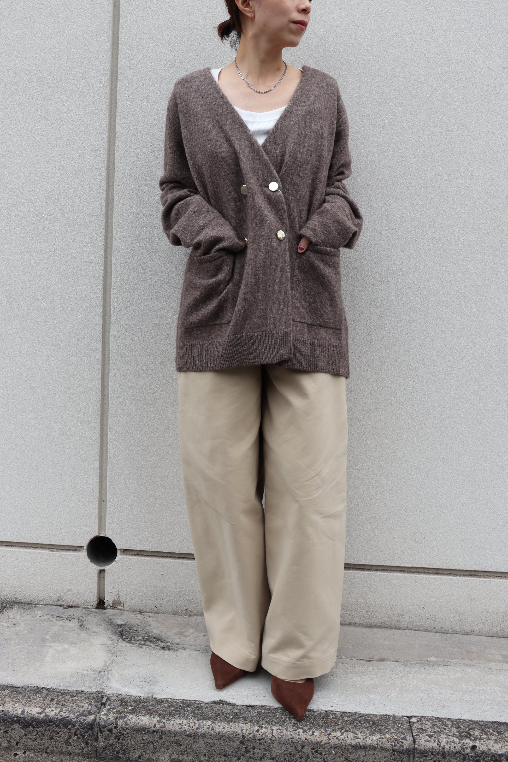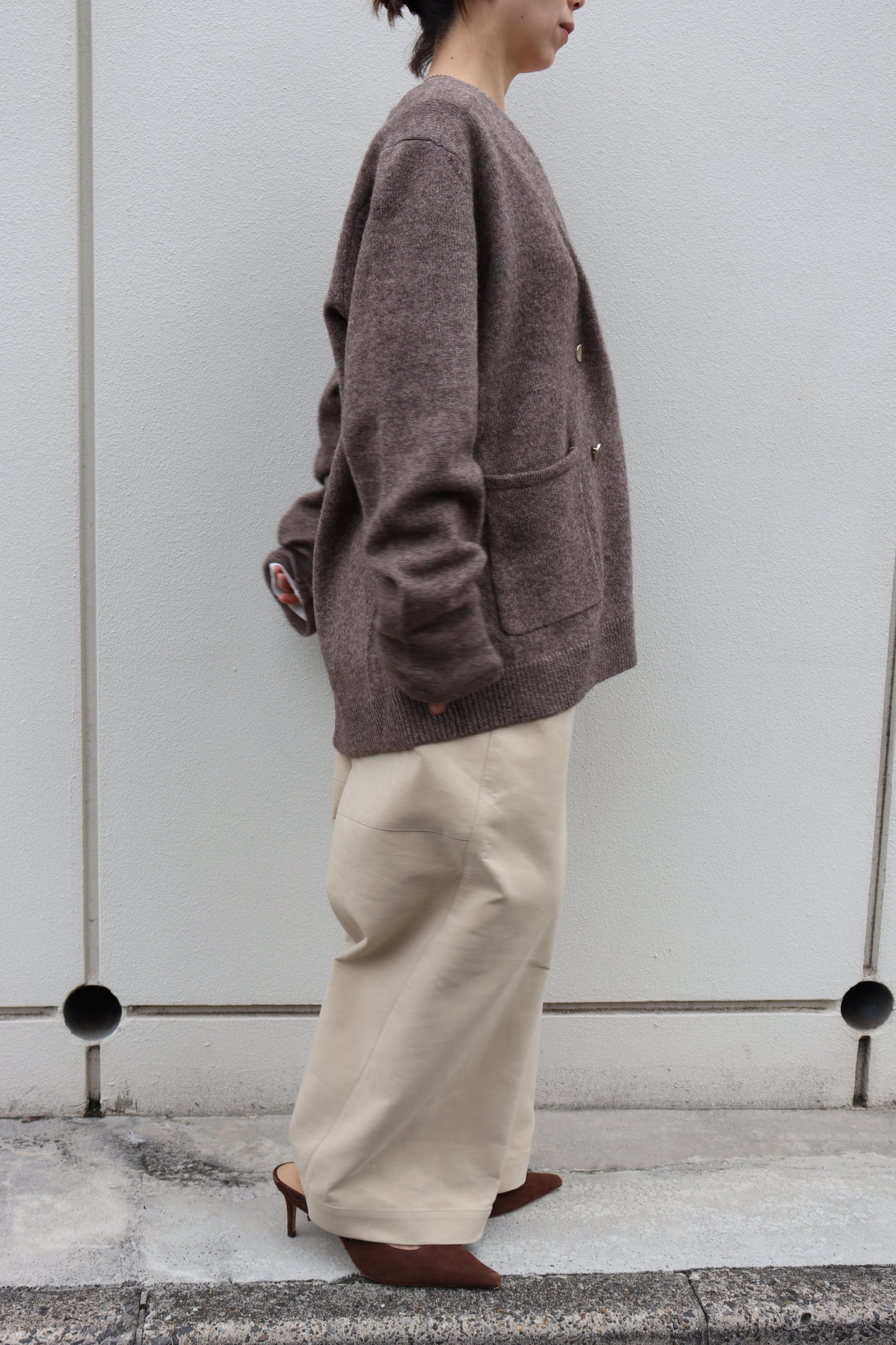フロントのゴールド釦もポイントになっており、パンツスタイルにもスカートスタイルにも合う雰囲気が◎