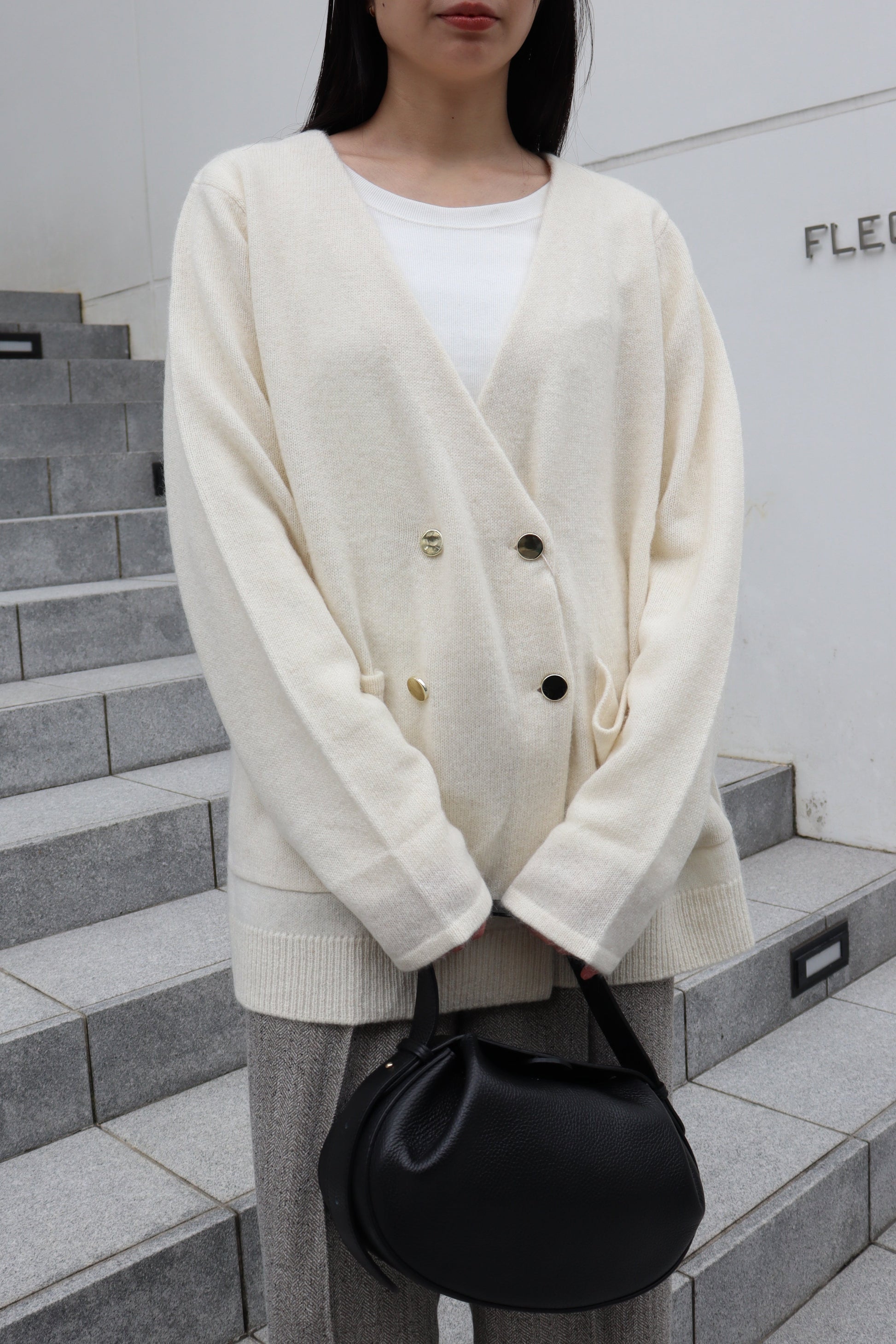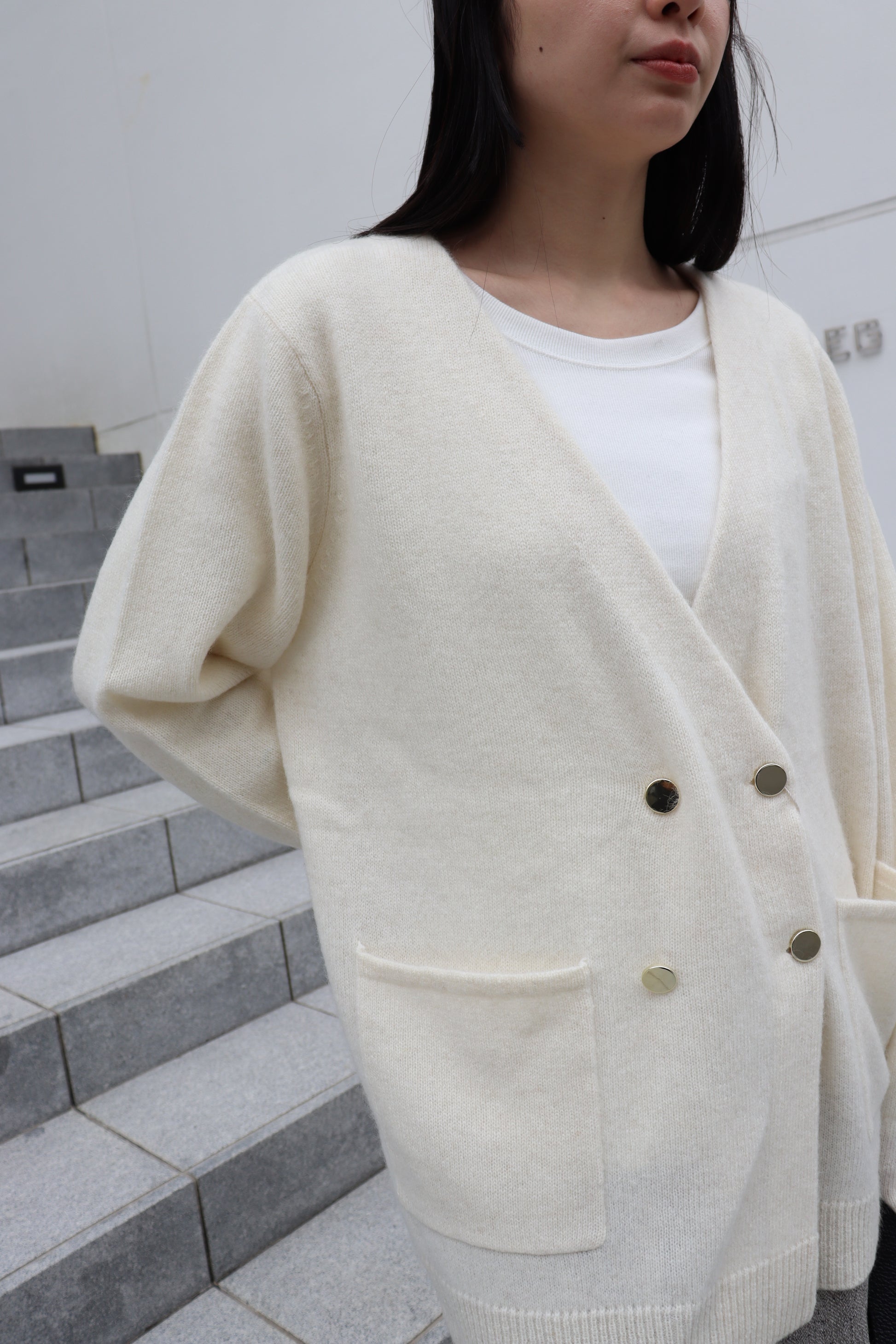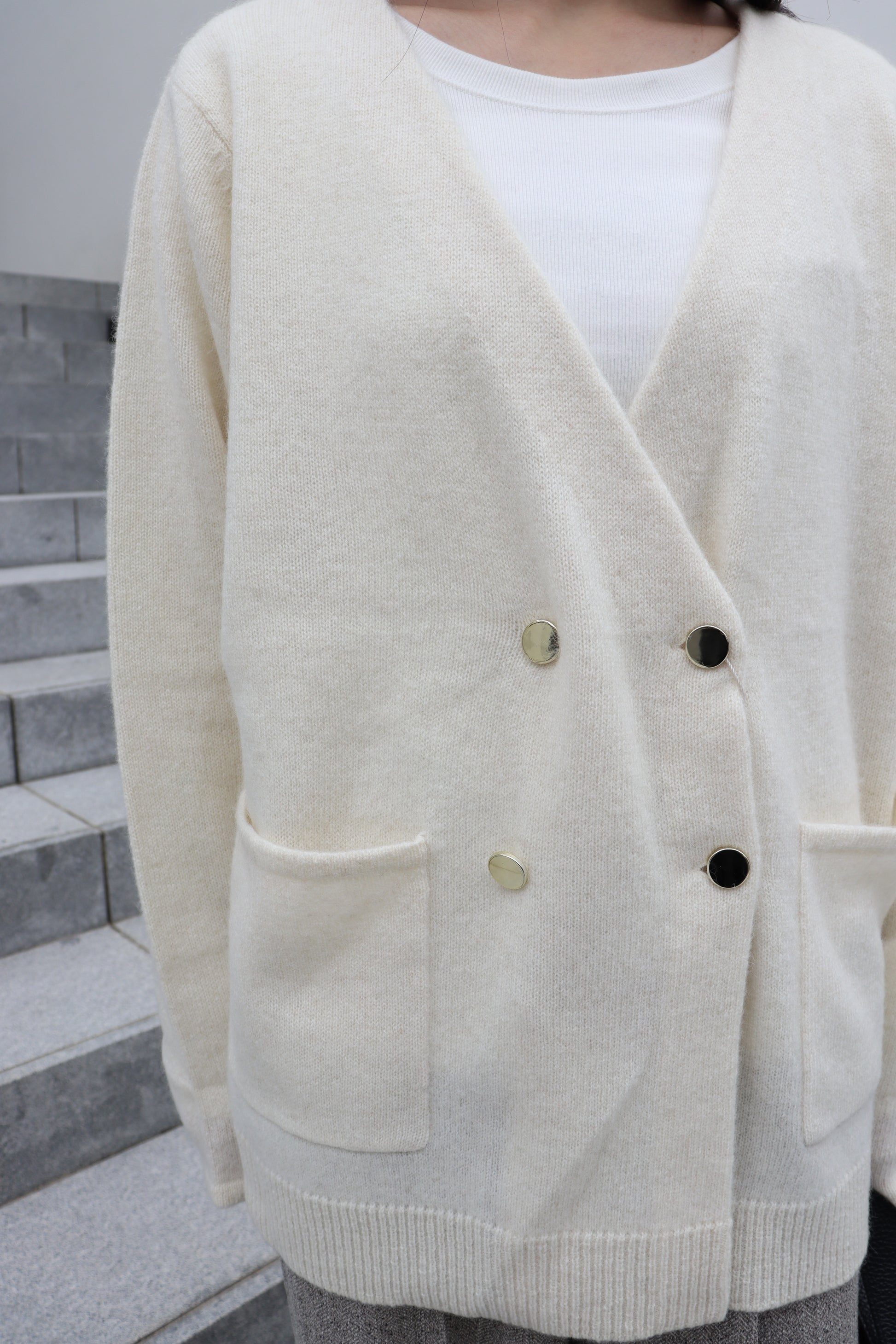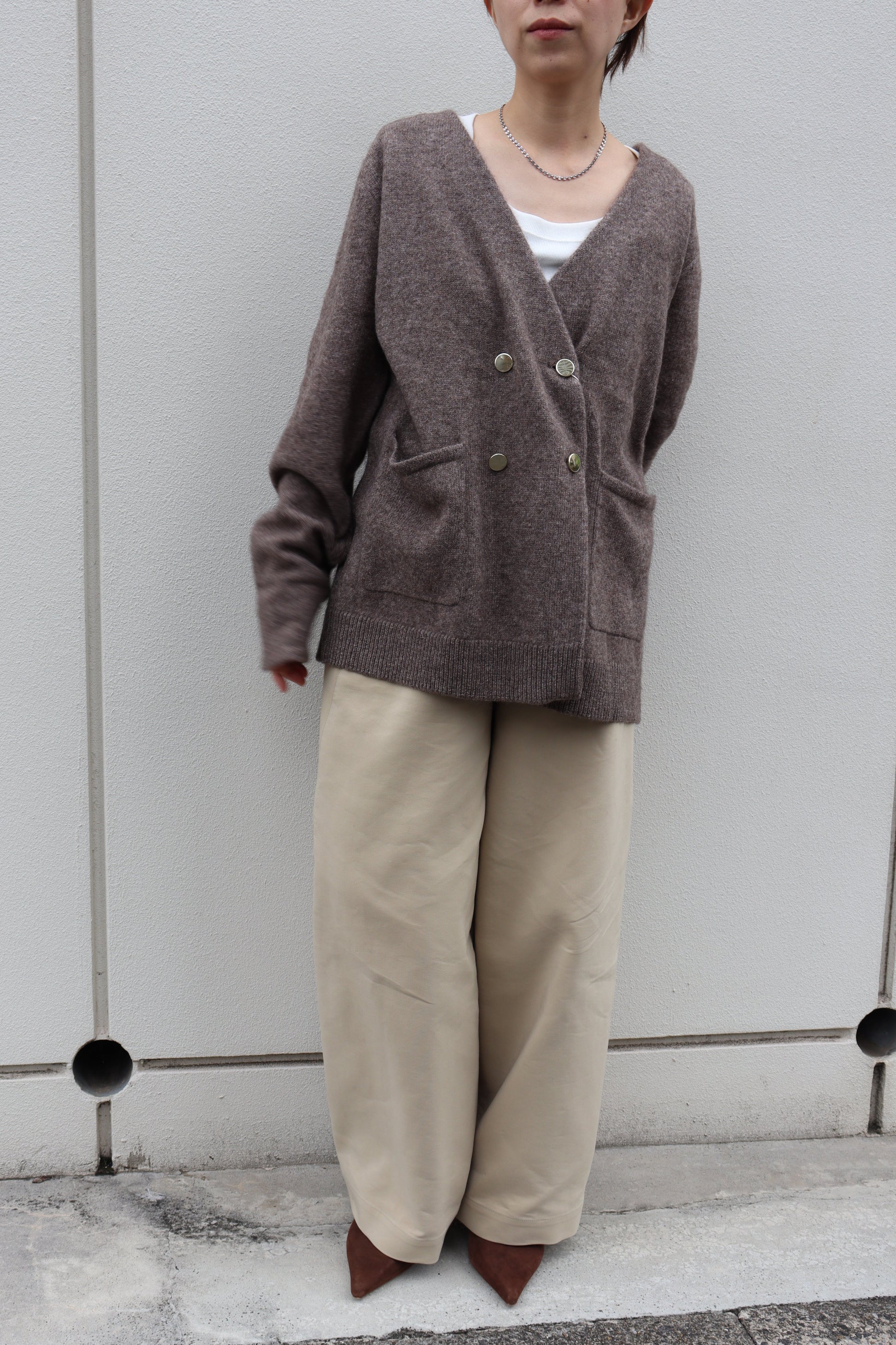フロントのゴールド釦もポイントになっており、パンツスタイルにもスカートスタイルにも合う雰囲気が◎