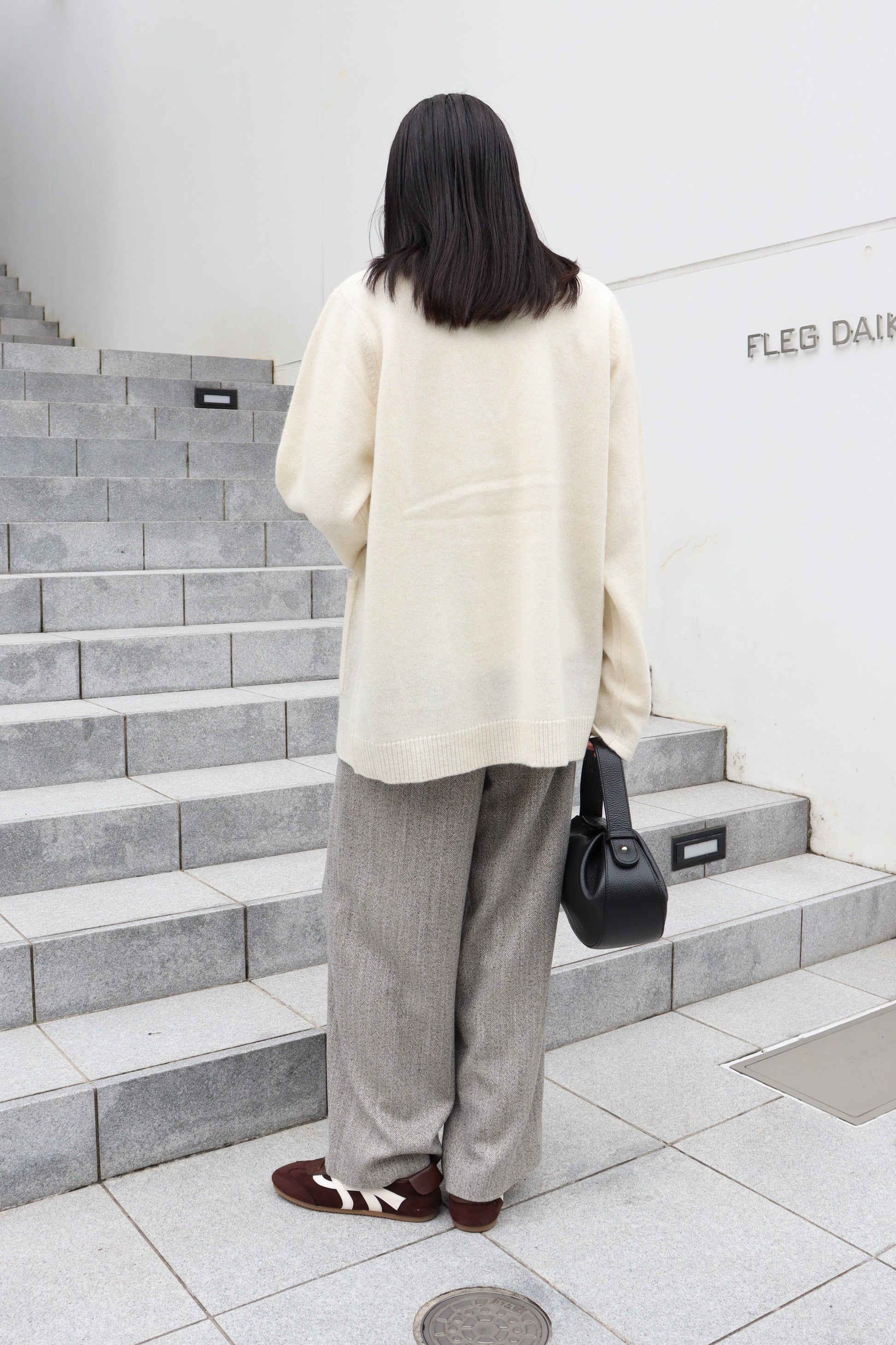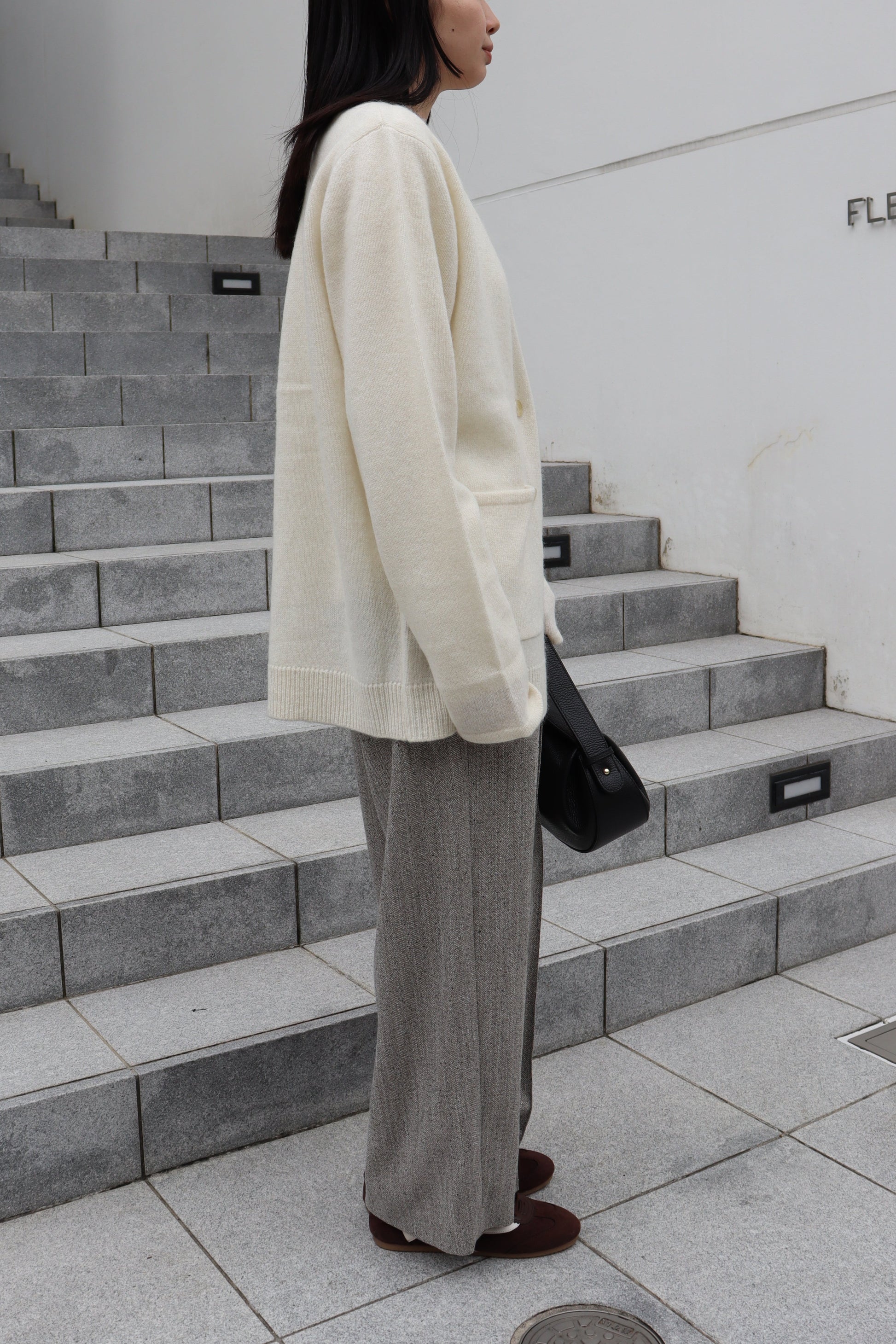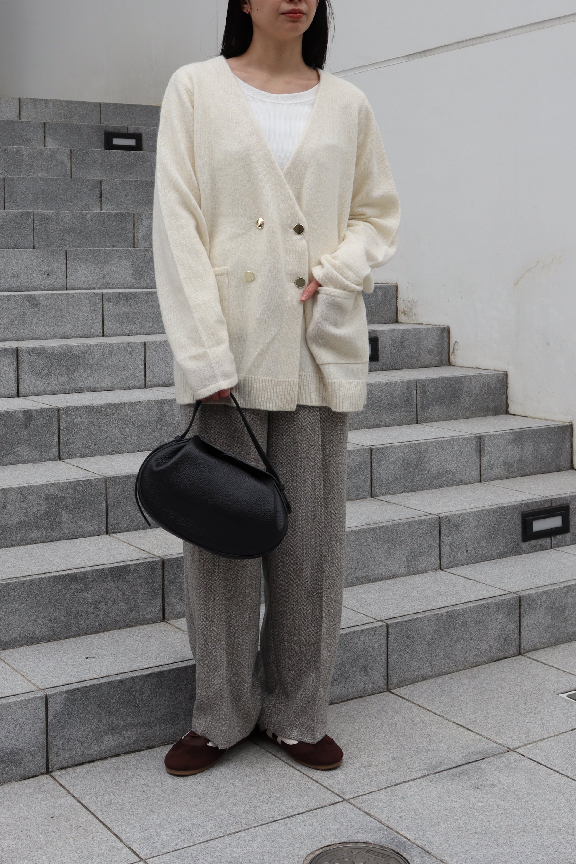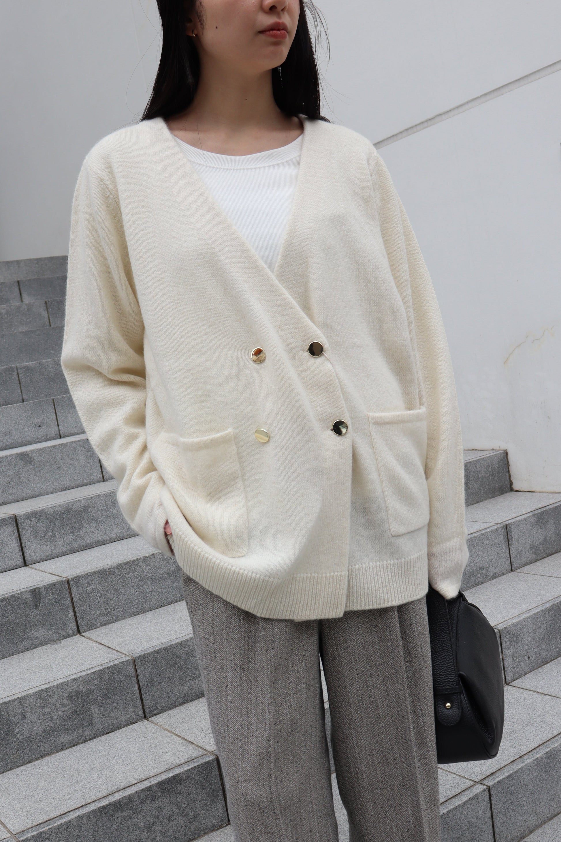 フロントのゴールド釦もポイントになっており、パンツスタイルにもスカートスタイルにも合う雰囲気が◎