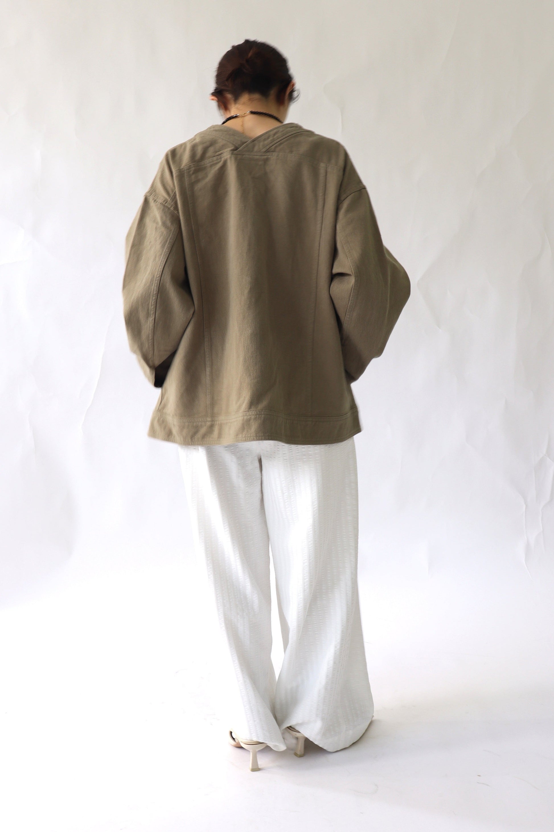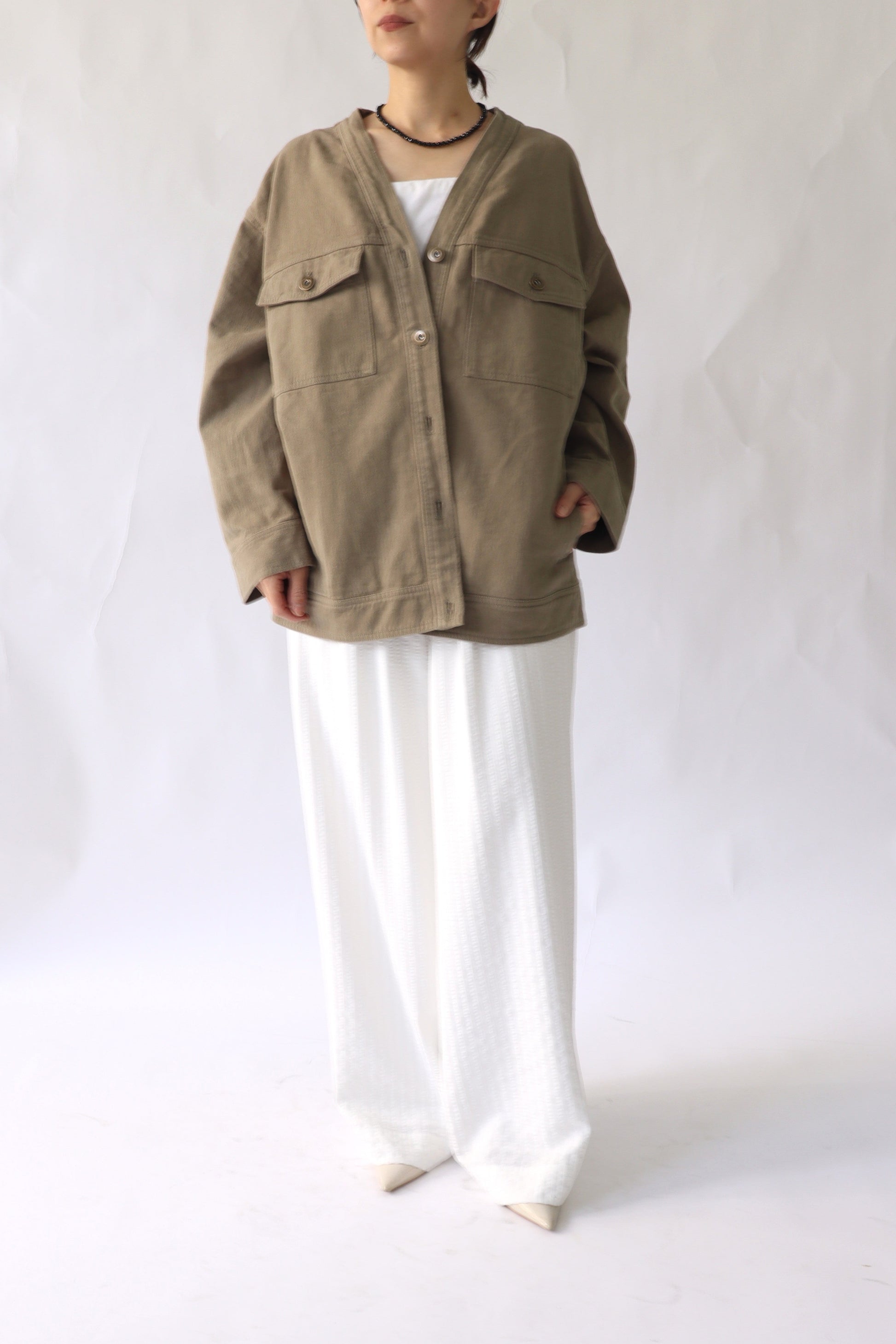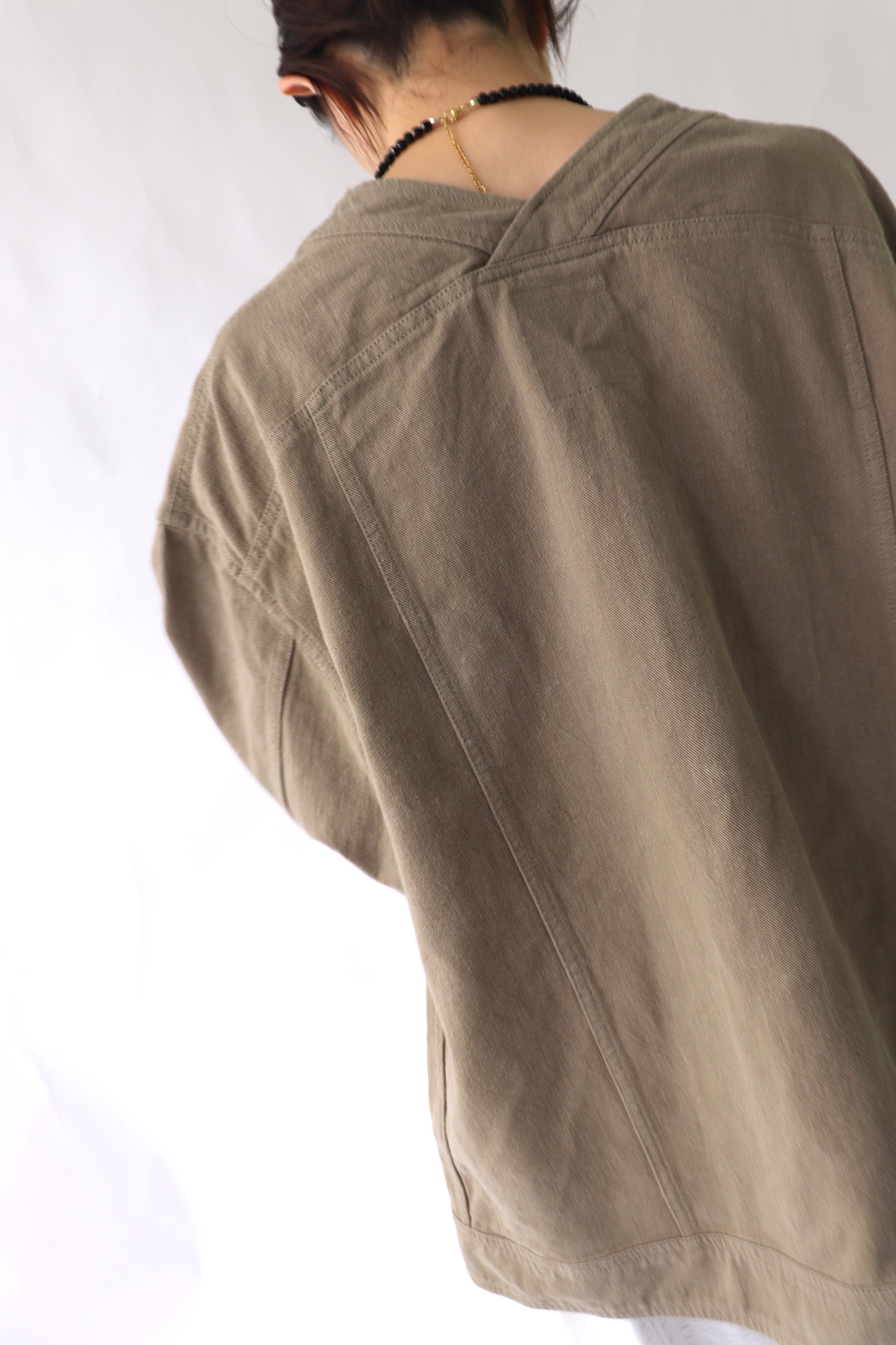 肌寒い時期から春先に活躍するGジャンの様なアイテムをACUTAらしくノーカラーのカジュアルジャケットとして展開。カジュアルなアイテムですが、程よいオーバーサイズとすっきりした衿元に女性らしい抜け感を感じます。