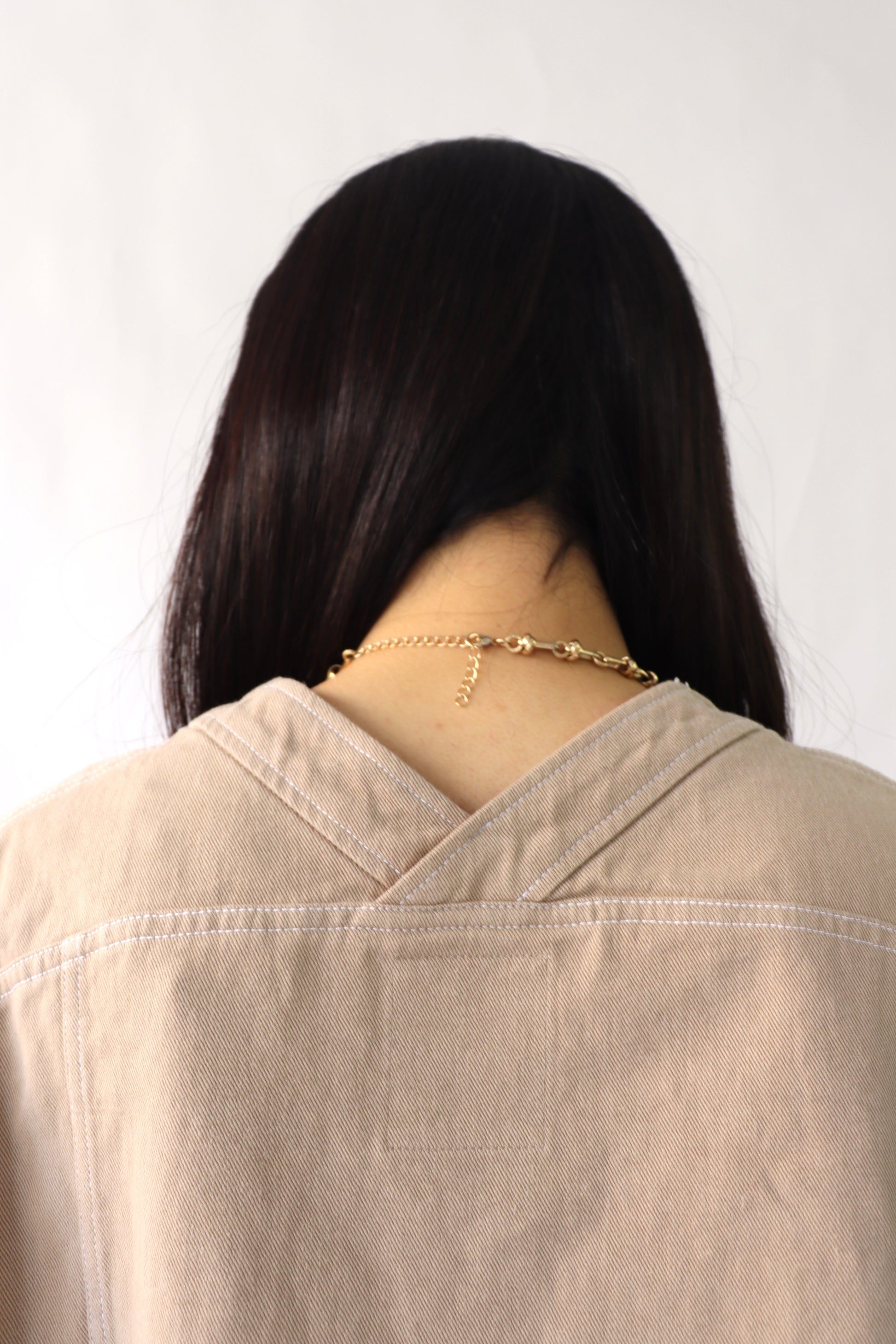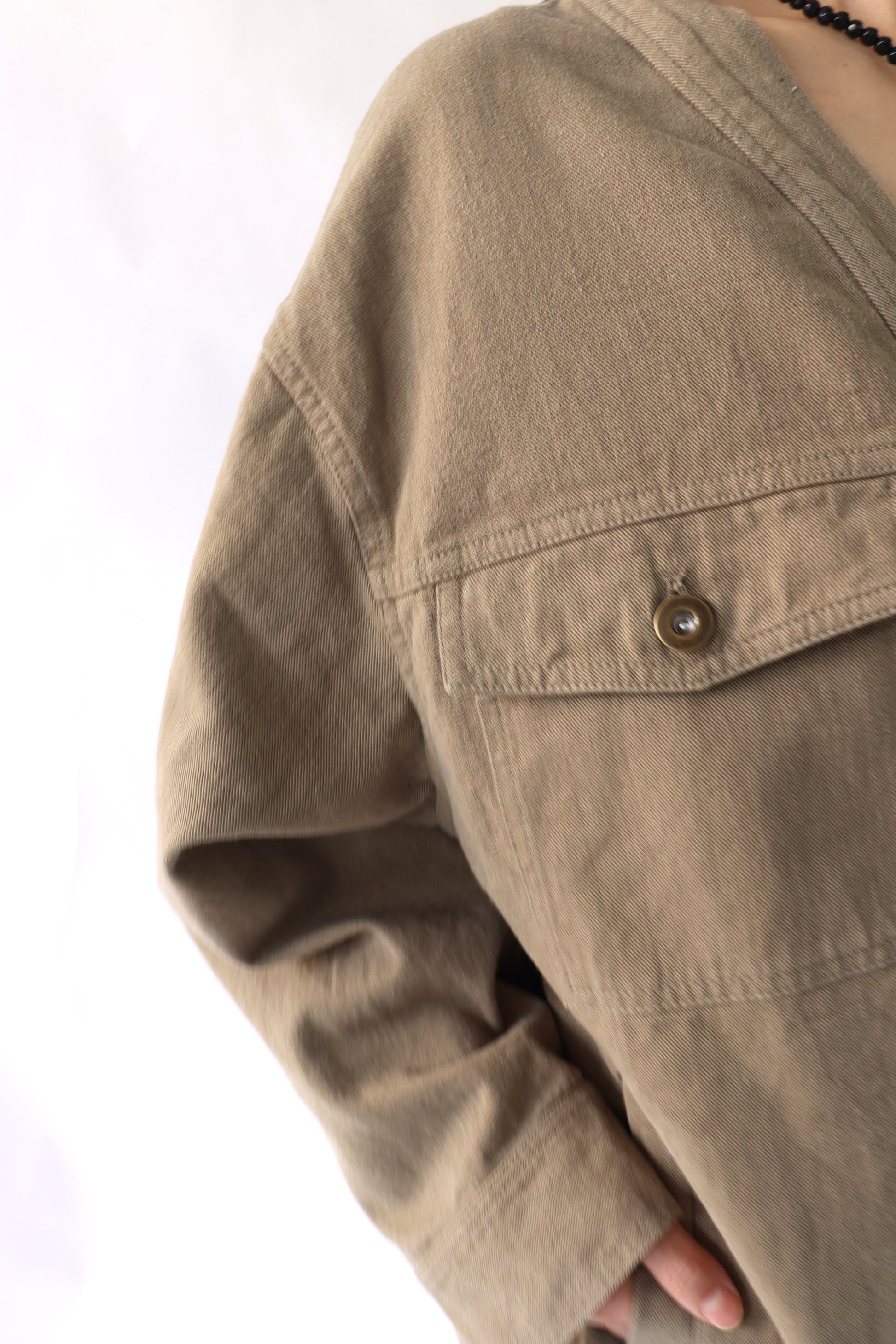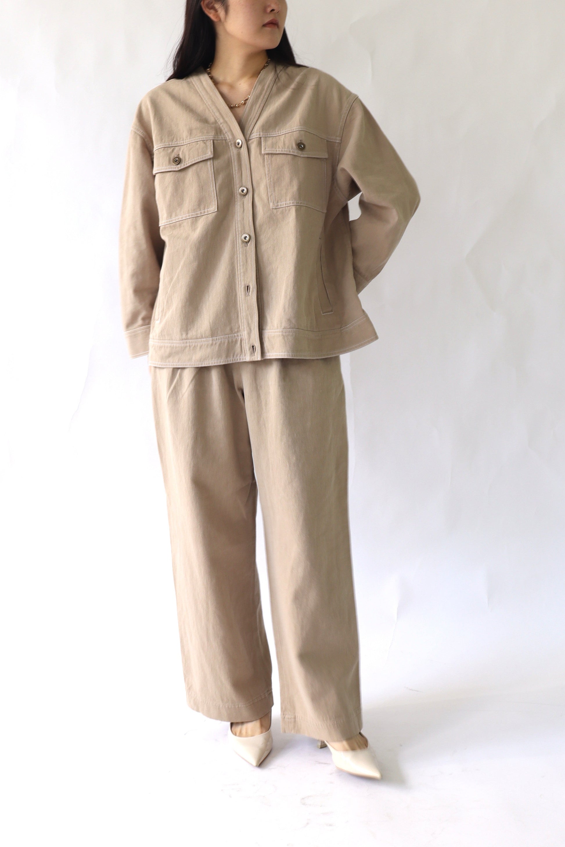 肌寒い時期から春先に活躍するGジャンの様なアイテムをACUTAらしくノーカラーのカジュアルジャケットとして展開。カジュアルなアイテムですが、程よいオーバーサイズとすっきりした衿元に女性らしい抜け感を感じます。