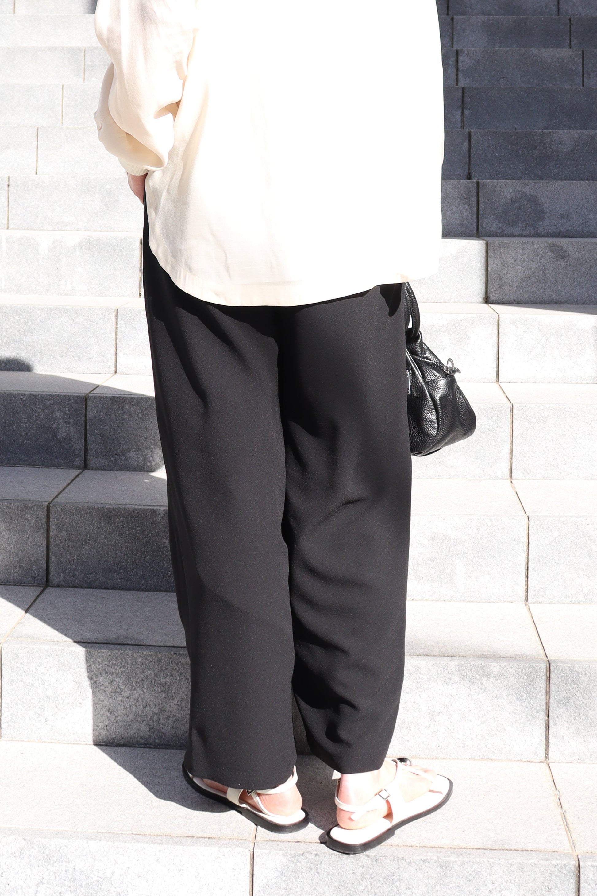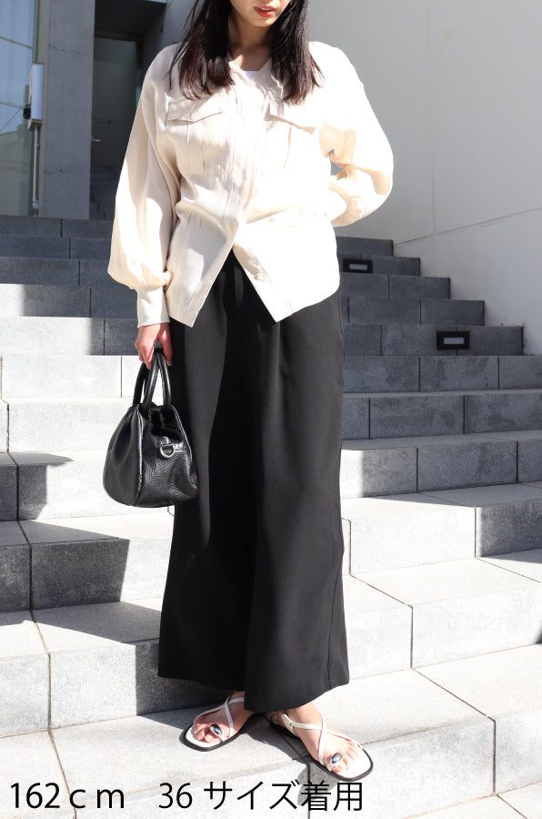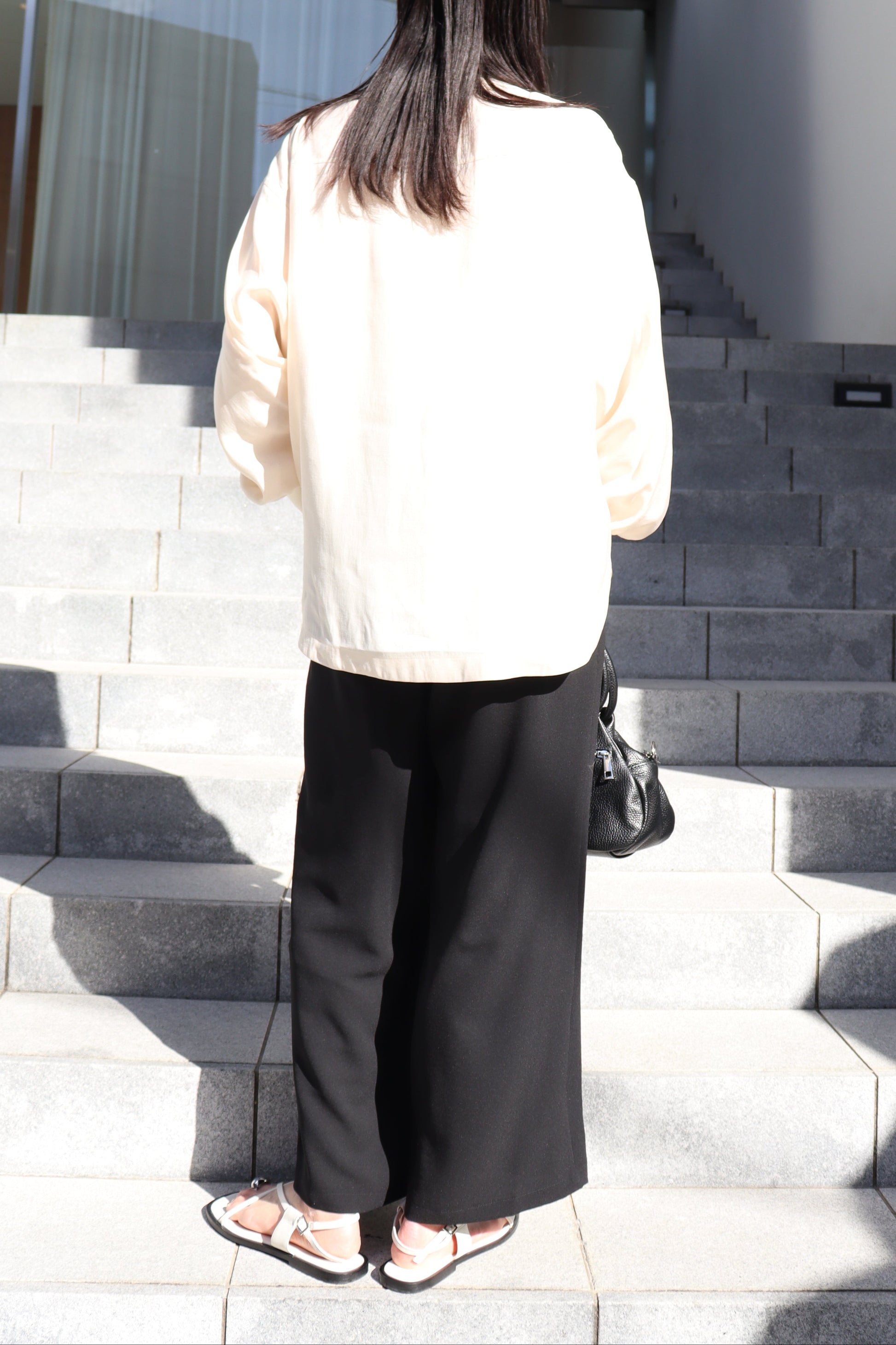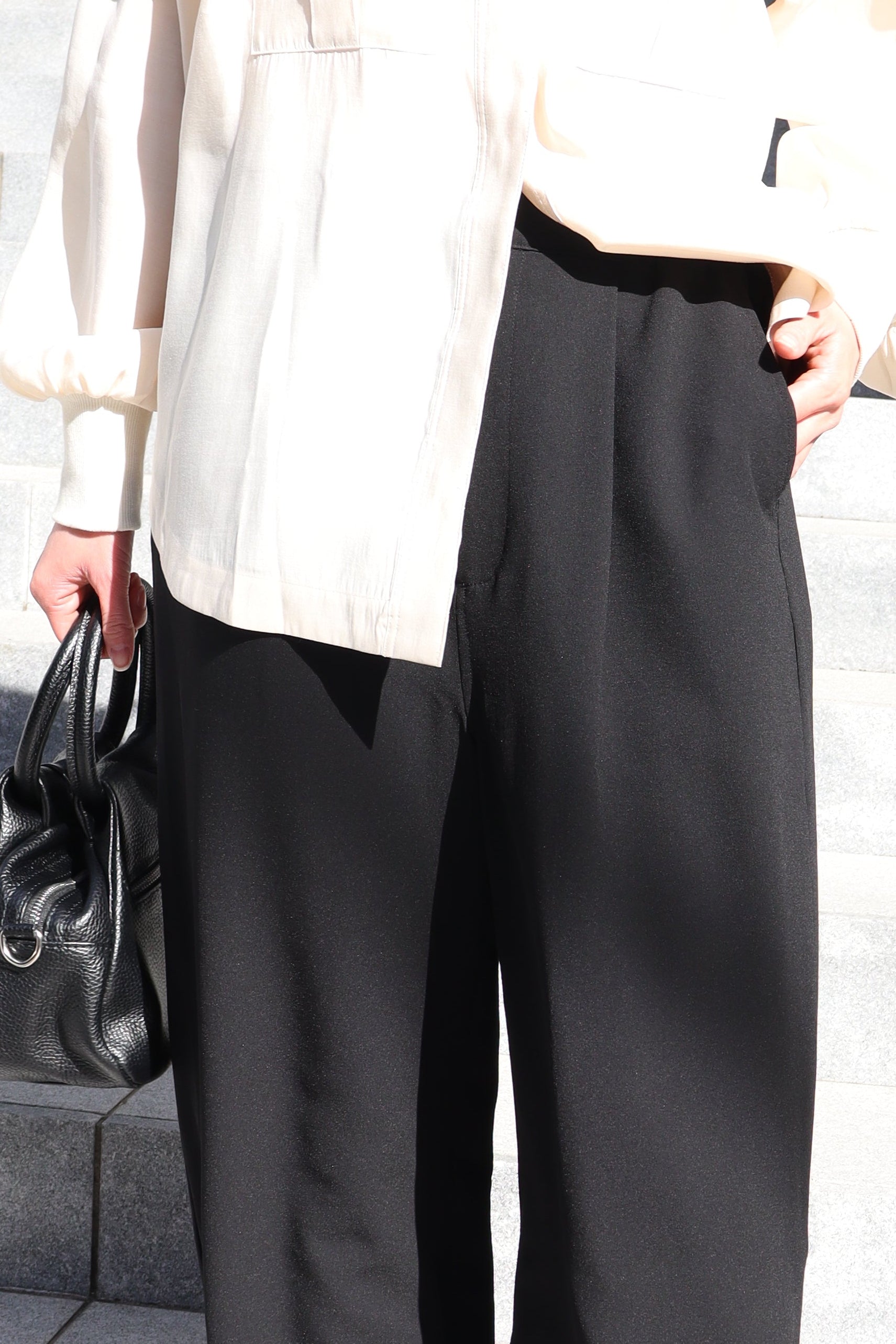 タックによる程よい分量感と、ウエストのゴムギャザーの範囲が広めなので着心地は楽チン。でもフロントがファスナーあき仕様なので、イージーになり過ぎずきちんと感も出せるのが嬉しいアイテムです。