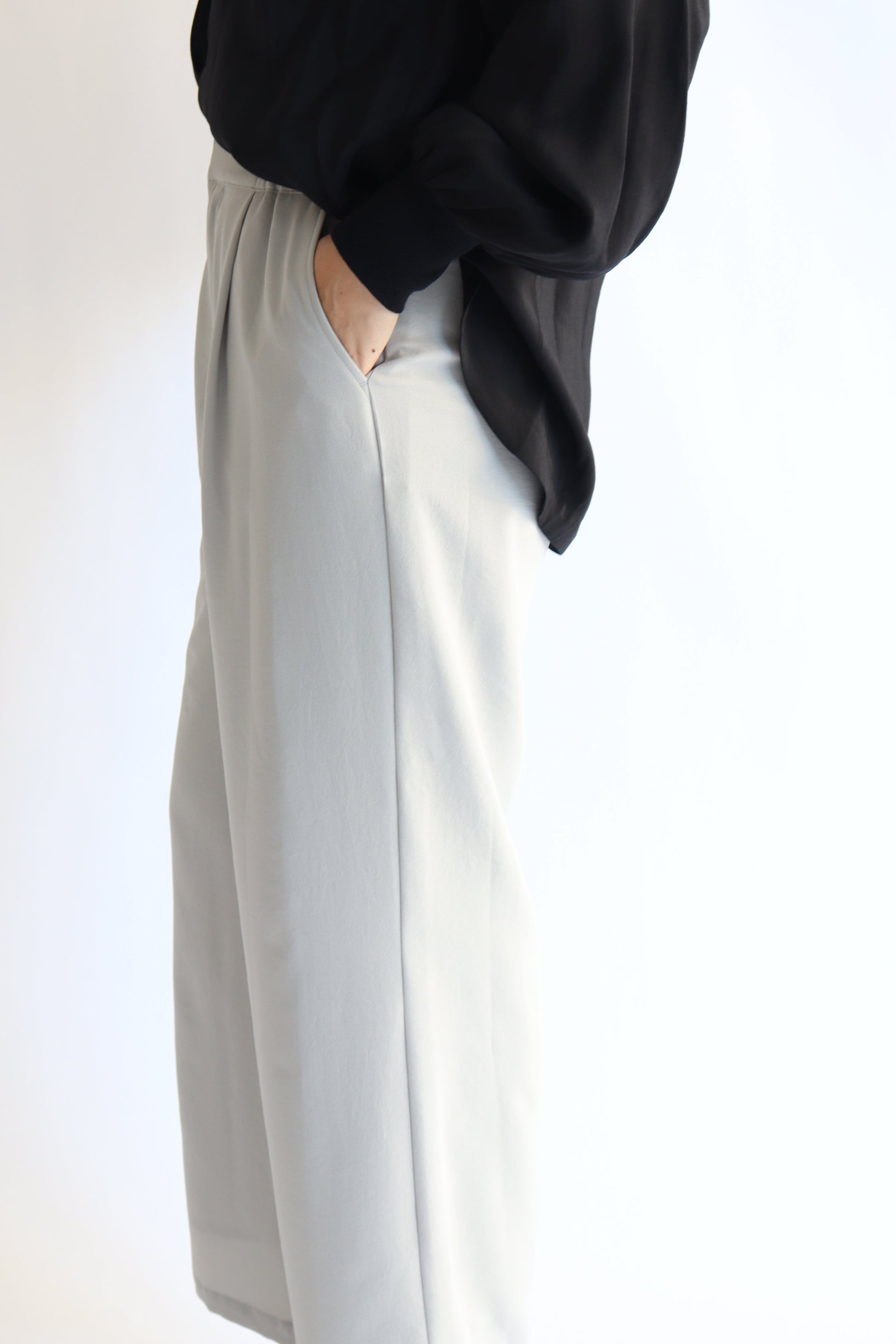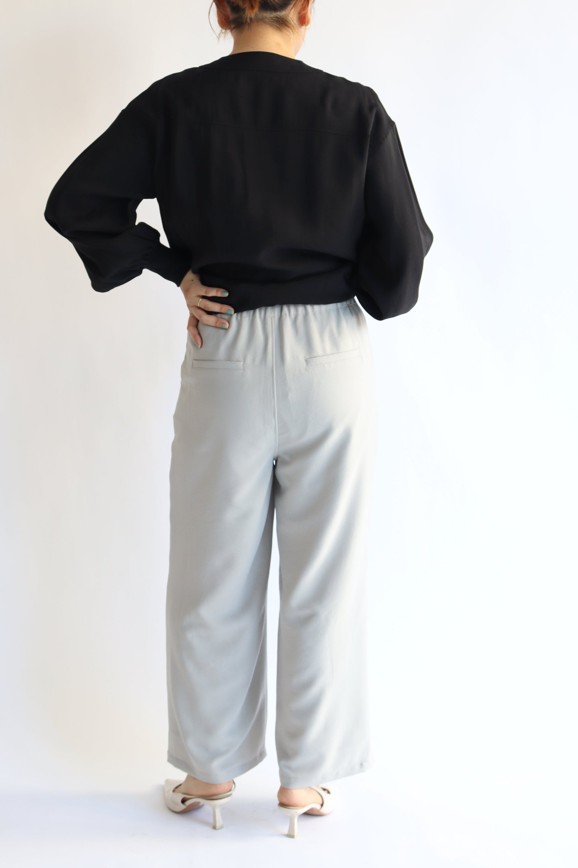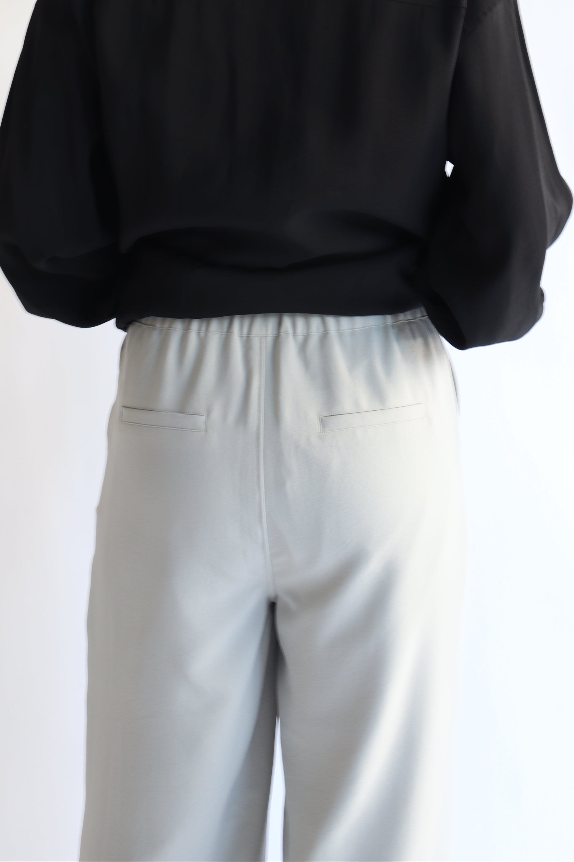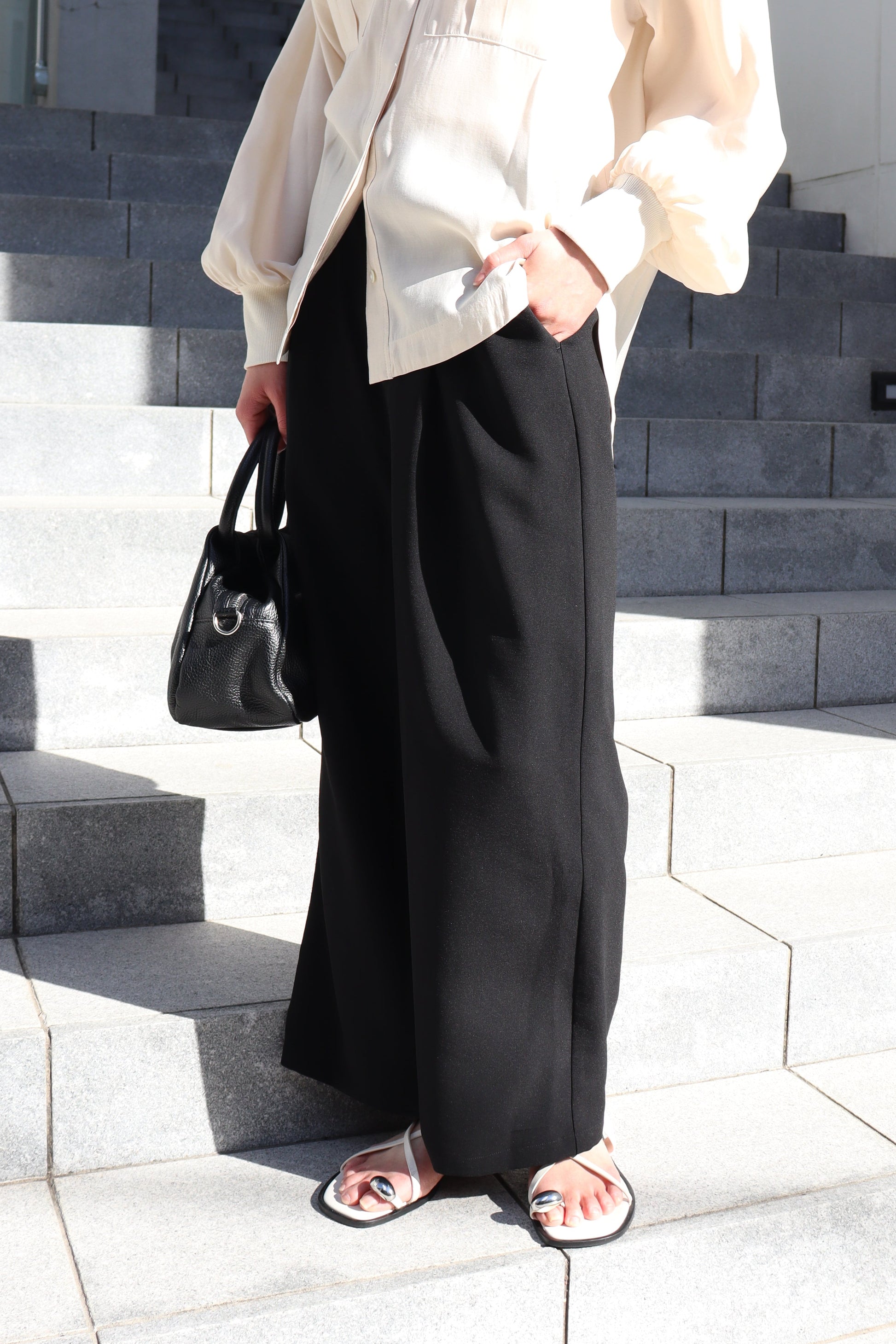 タックによる程よい分量感と、ウエストのゴムギャザーの範囲が広めなので着心地は楽チン。でもフロントがファスナーあき仕様なので、イージーになり過ぎずきちんと感も出せるのが嬉しいアイテムです。