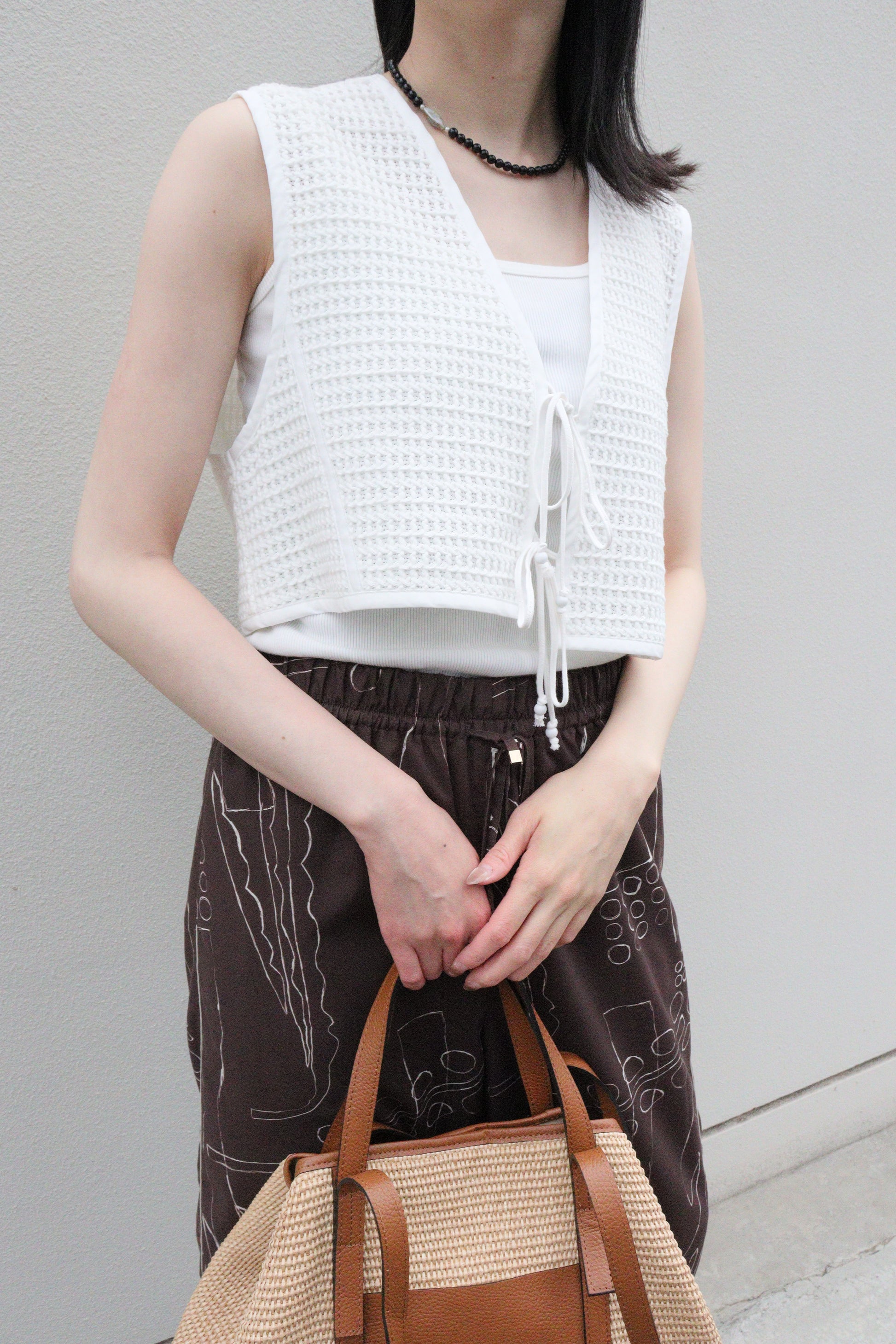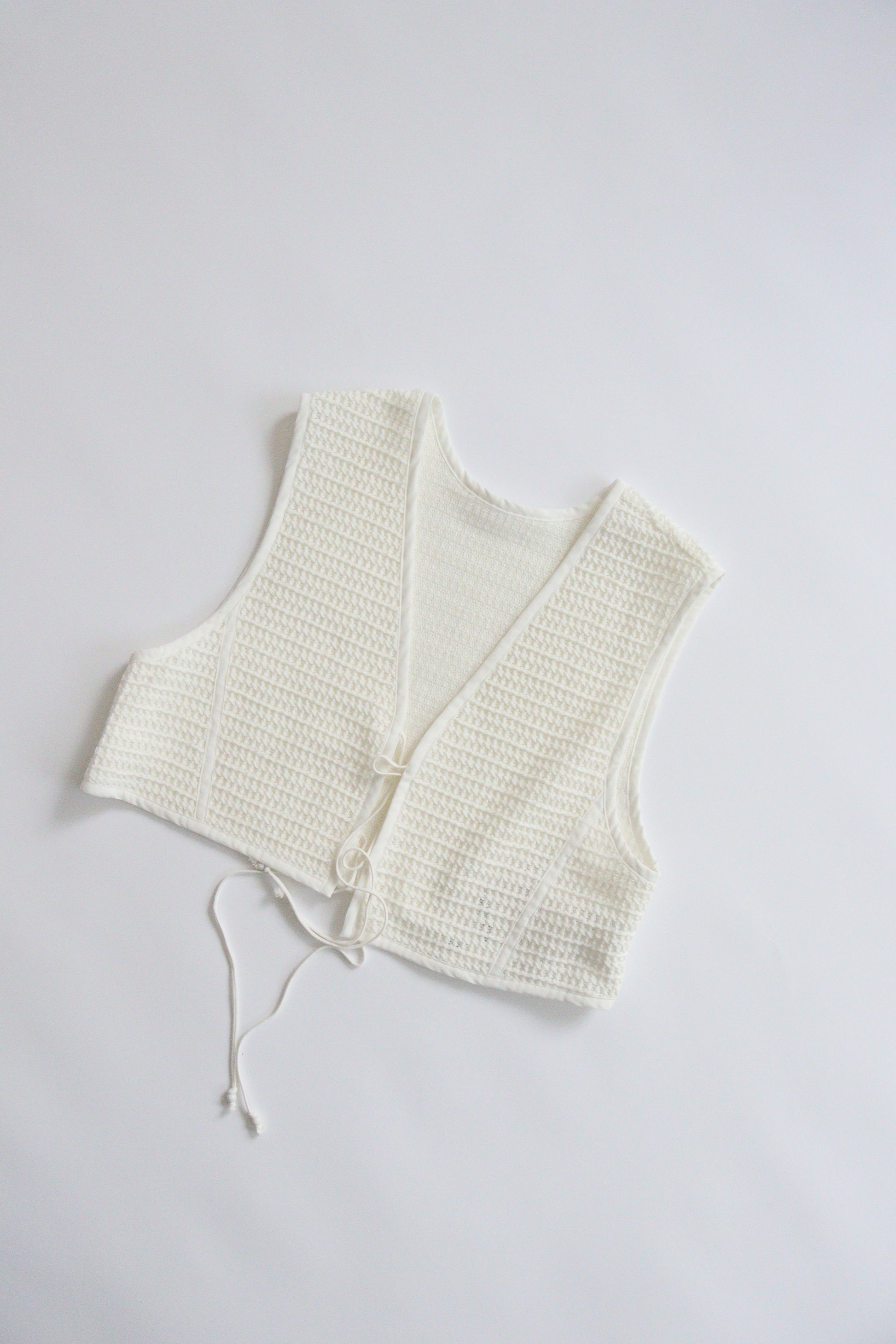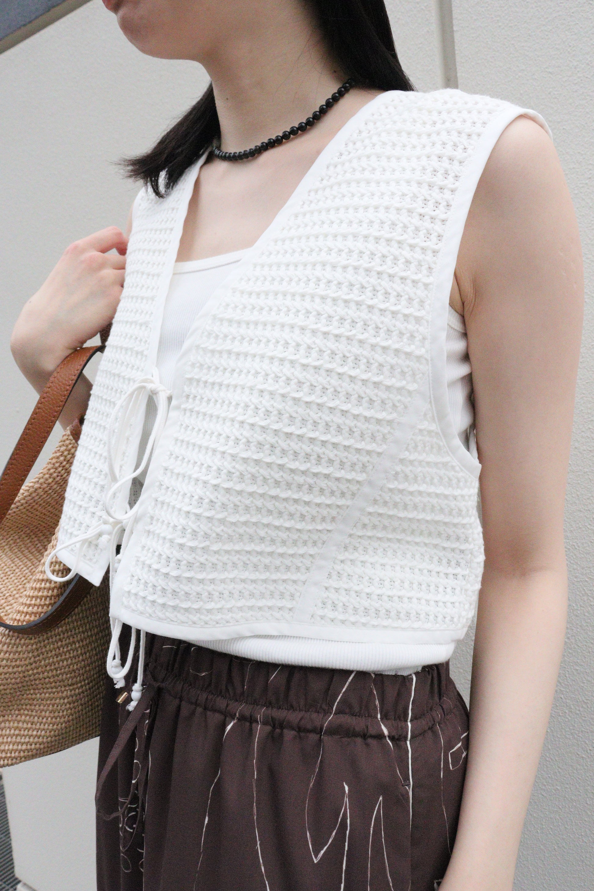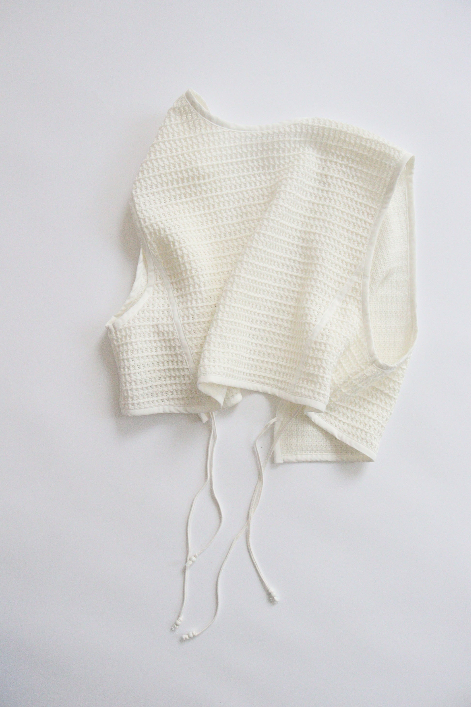 ショート丈の前あきミニマルベスト。太番手の糸を9ゲージのローゲージで編んだ、ローゲージニットのようなラッセル素材を使用。ワッフルのような柄がボーホートレンドの気分にぴったり。