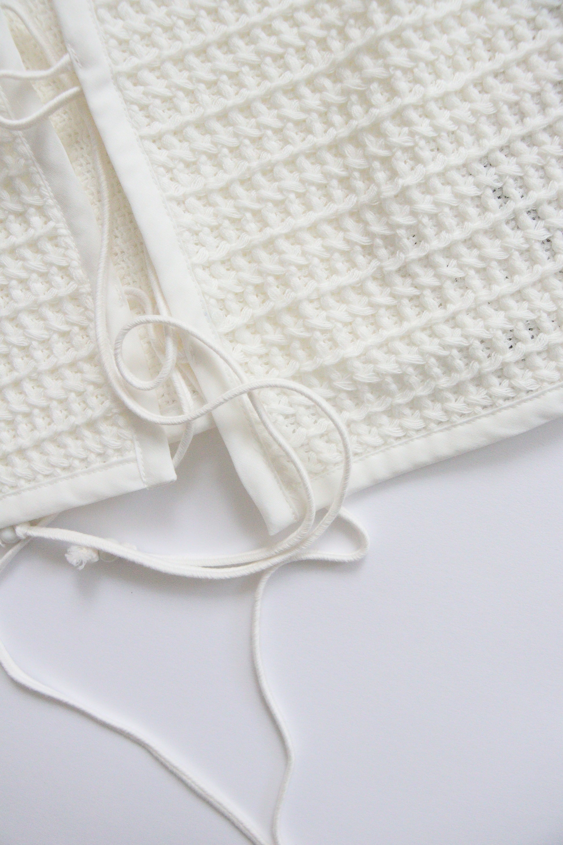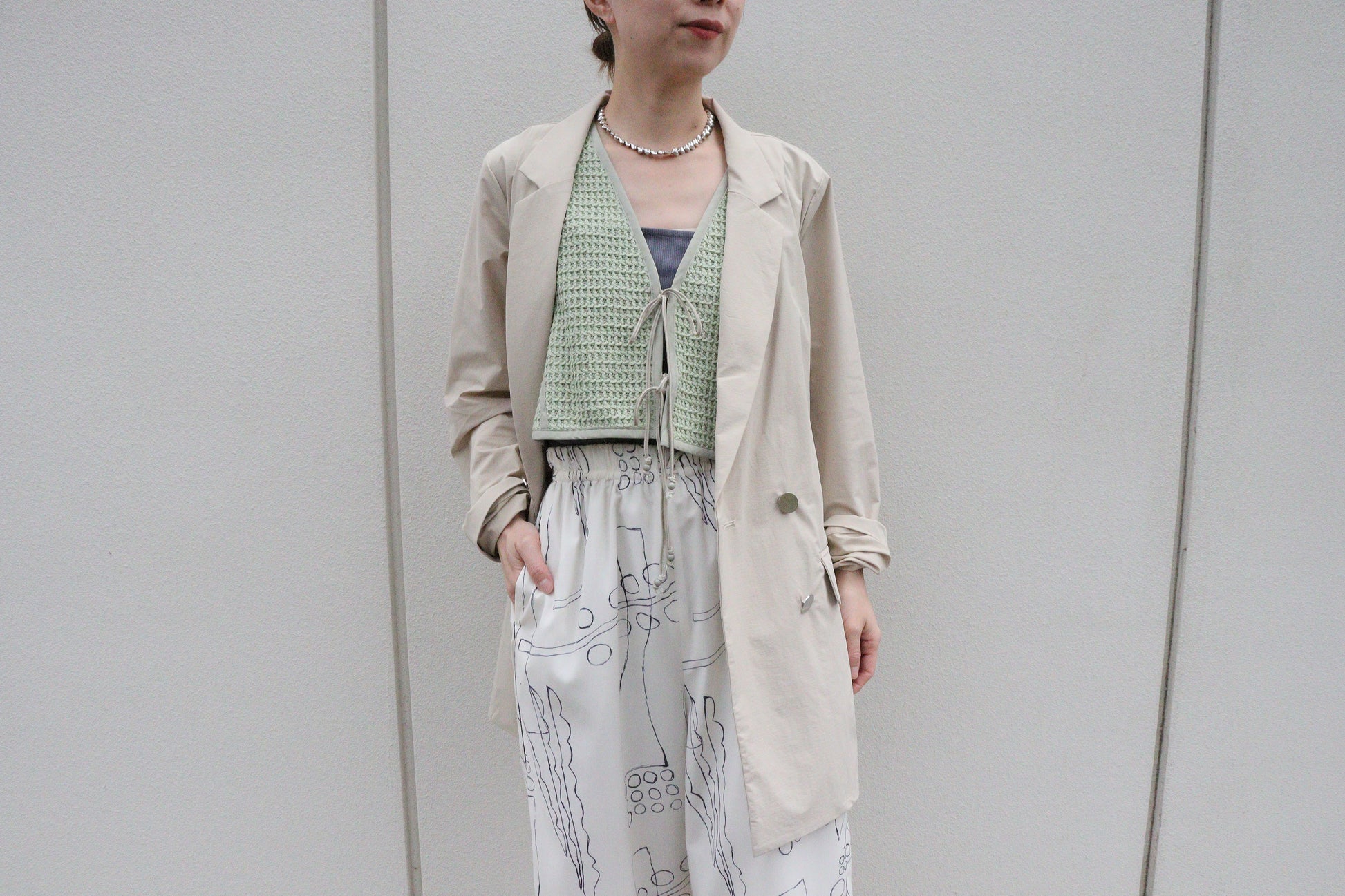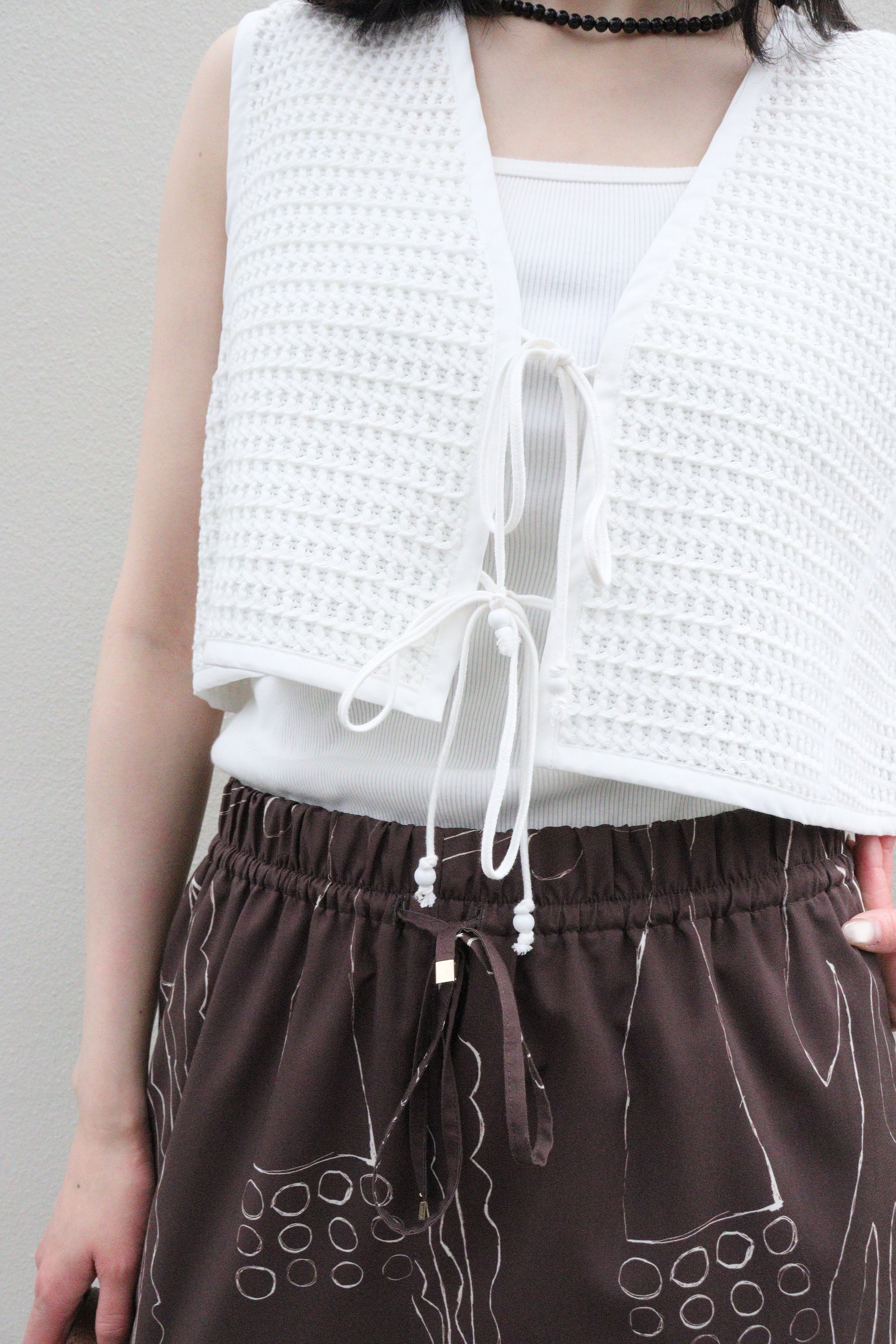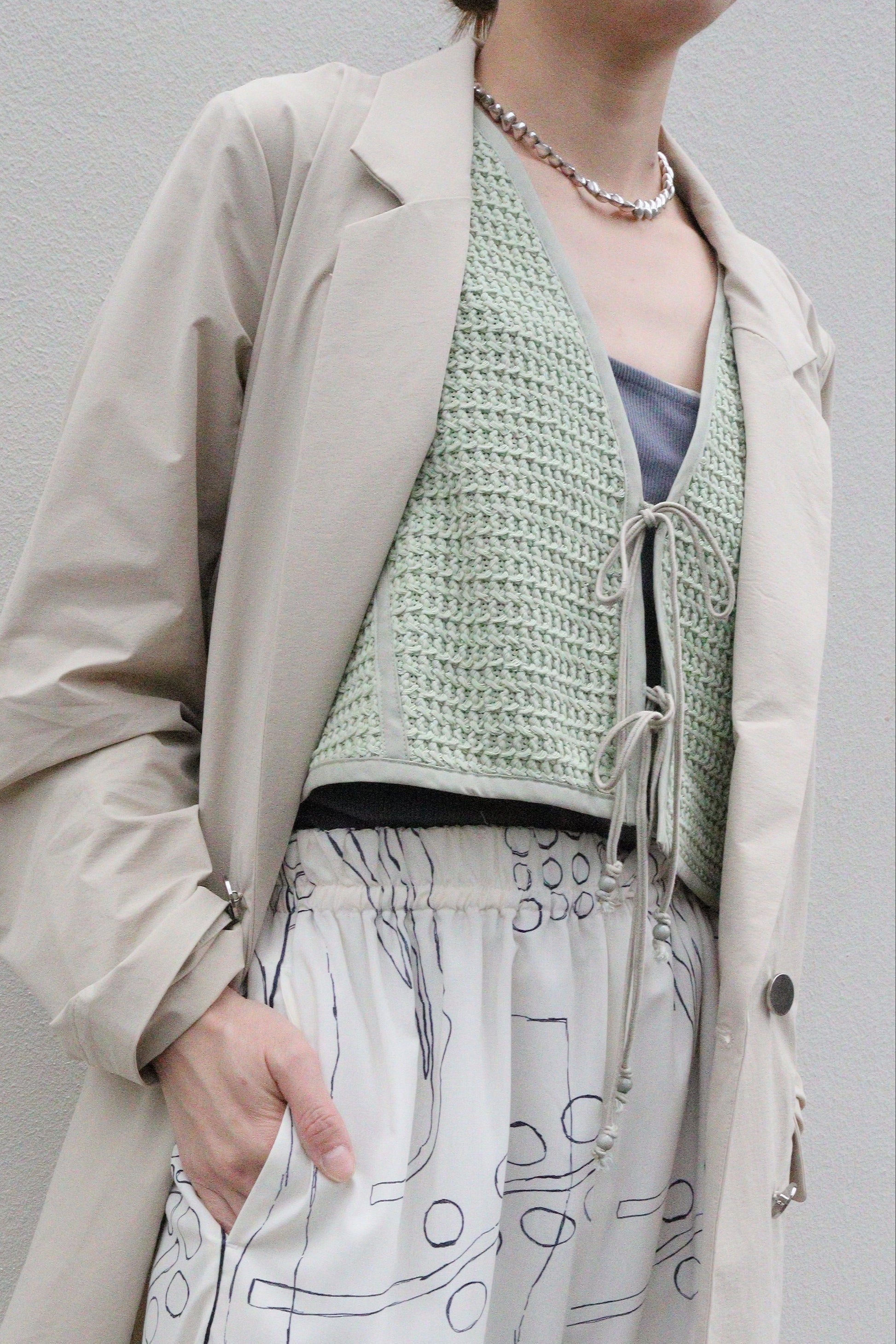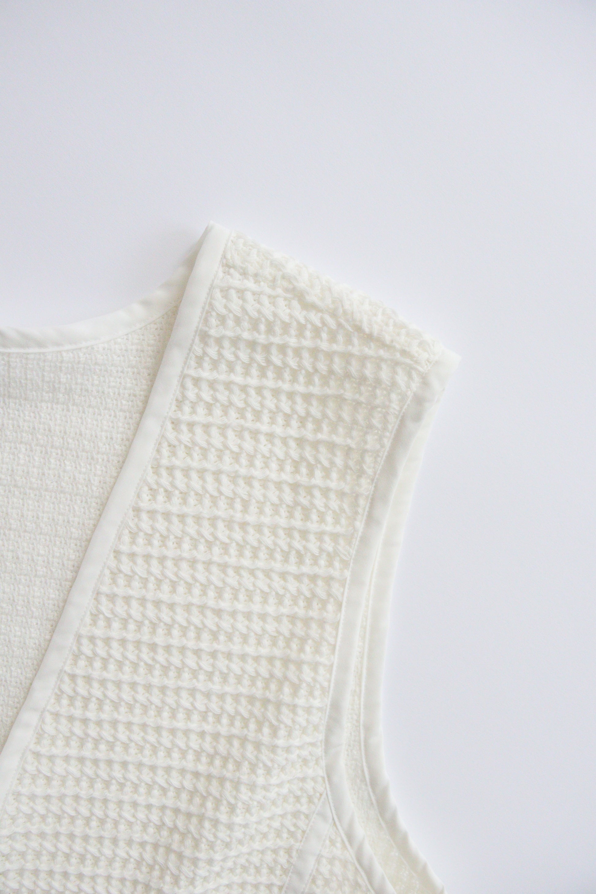 ショート丈の前あきミニマルベスト。太番手の糸を9ゲージのローゲージで編んだ、ローゲージニットのようなラッセル素材を使用。ワッフルのような柄がボーホートレンドの気分にぴったり。