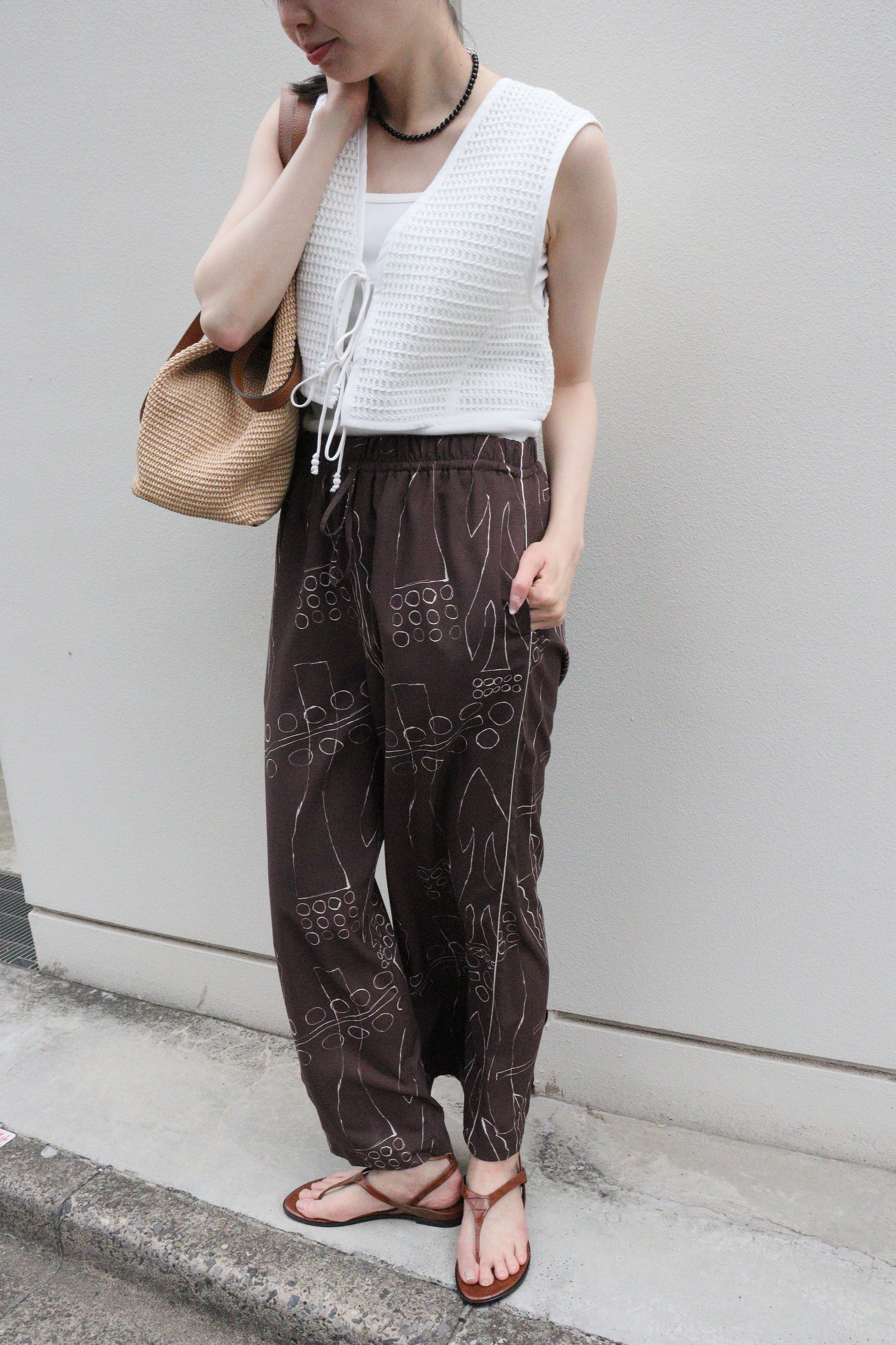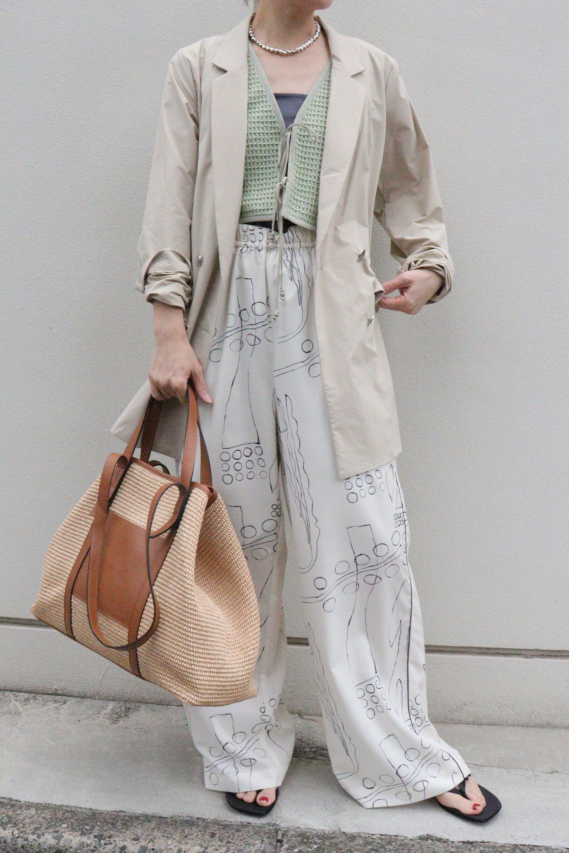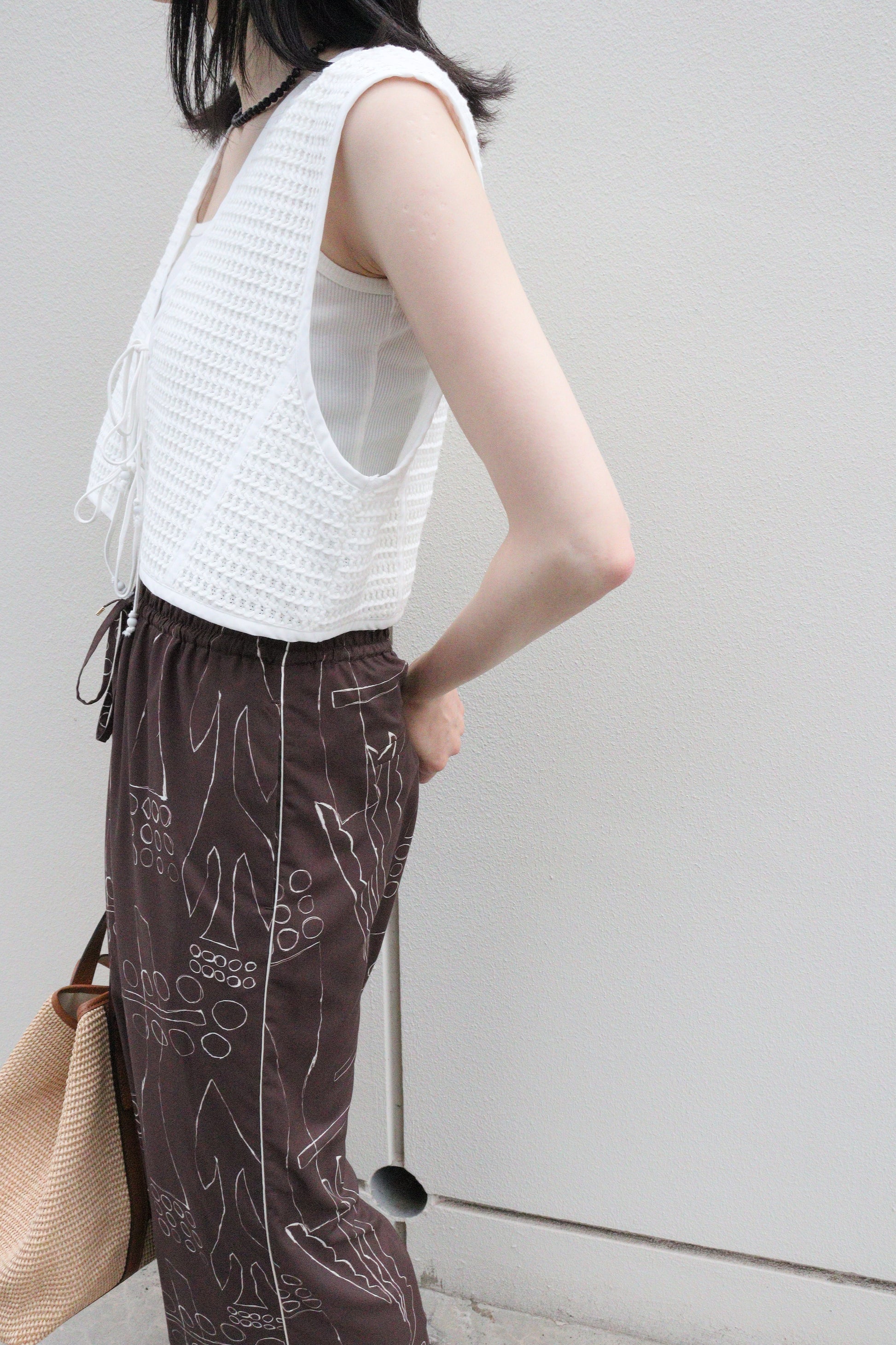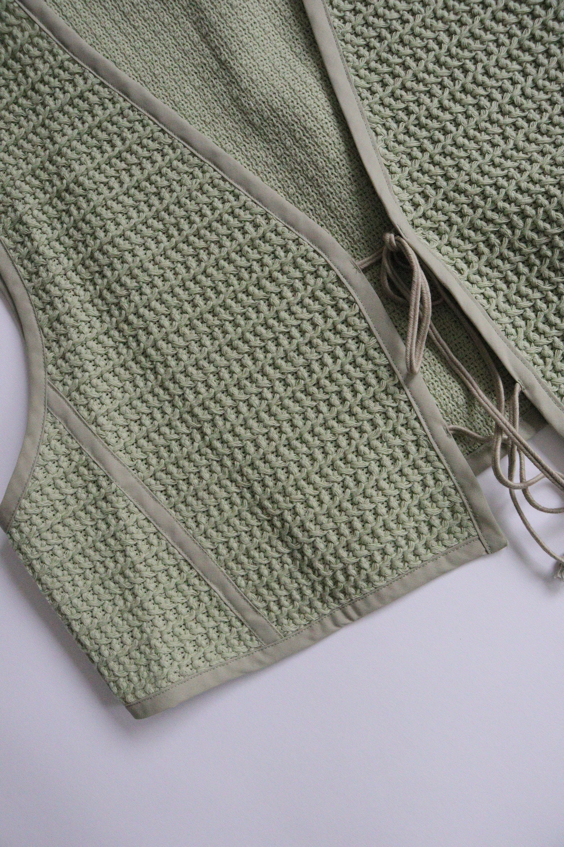 ショート丈の前あきミニマルベスト。太番手の糸を9ゲージのローゲージで編んだ、ローゲージニットのようなラッセル素材を使用。ワッフルのような柄がボーホートレンドの気分にぴったり。