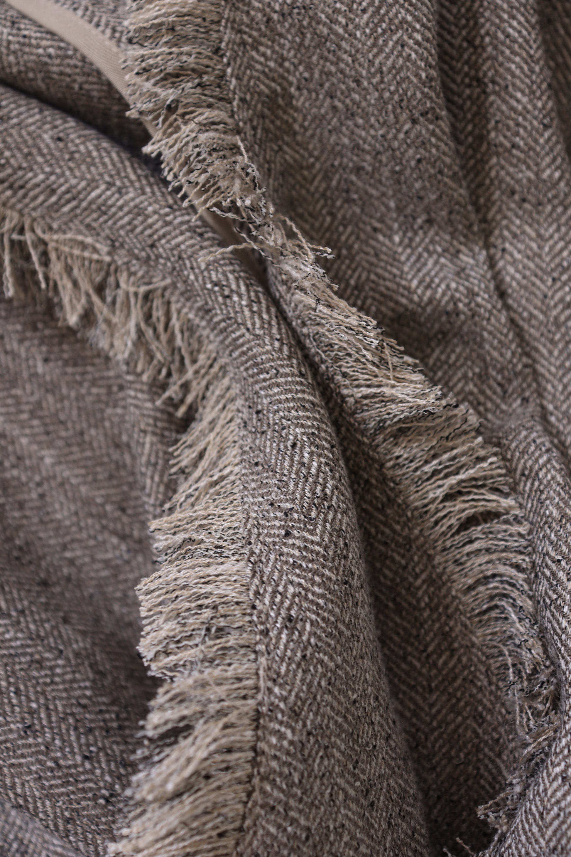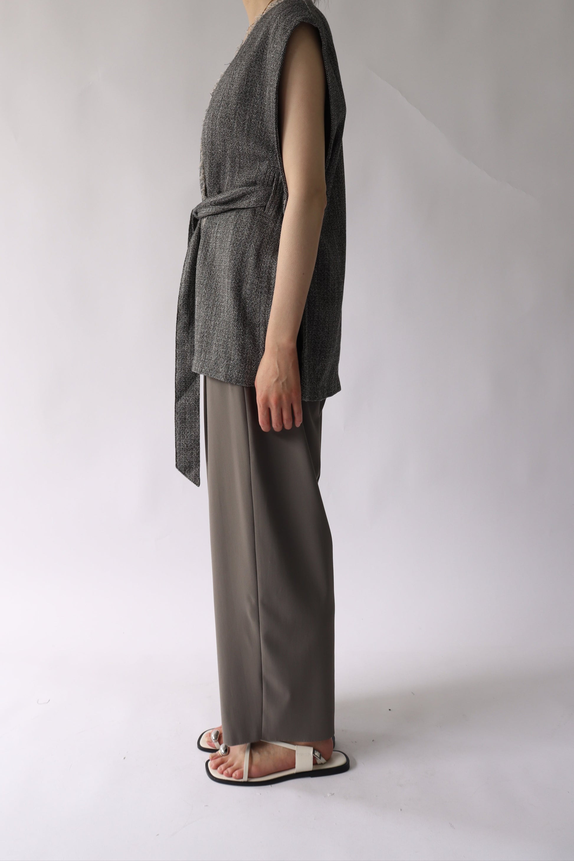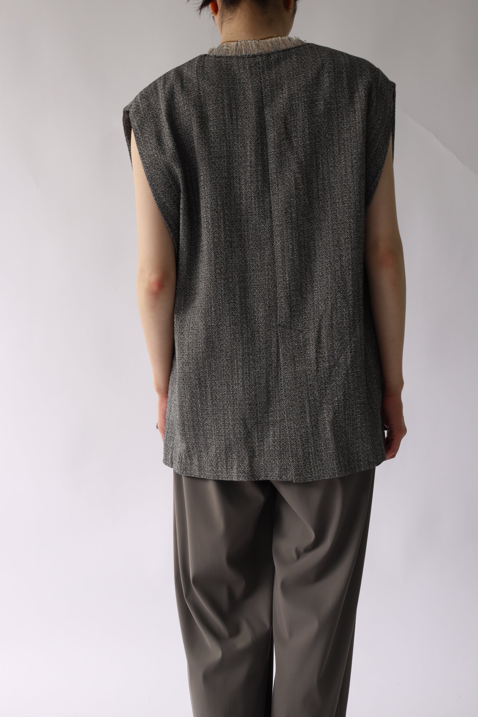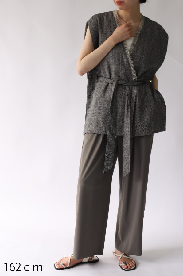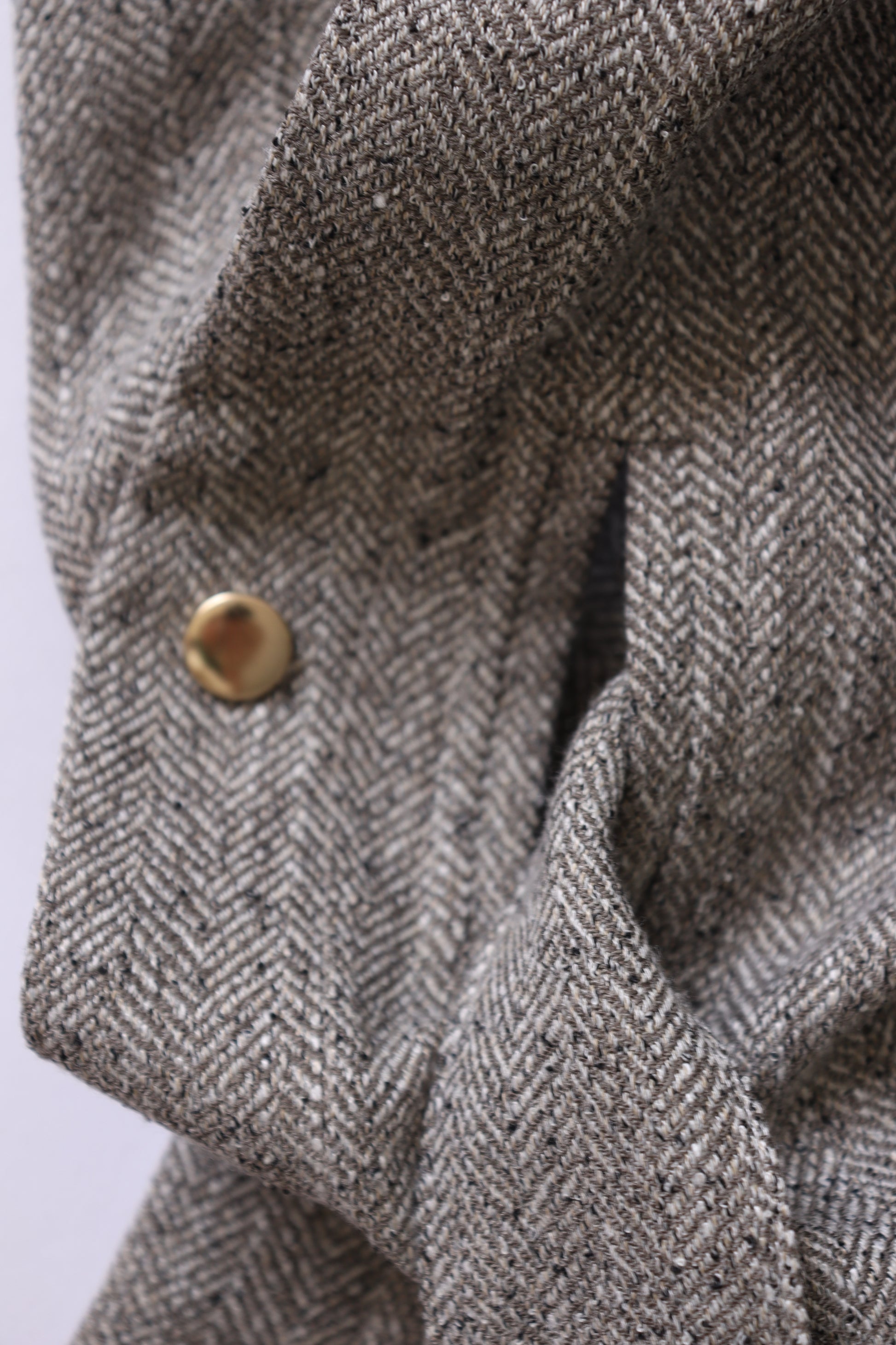 夏のコーデにプラスするだけでウール見えするヘリンボーン生地はAWの雰囲気を取り入れるのにぴったりの素材感。