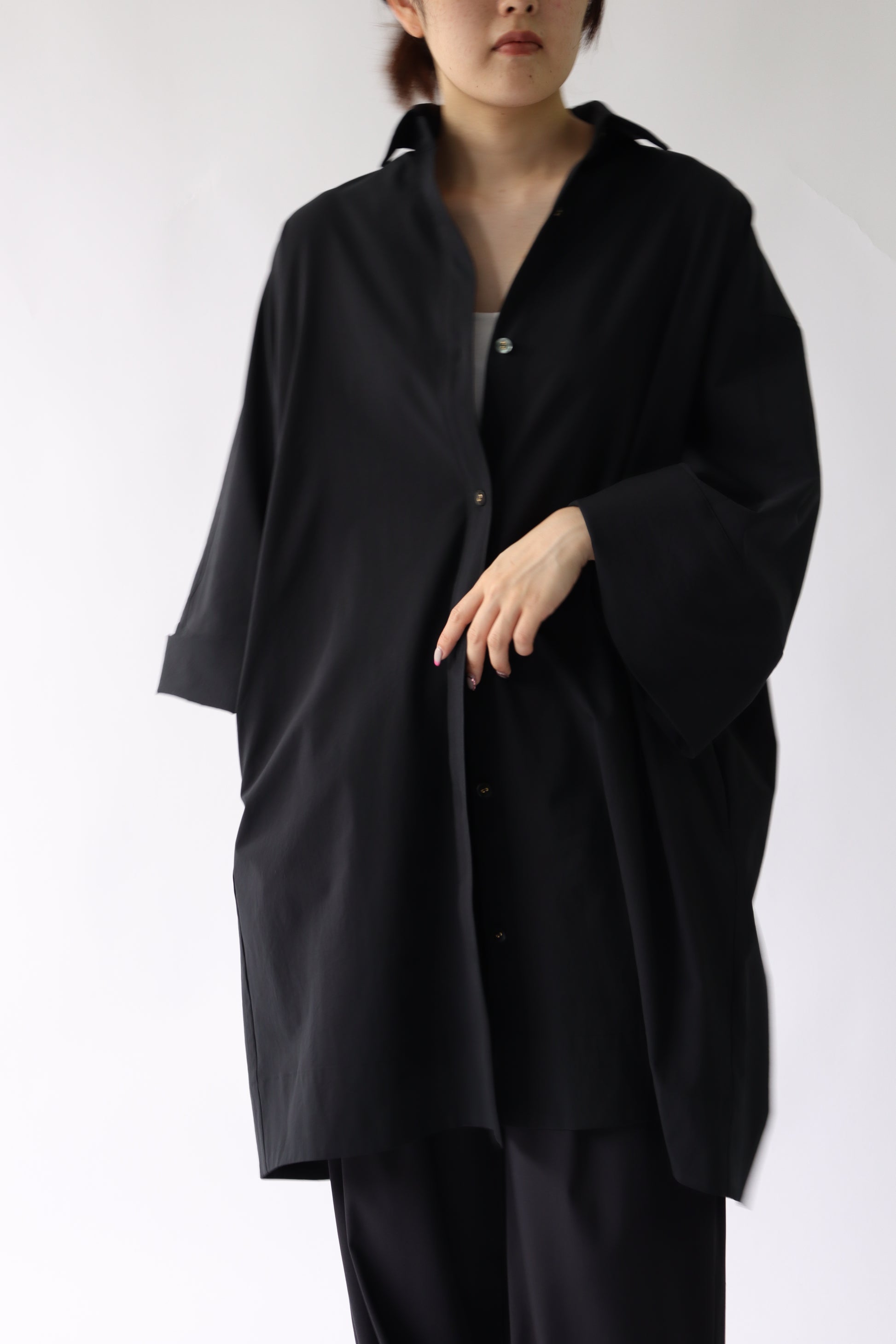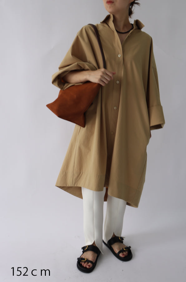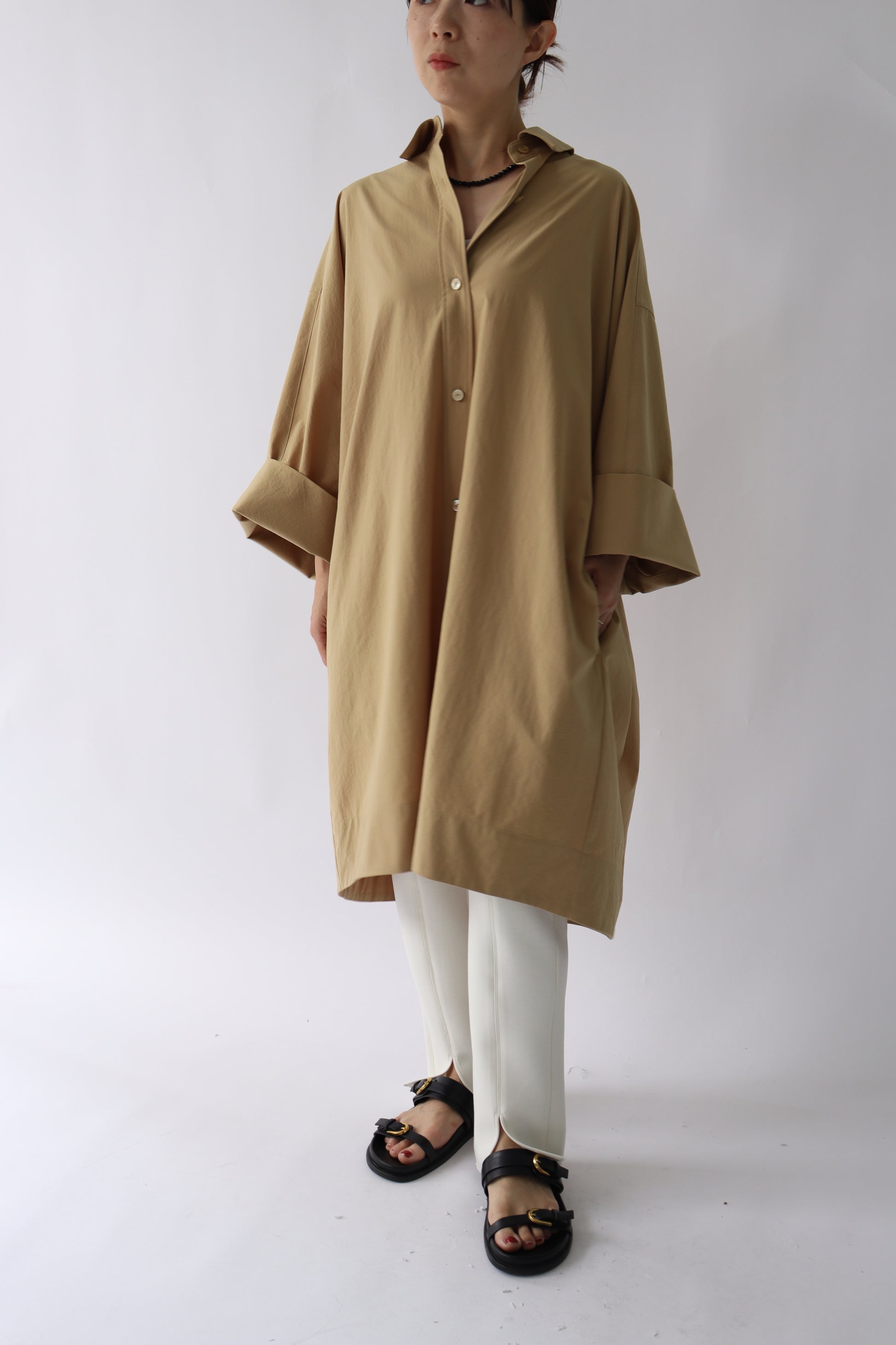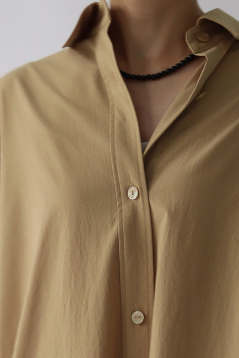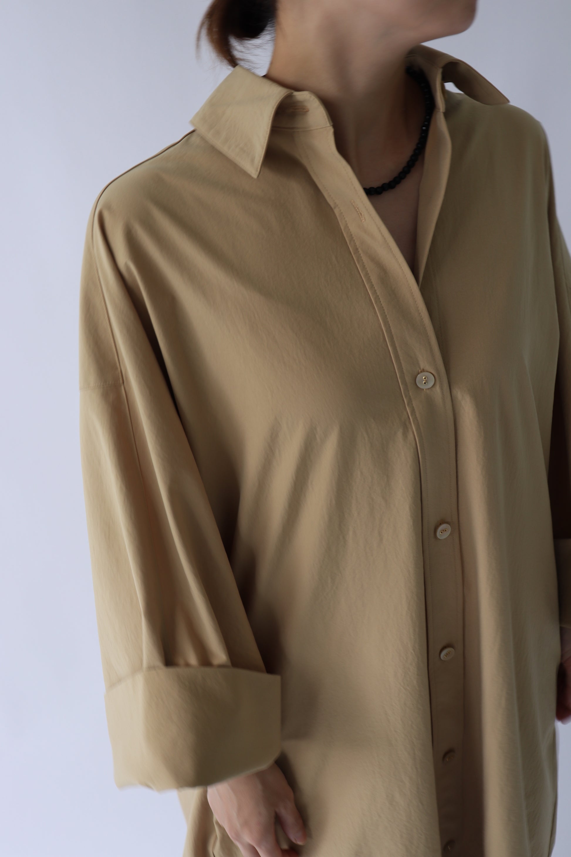 綿タッチなポリエステル素材は、アイロンいらずで絶妙な風合いが出るイージーケア素材。さらりとして肌離れがよく、ほどよくハリがあるのでゆったりとしたサイズ感でもラフになりすぎません。