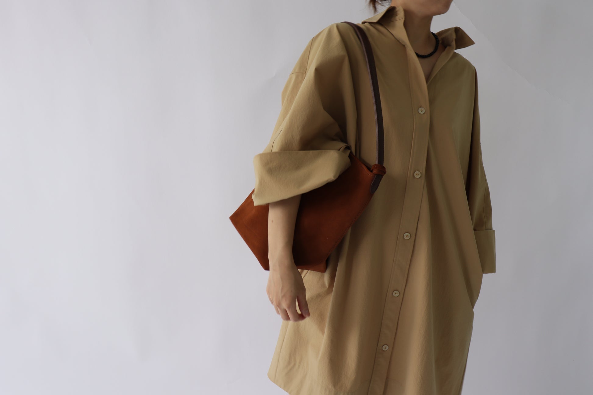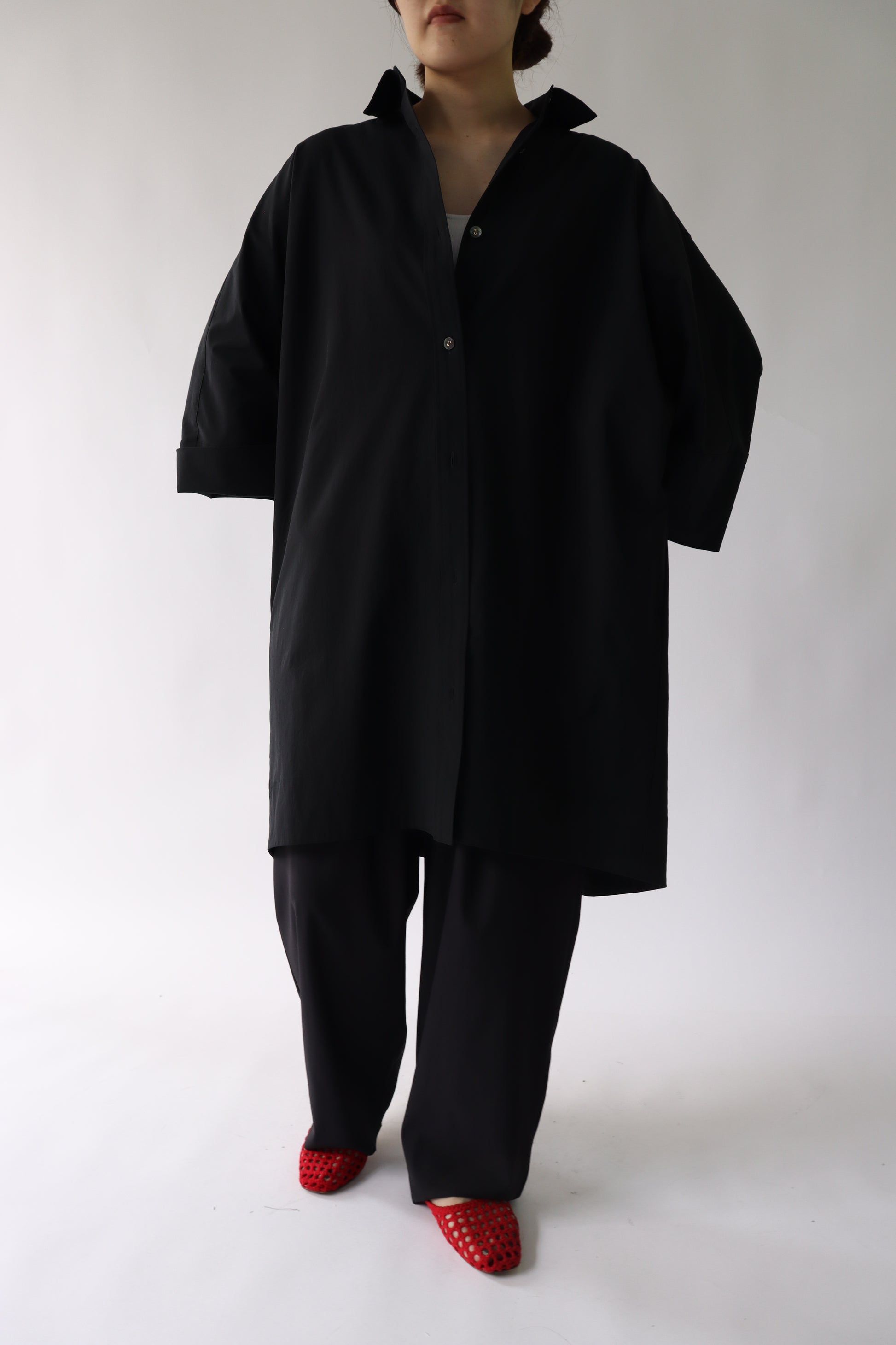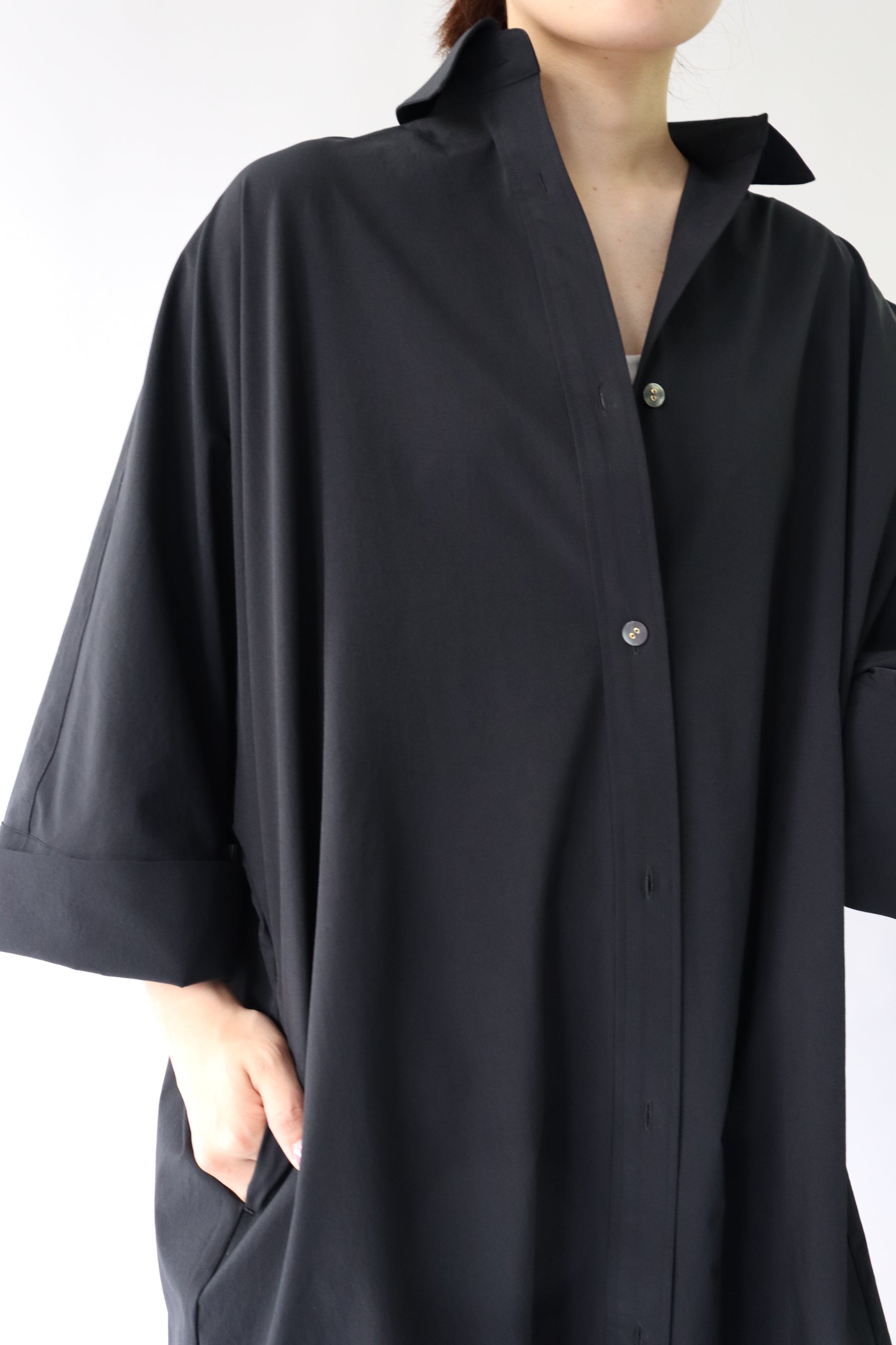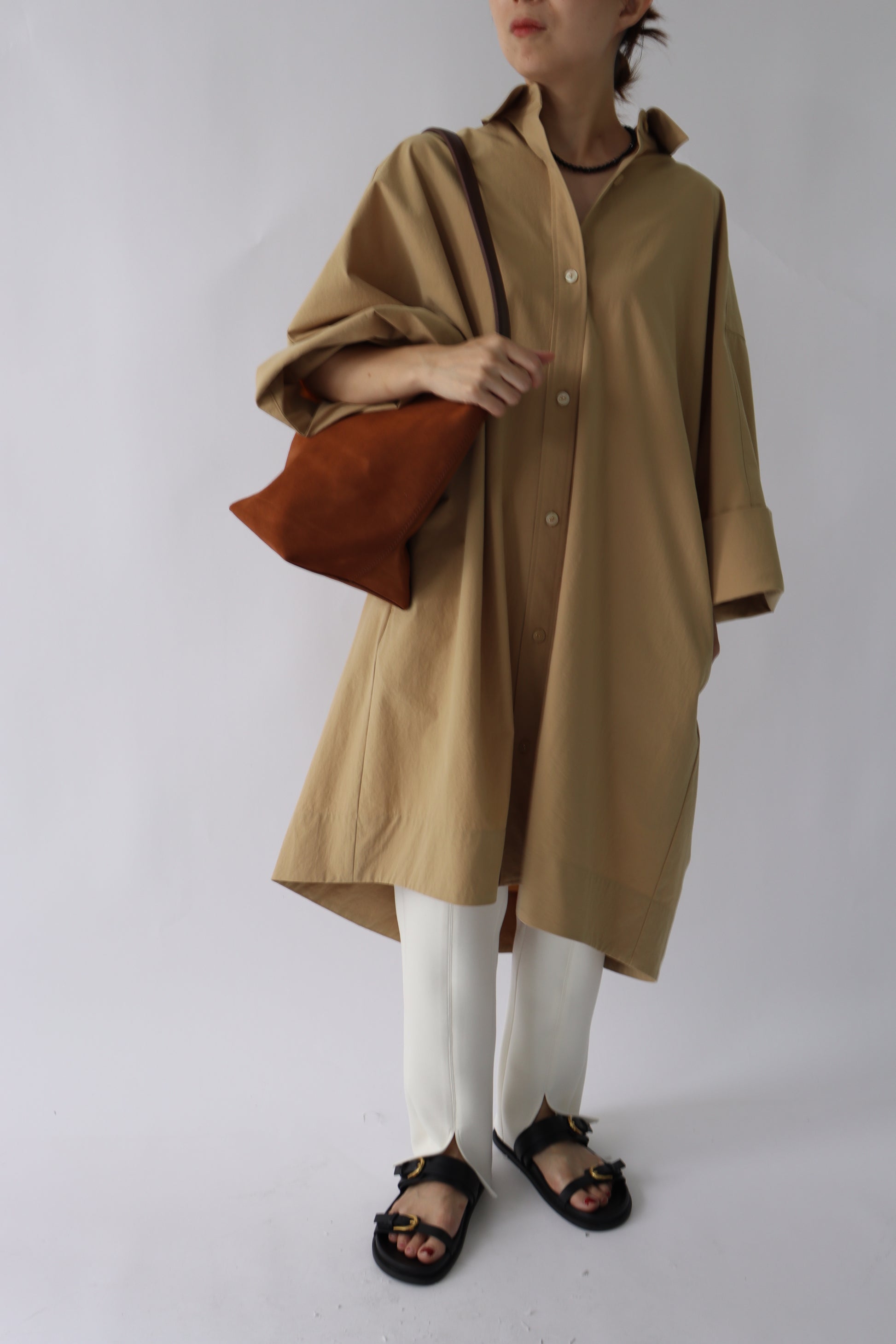 綿タッチなポリエステル素材は、アイロンいらずで絶妙な風合いが出るイージーケア素材。さらりとして肌離れがよく、ほどよくハリがあるのでゆったりとしたサイズ感でもラフになりすぎません。