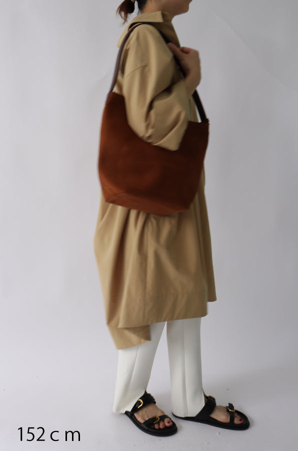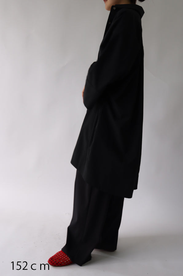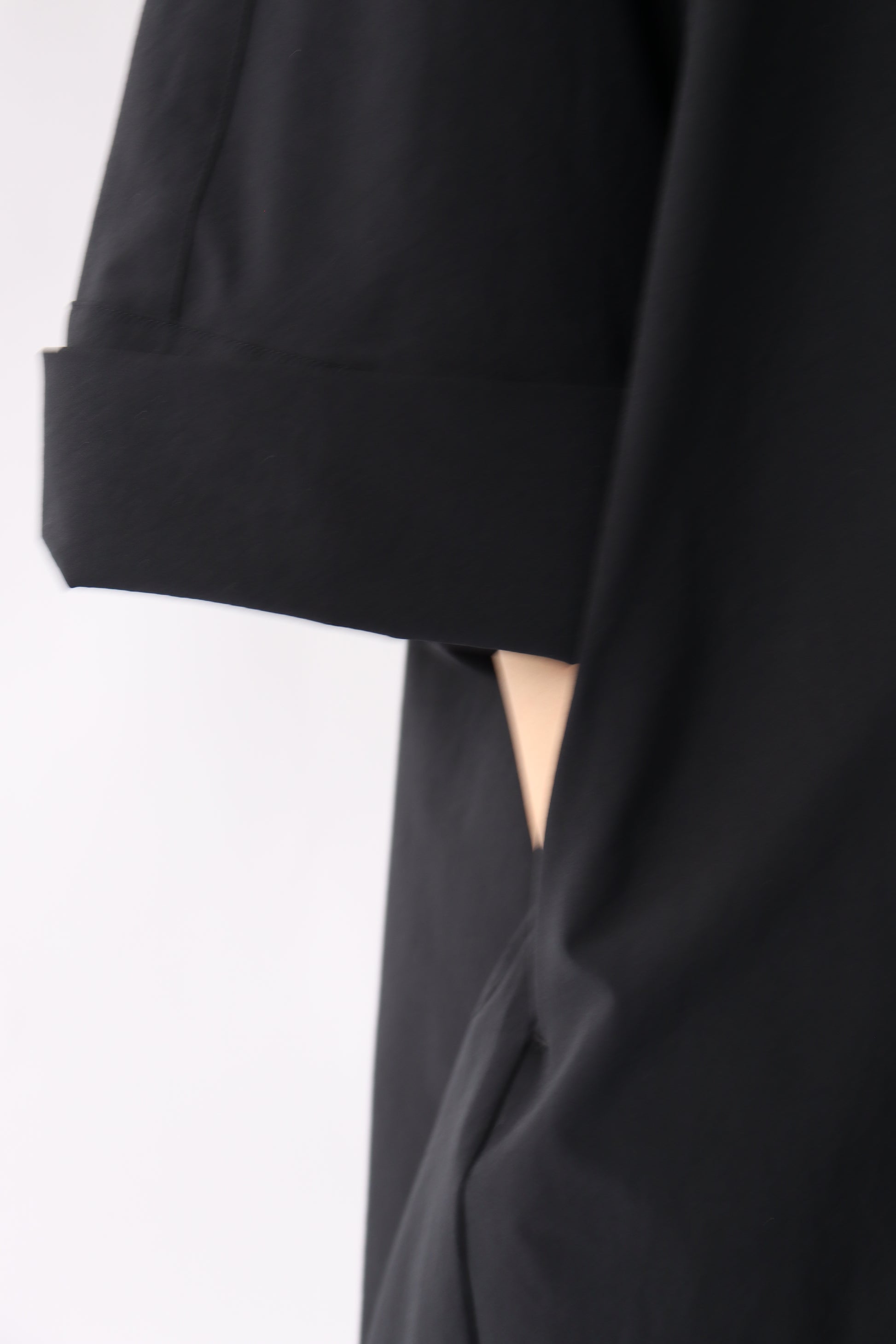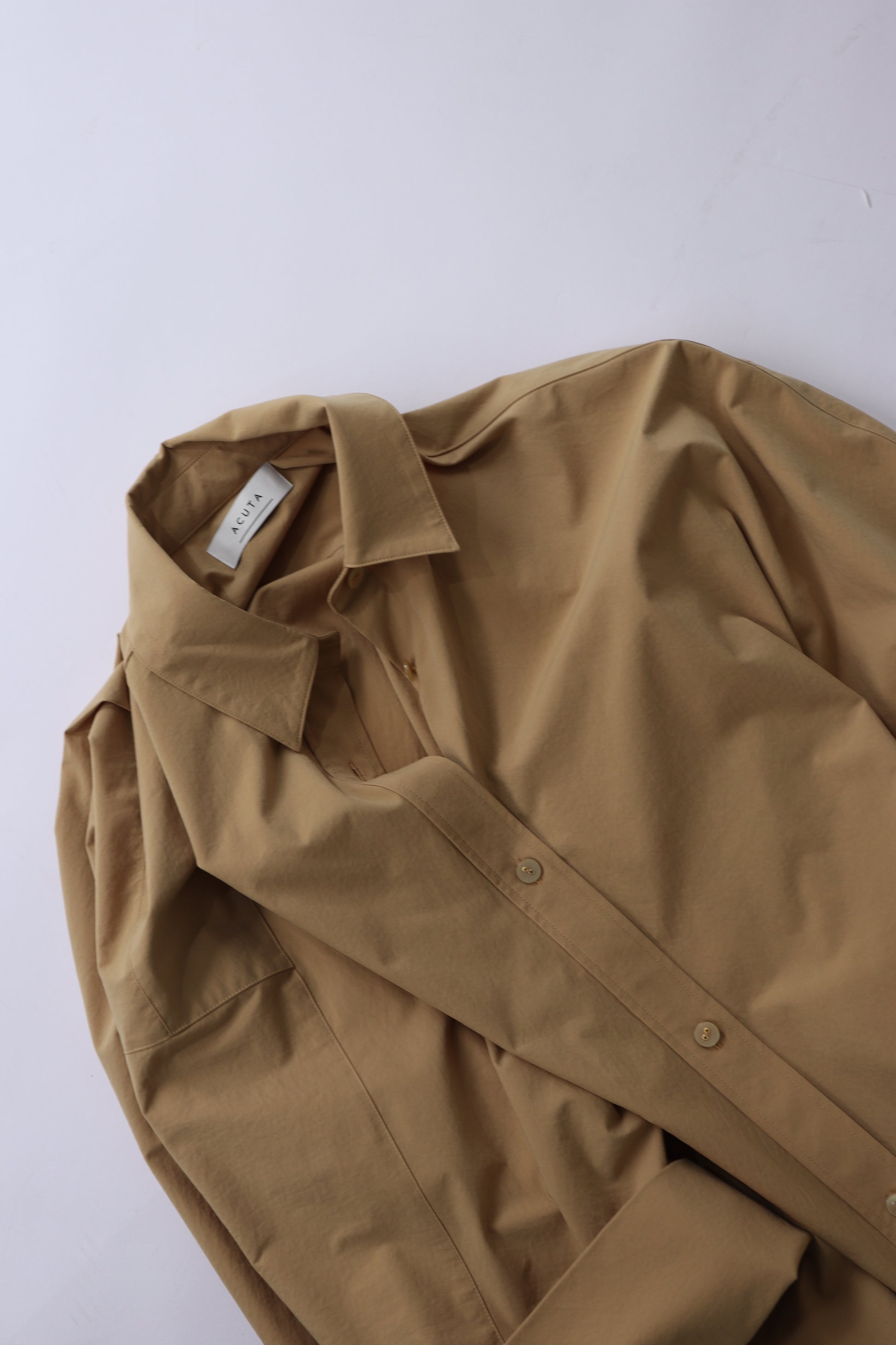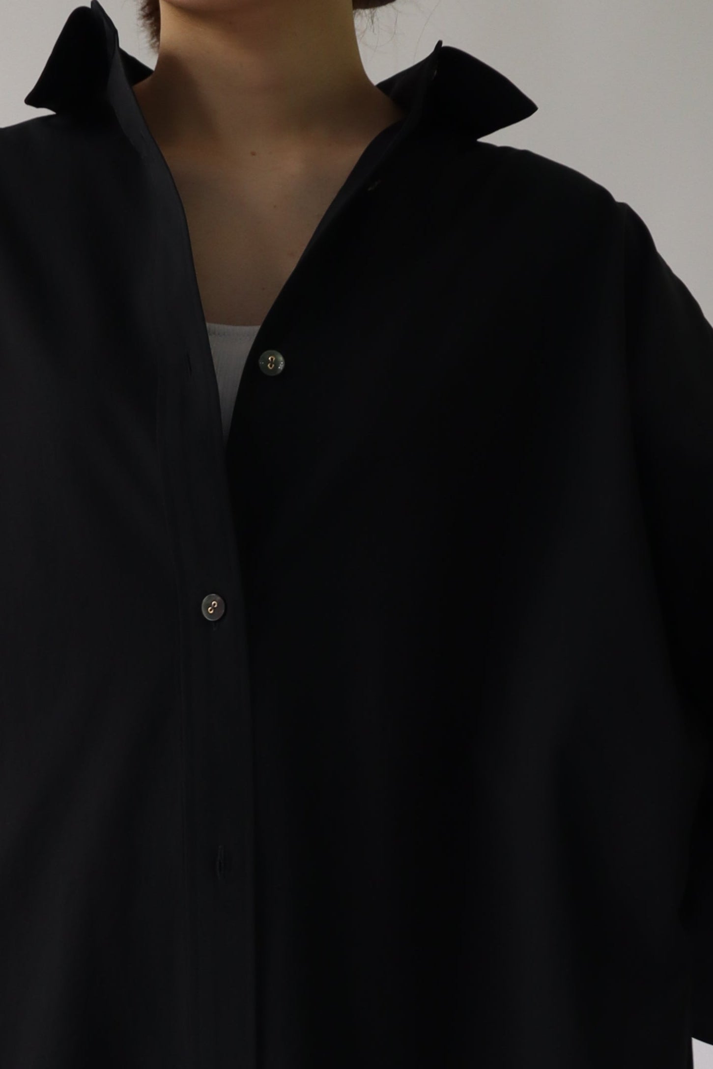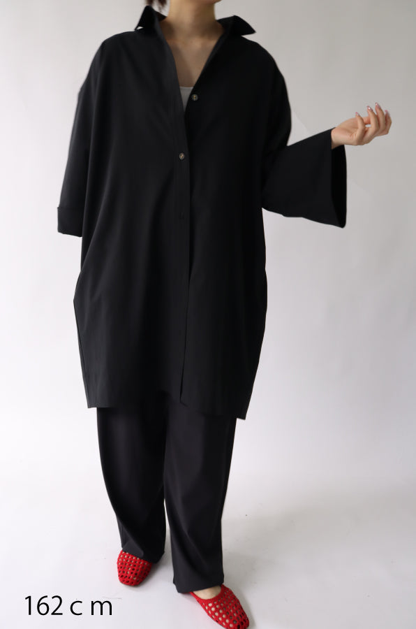 綿タッチなポリエステル素材は、アイロンいらずで絶妙な風合いが出るイージーケア素材。さらりとして肌離れがよく、ほどよくハリがあるのでゆったりとしたサイズ感でもラフになりすぎません。