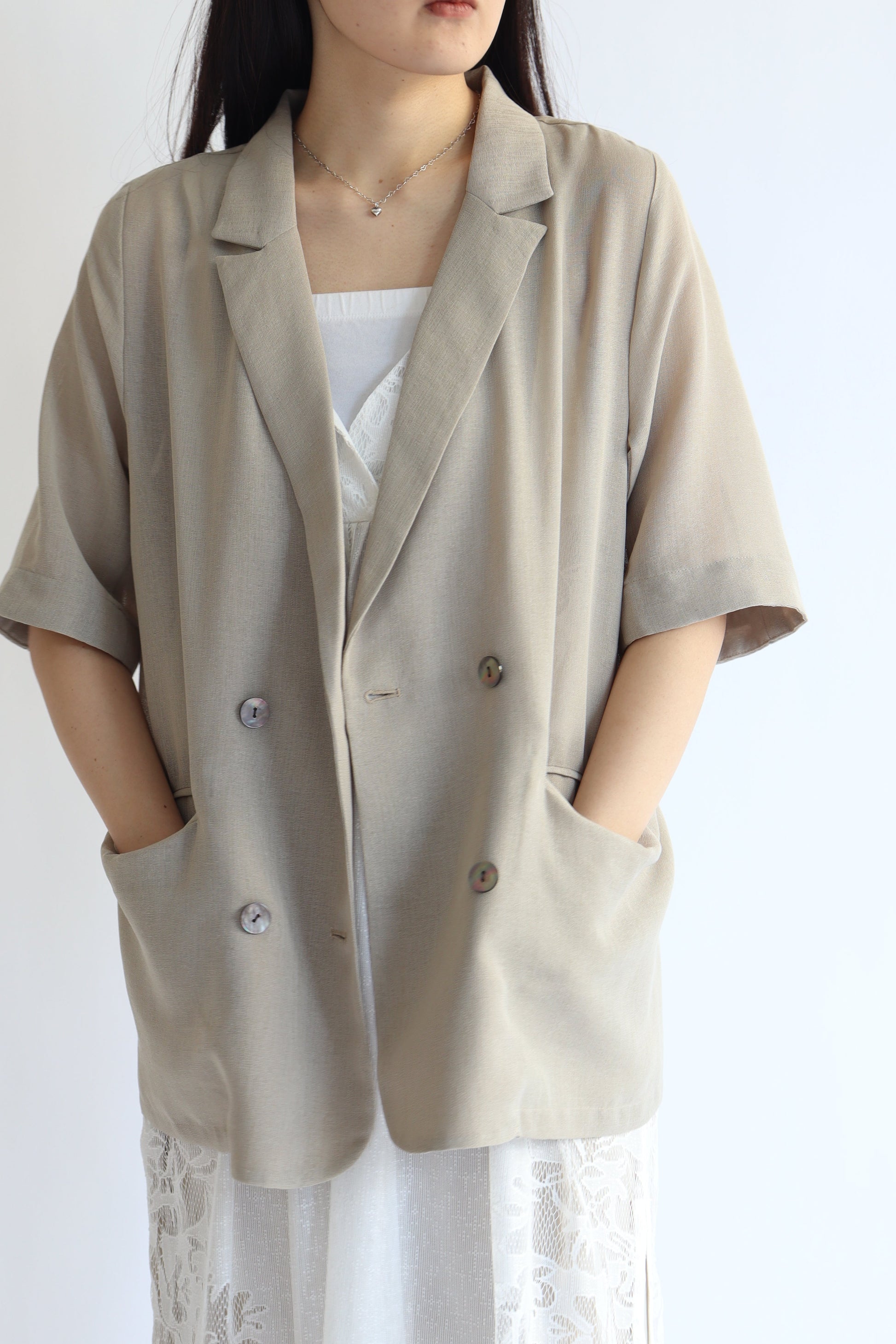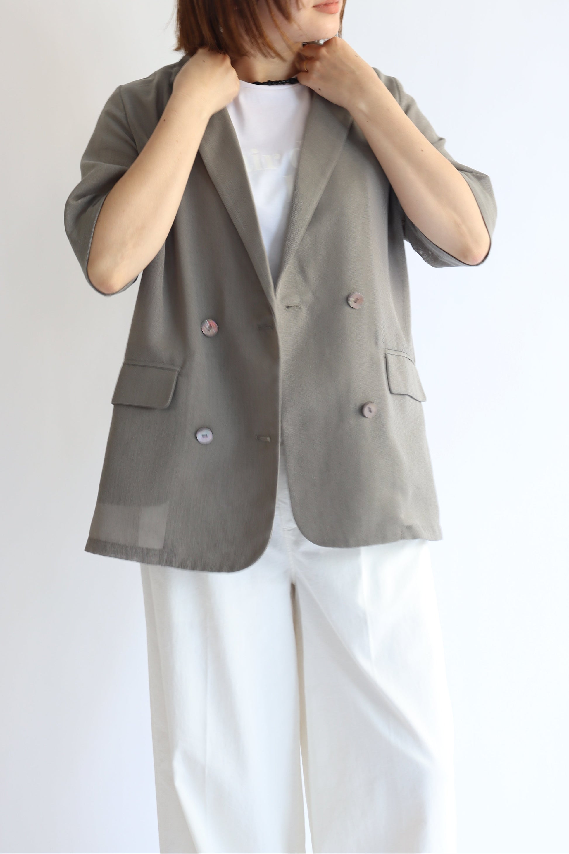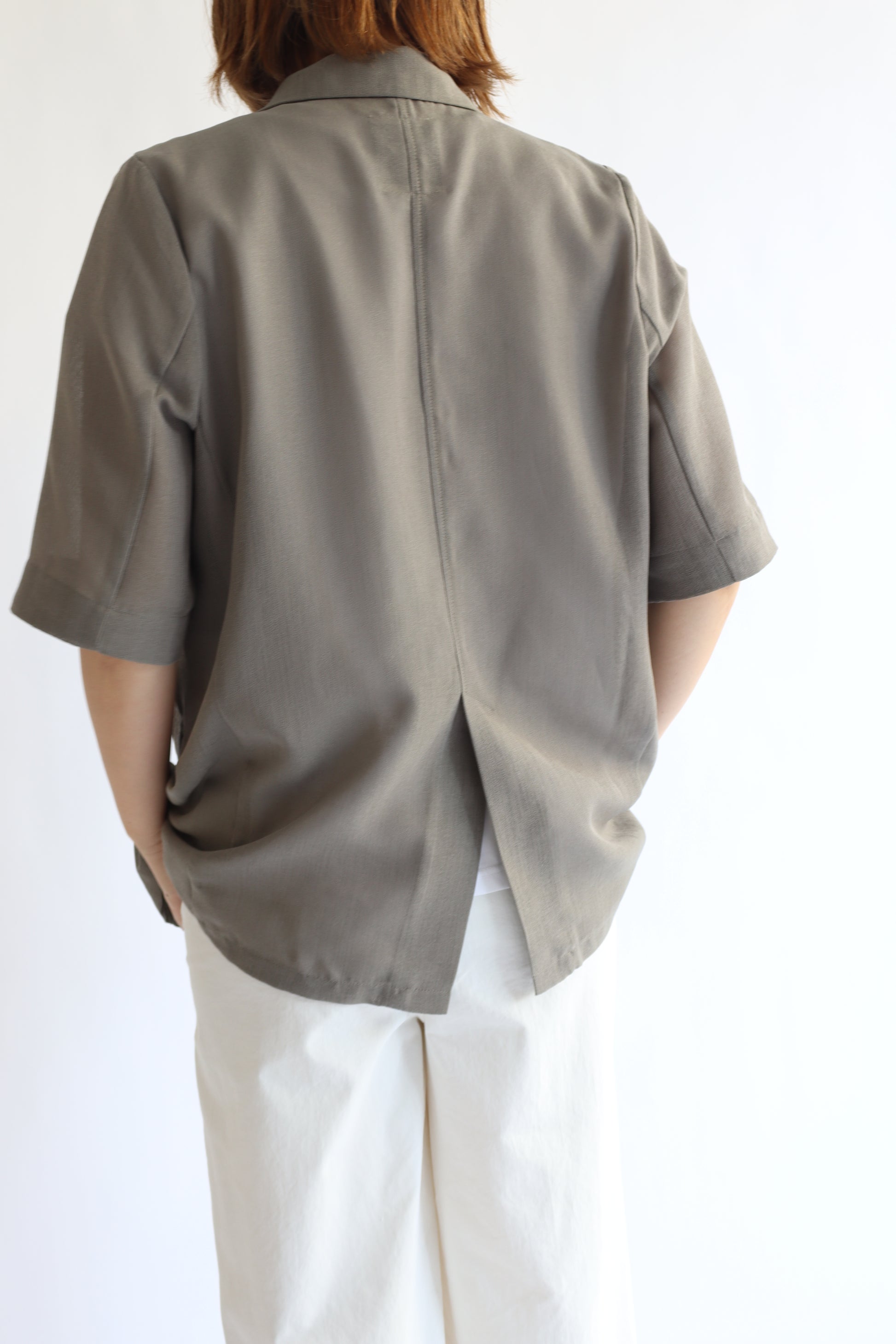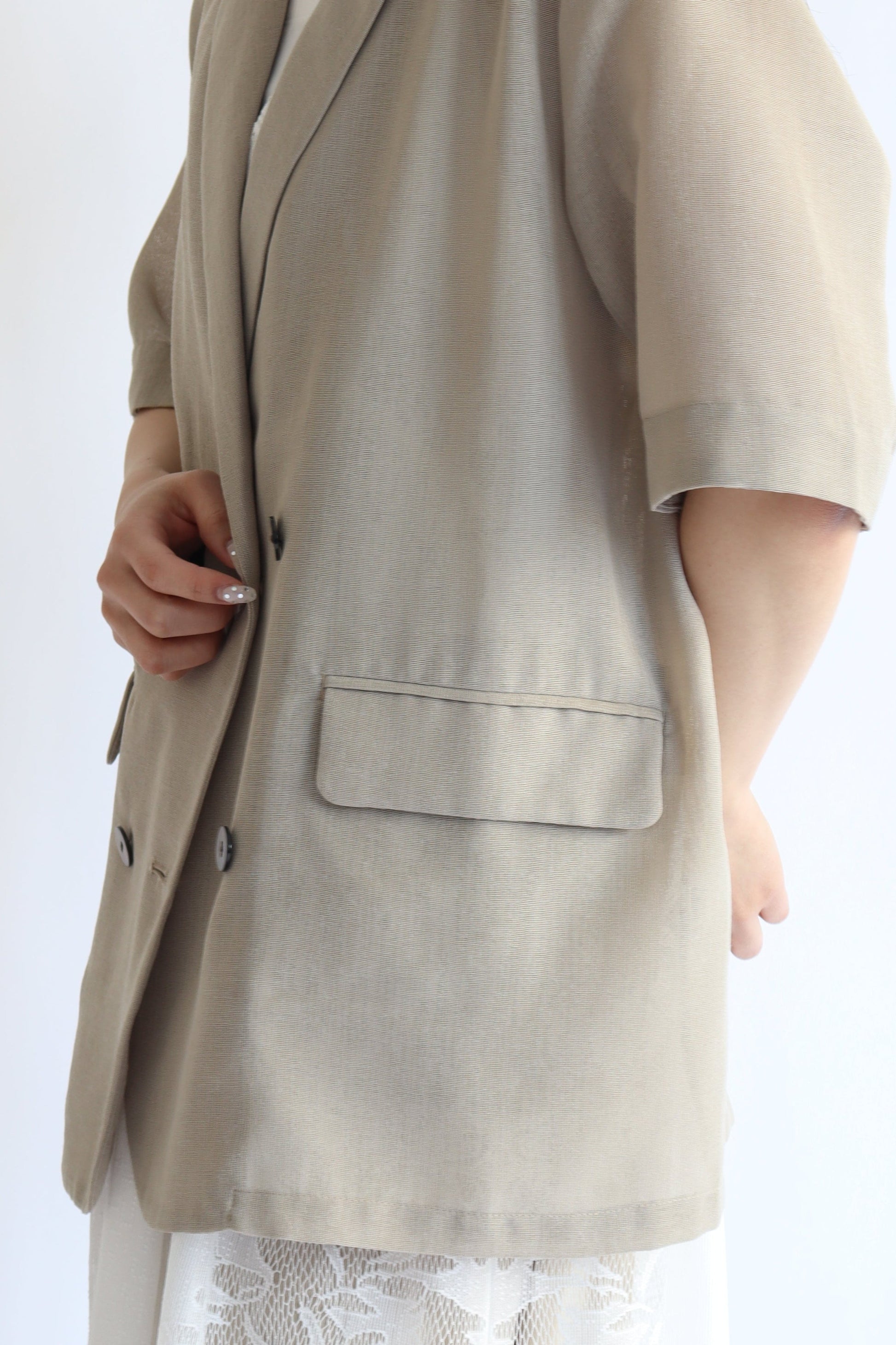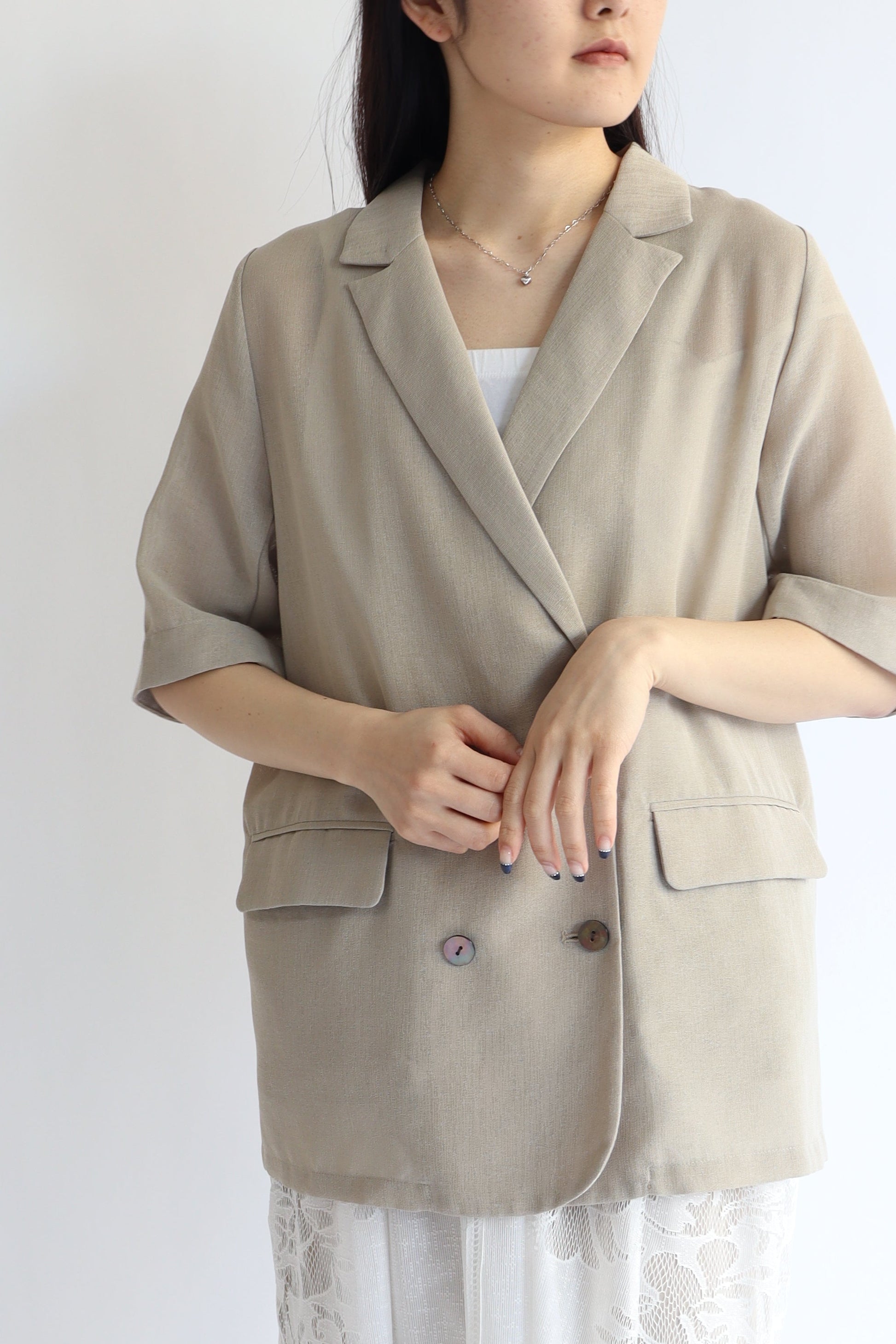 トレンド感のあるハーフスリーブジャケット。涼しげなシアーメッシュ素材で、程よいきちんと感が嬉しいアイテムです。ドライタッチな風合いなのでカジュアルダウンもしやすく、シャツ感覚でも着ていただけ、着こなしに幅が出せます。
