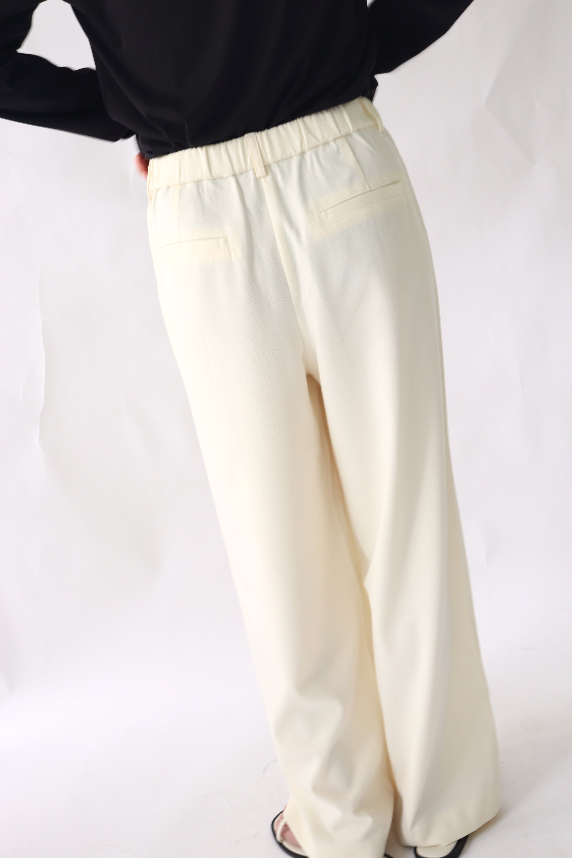 腰回りはすっきりで広がり過ぎないシルエットなので、どんなトップスにも合わせやすい1着。後ろウエストにゴムが入っているので、きちんと感がありながらも着心地は◎