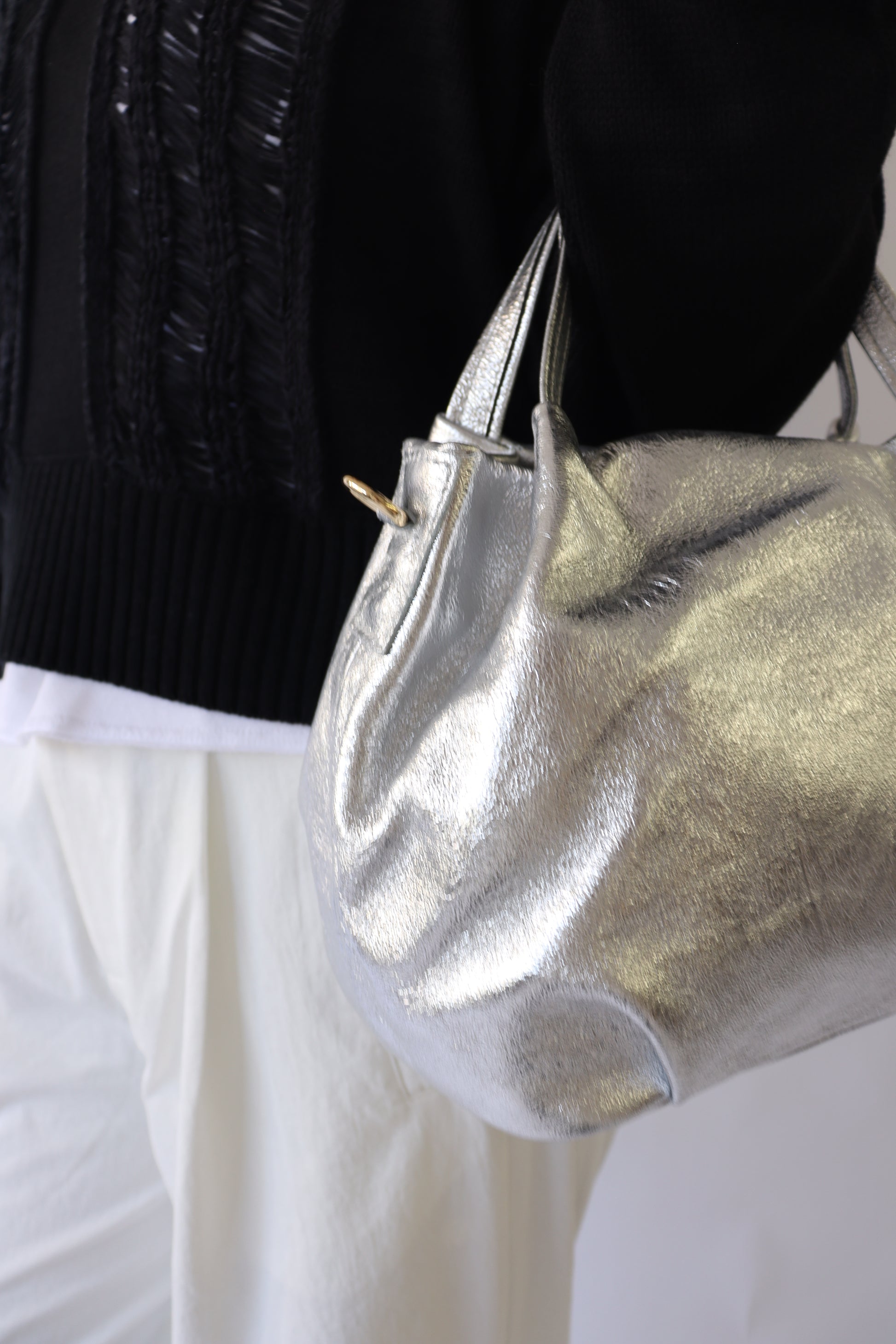 ころんとした丸みのあるフォルムとタックが立体的な形を際立たせたバッグ。ショルダーストラップで2WAY仕様が可能。マチ幅も広く、内外に取り付けたポケットが荷物を綺麗に納められ、機能性も◎。着脱できる付属のショルダーベルトで肩掛けのアレンジもお楽しみいただけます。